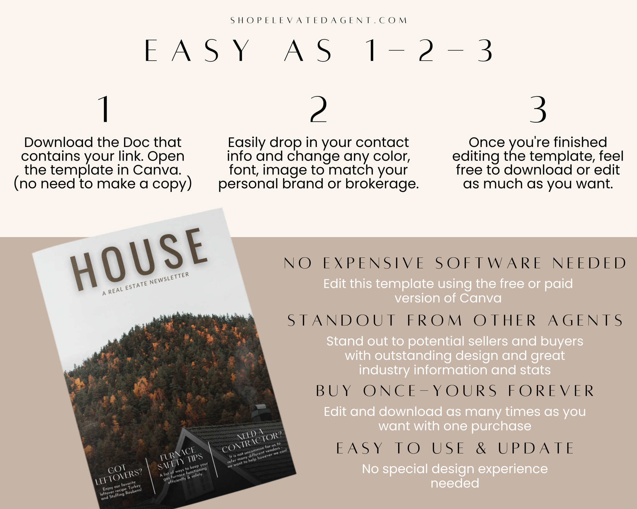 Attention Real Estate Agents! Keep your real estate marketing fresh and updated with this easy-to-use Realtor Canva Template designed by Elevated Agent. We stay on top of real estate marketing trends and produce new content daily.