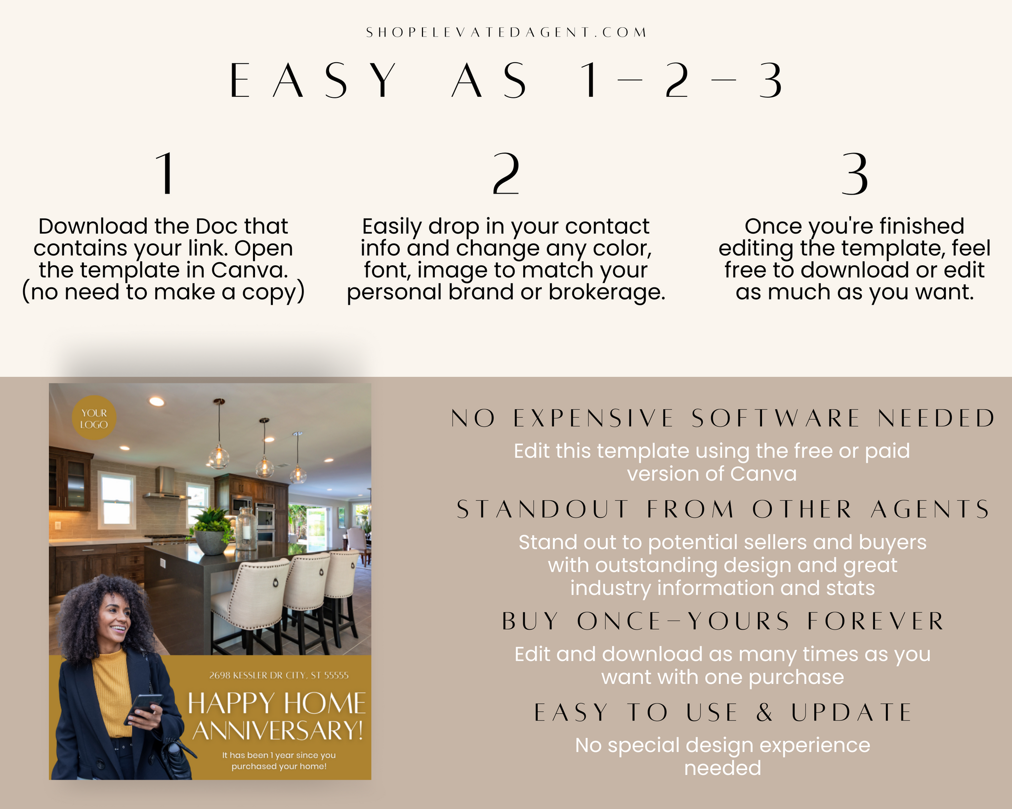 Attention Real Estate Agents! Keep your real estate marketing fresh and updated with this easy-to-use Realtor Canva Template designed by Elevated Agent. We stay on top of real estate marketing trends and produce new content daily.