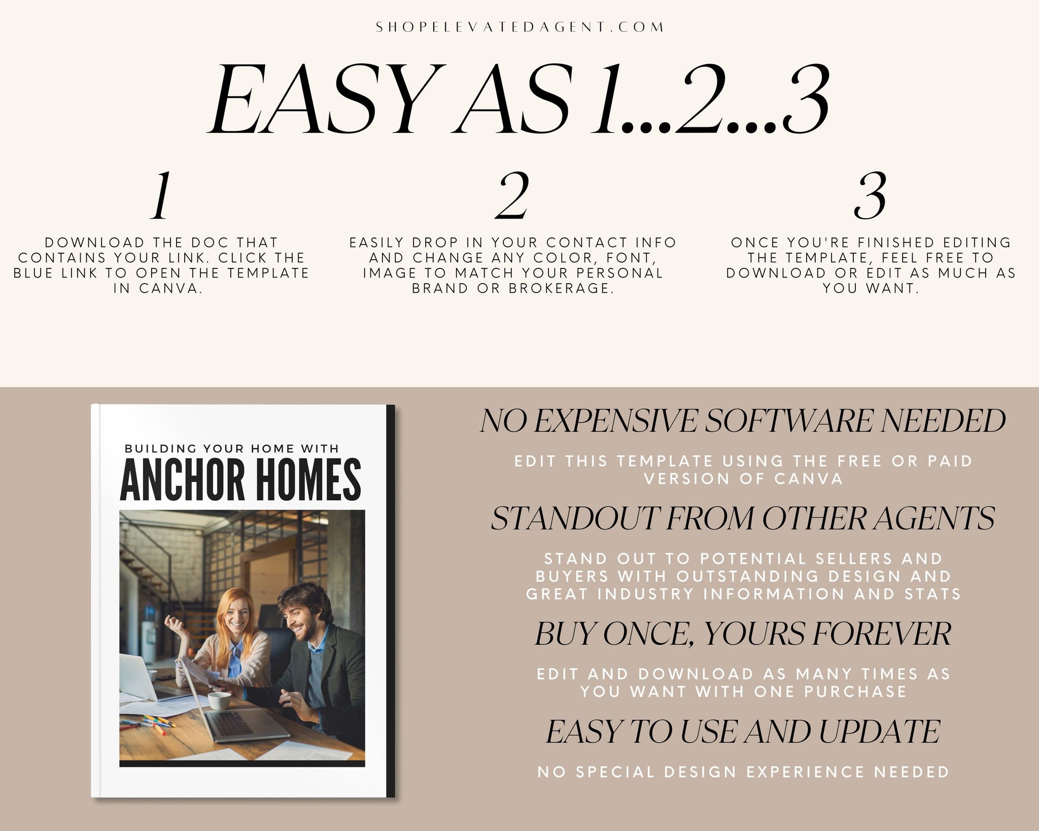 With a customizable design and your own personal touch, this Home Builder Guide Real Estate Template Minimal Brand Style gets you directly in front of your buyers as an authority on the construction process and transaction.