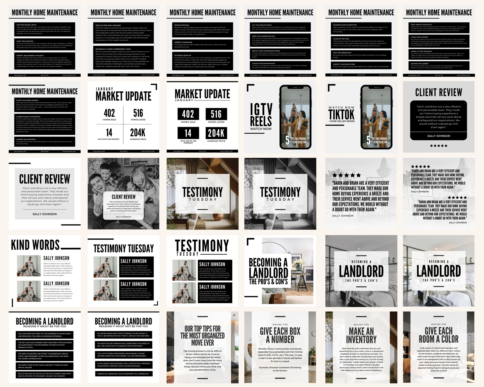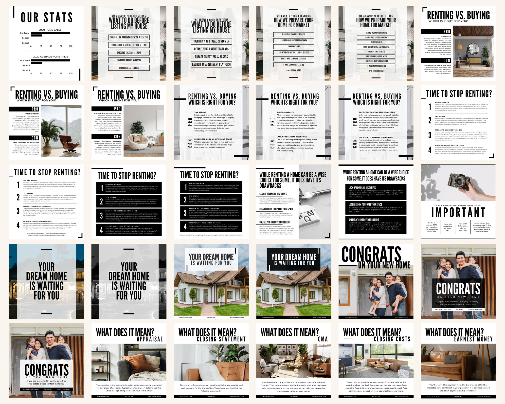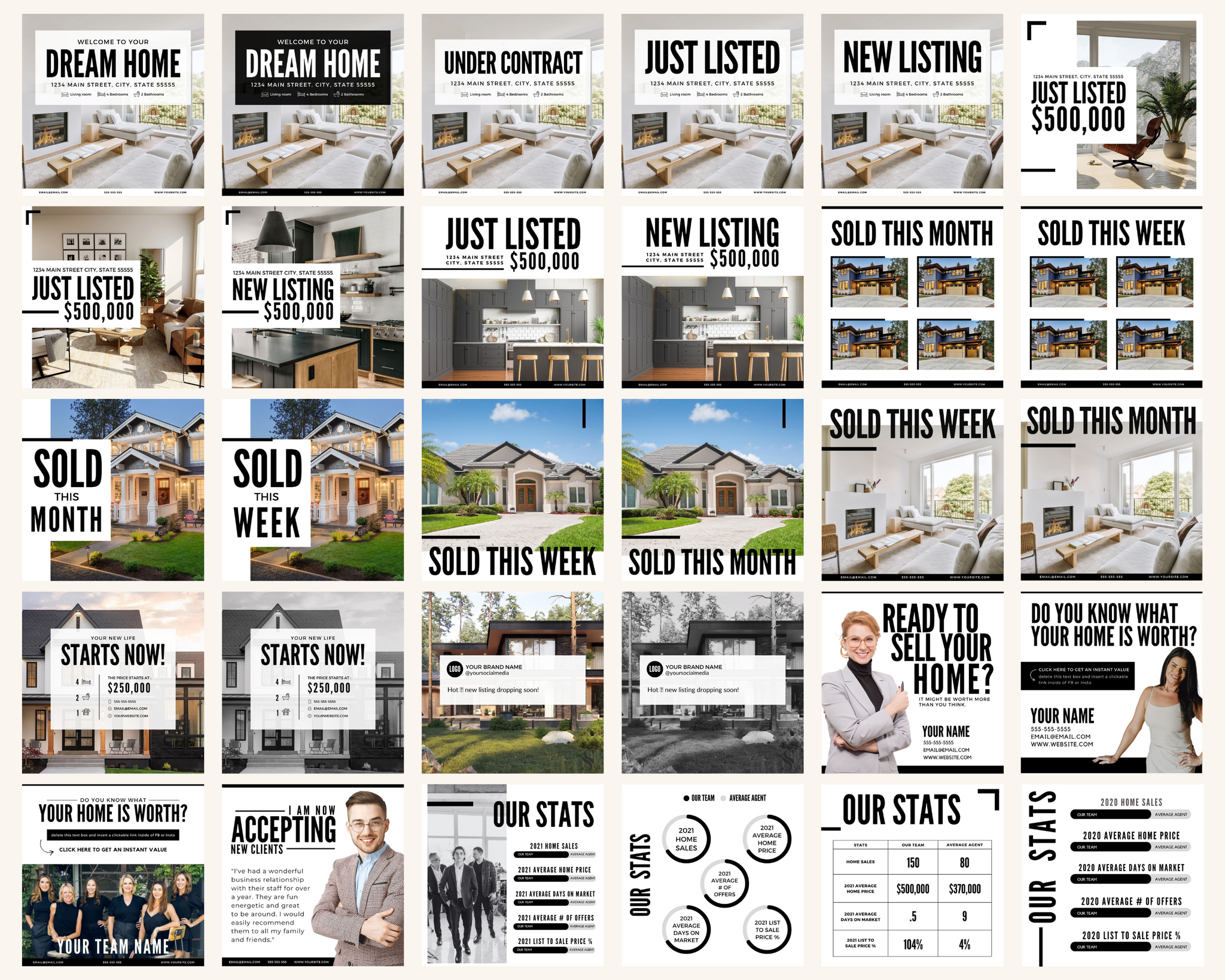 As professional real estate agents, we understand that consistency in your real estate marketing is crucial to your business. These easy-to-edit real estate social media templates all coordinate to make sharing to your social media channels a breeze.