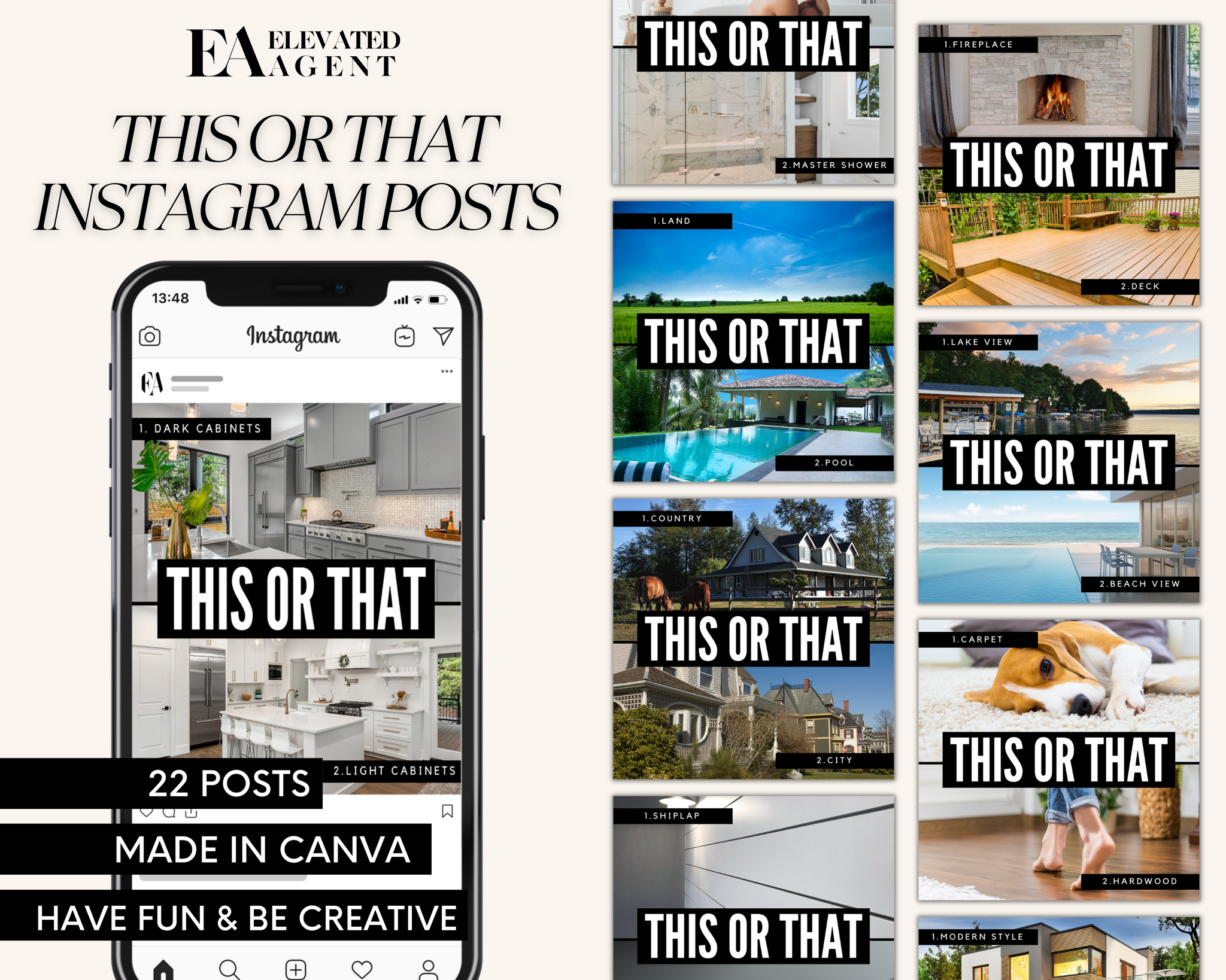 Elevate your Real Estate Marketing with these "This or That" Social Media Real Estate Templates today.