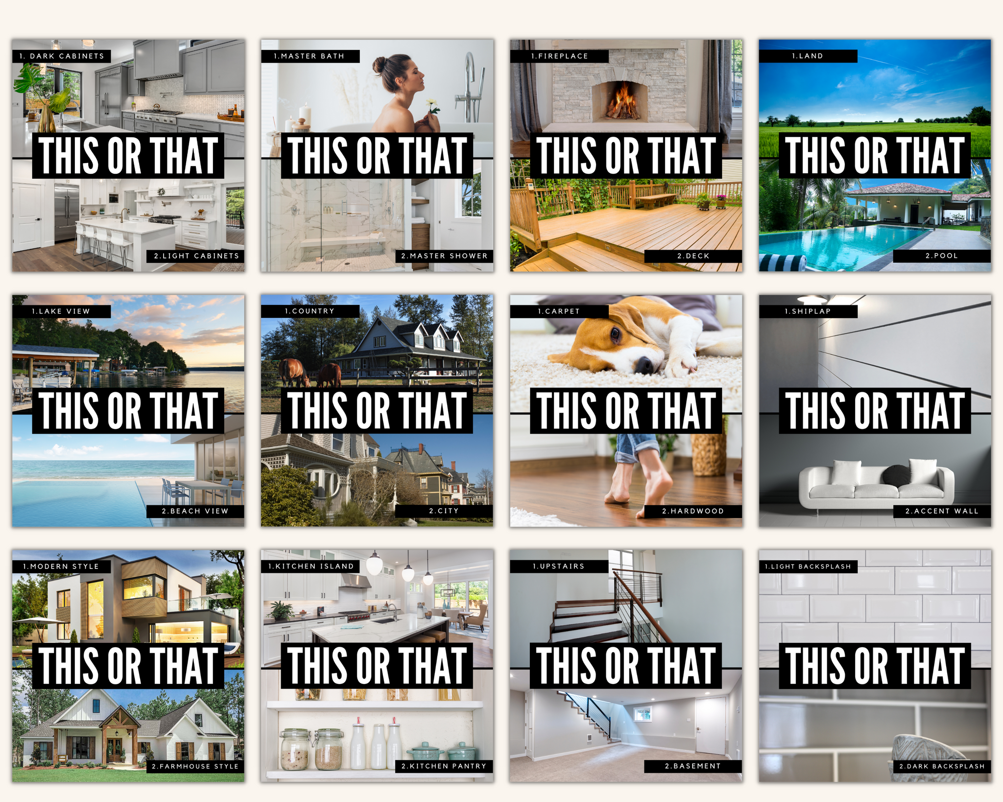 Attention Real Estate Agents! Use these "This or That" Social Media Real Estate Templates to encourage engagement on your real estate social media accounts. They are a fun way to engage with your audience and start conversations with potential clients.