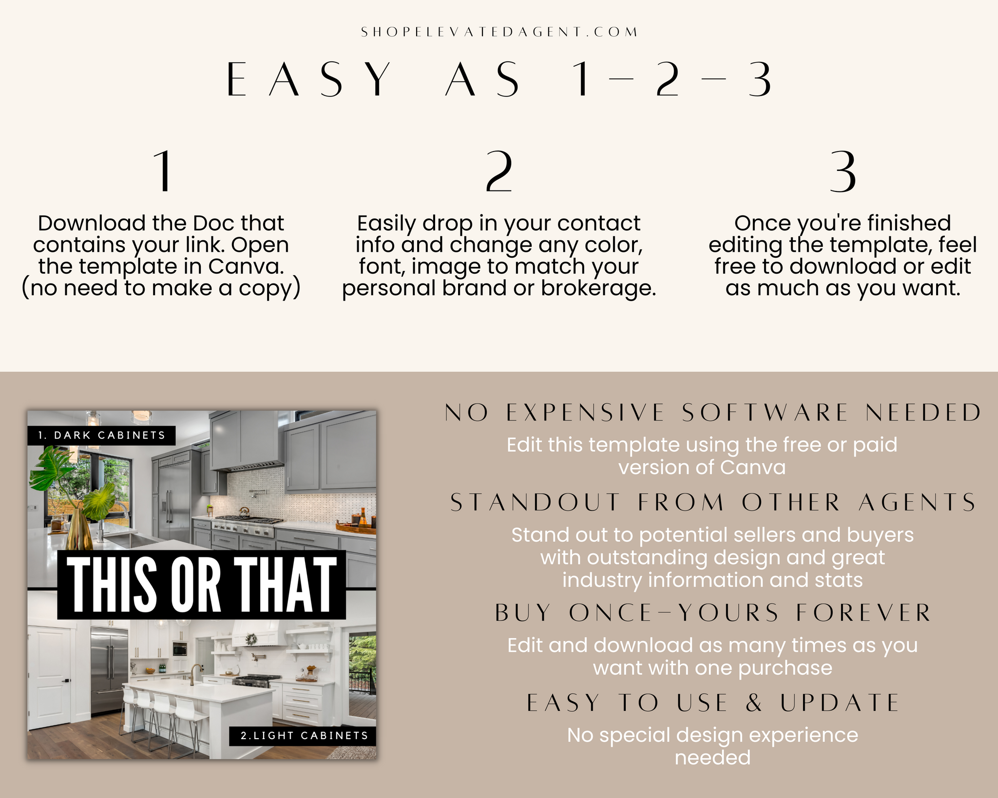 These "This or That" Social Media Real Estate Templates can be edited to include the image of your property, your logo, brand colors, etc. You can share these square graphics on social media (Instagram and Facebook) as a feed post.