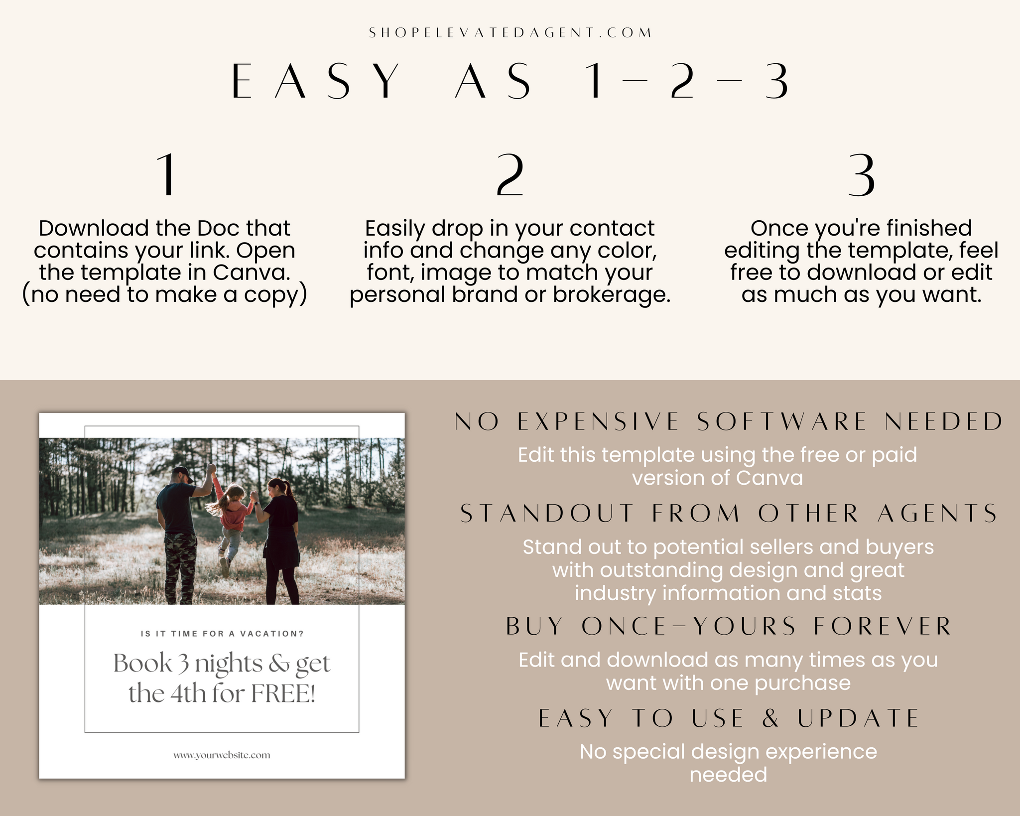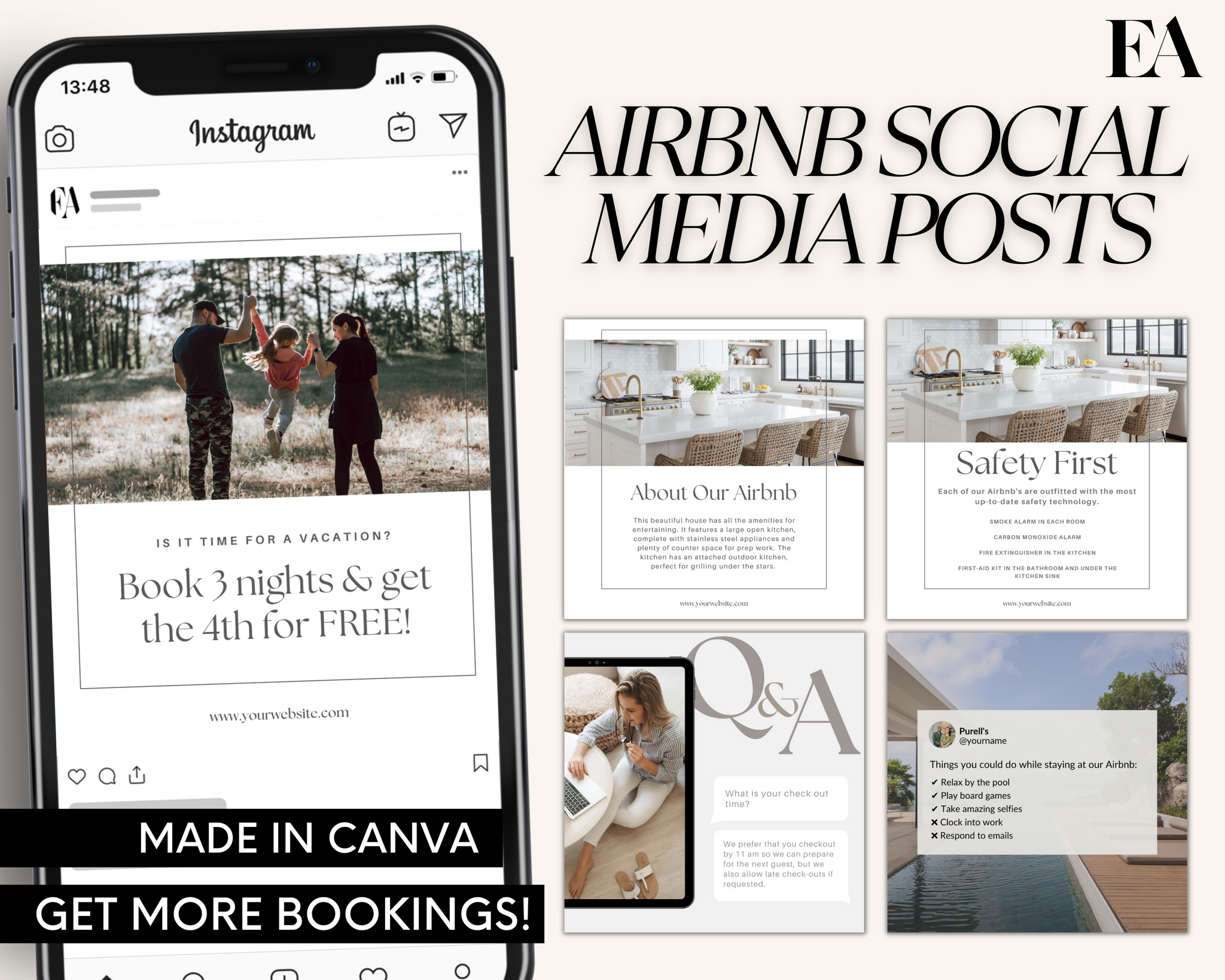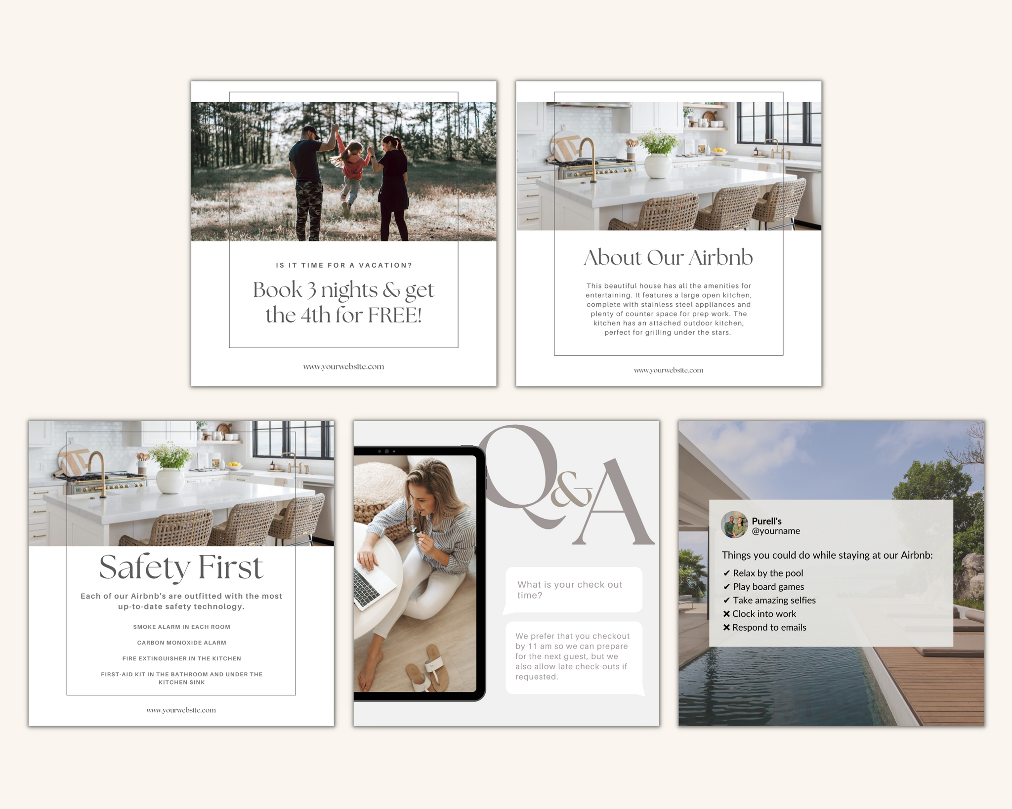 Attention professional Airbnb or VRBO hosts! Use this Real Estate Template – Peaceful Airbnb Social Media Posts 5 to promote an Airbnb short term rental property on social media. Take the guesswork out of what to post every day and use these easy-to-edit templates to promote your property.