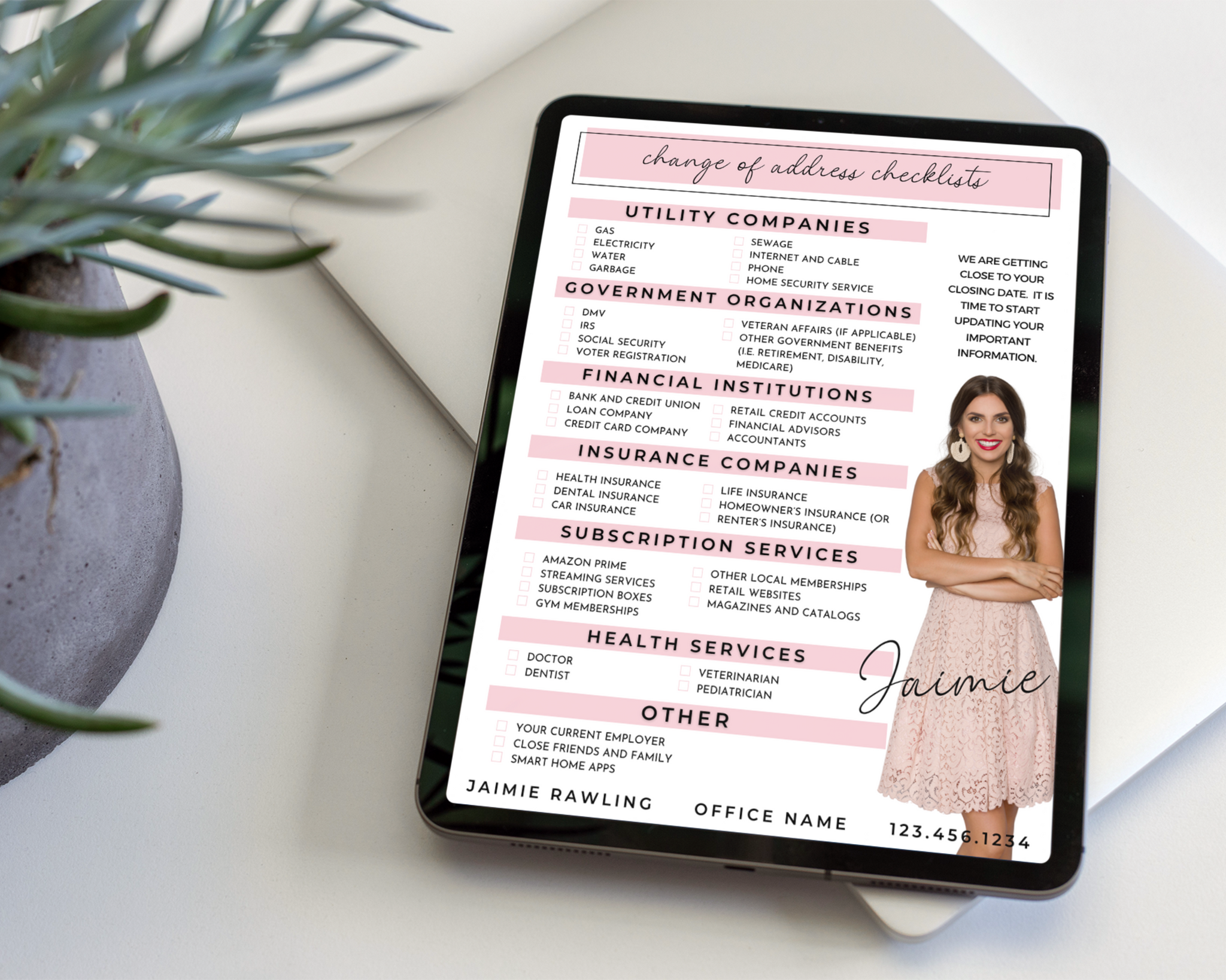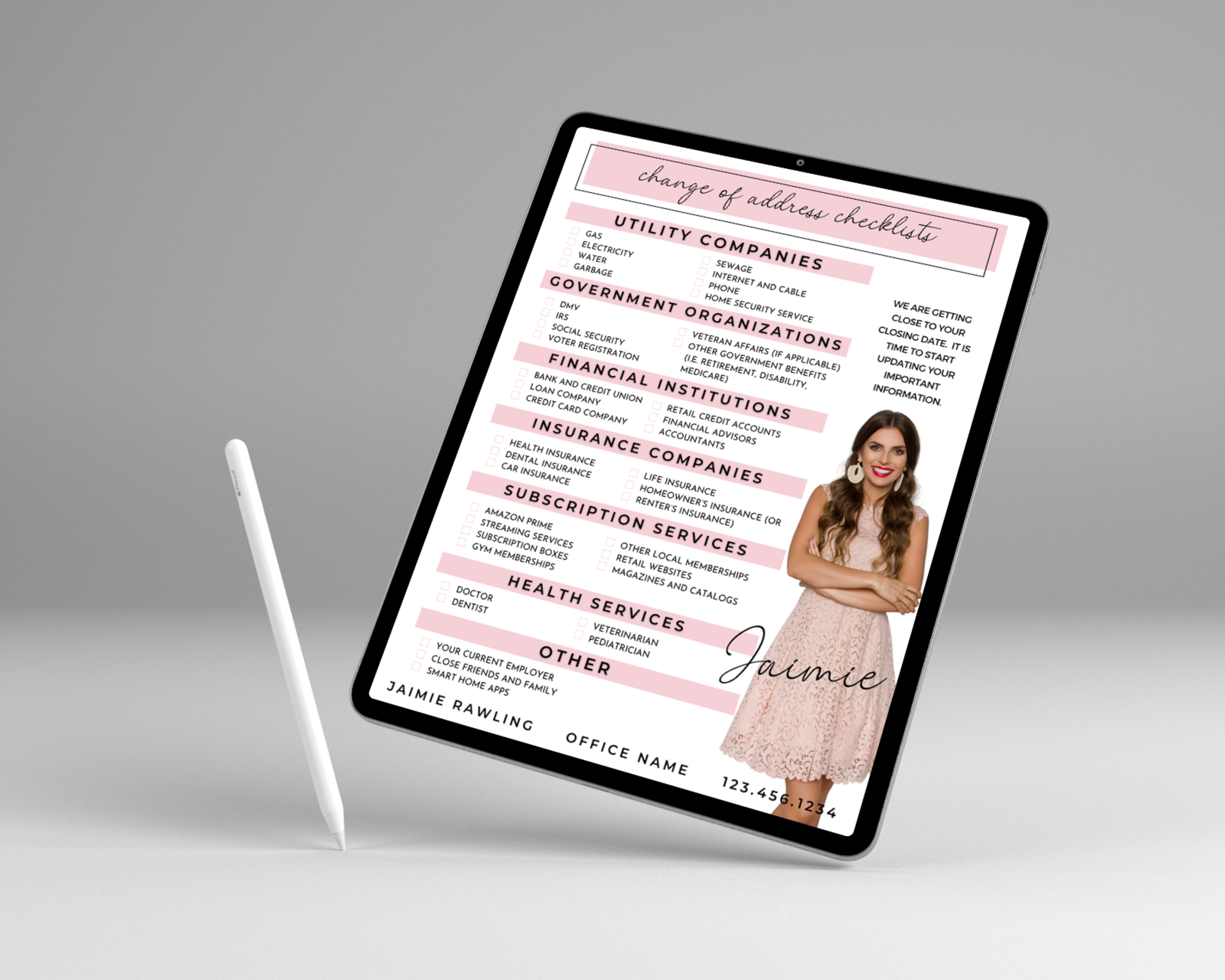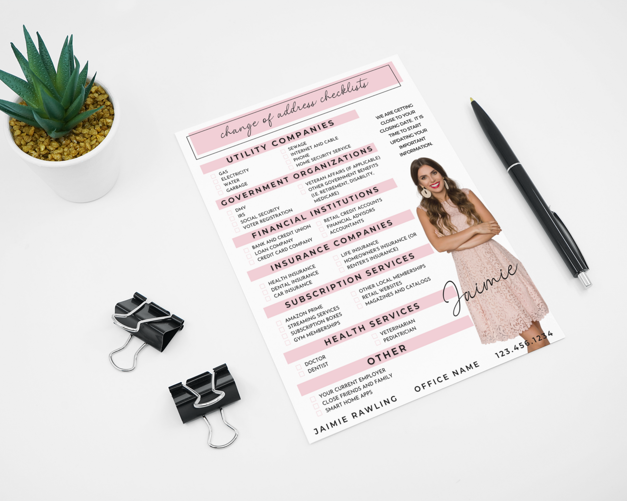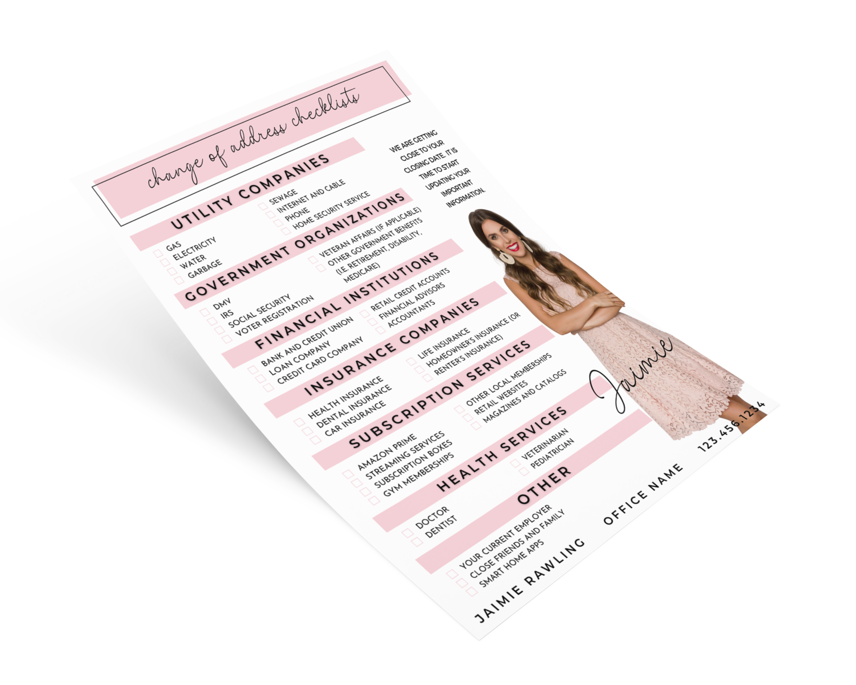 The checklist also serves as a Home Buyer New Address Card, providing a tangible, user-friendly resource for your clients. Coupled with your Moving Checklist, it forms a cohesive, comprehensive package that effectively highlights your expertise