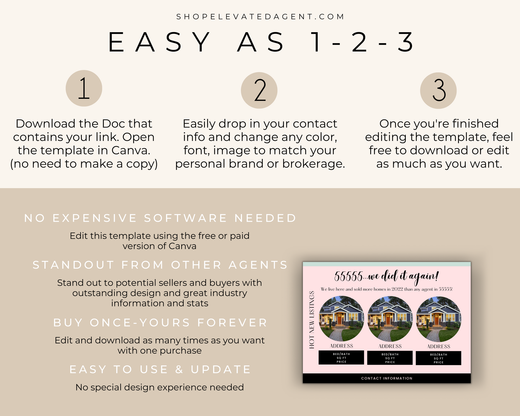 Keep your real estate marketing fresh and updated with this easy-to-use Real Estate Template in Canva designed by Elevated Agent. We stay on top of real estate marketing trends and produce new content daily.