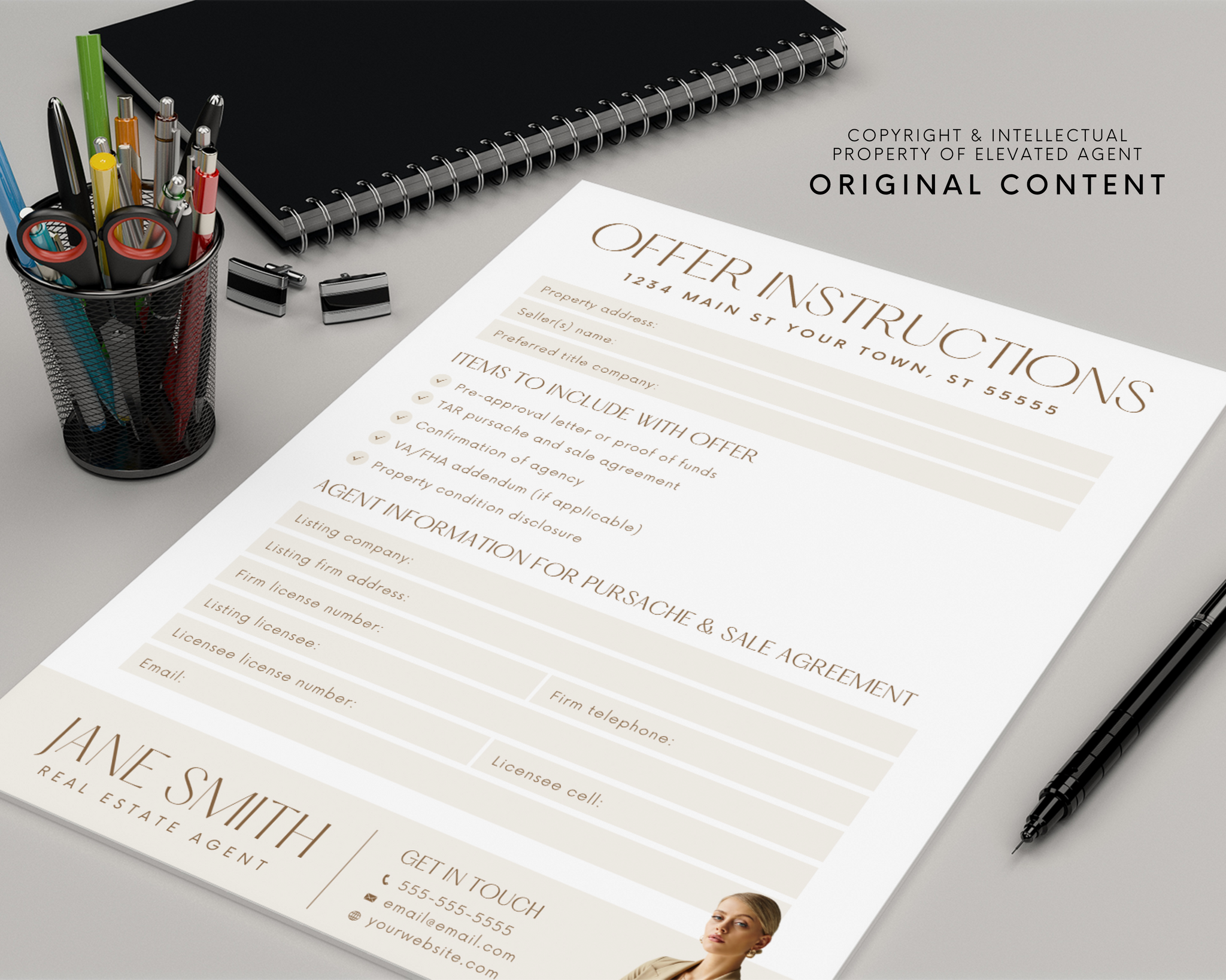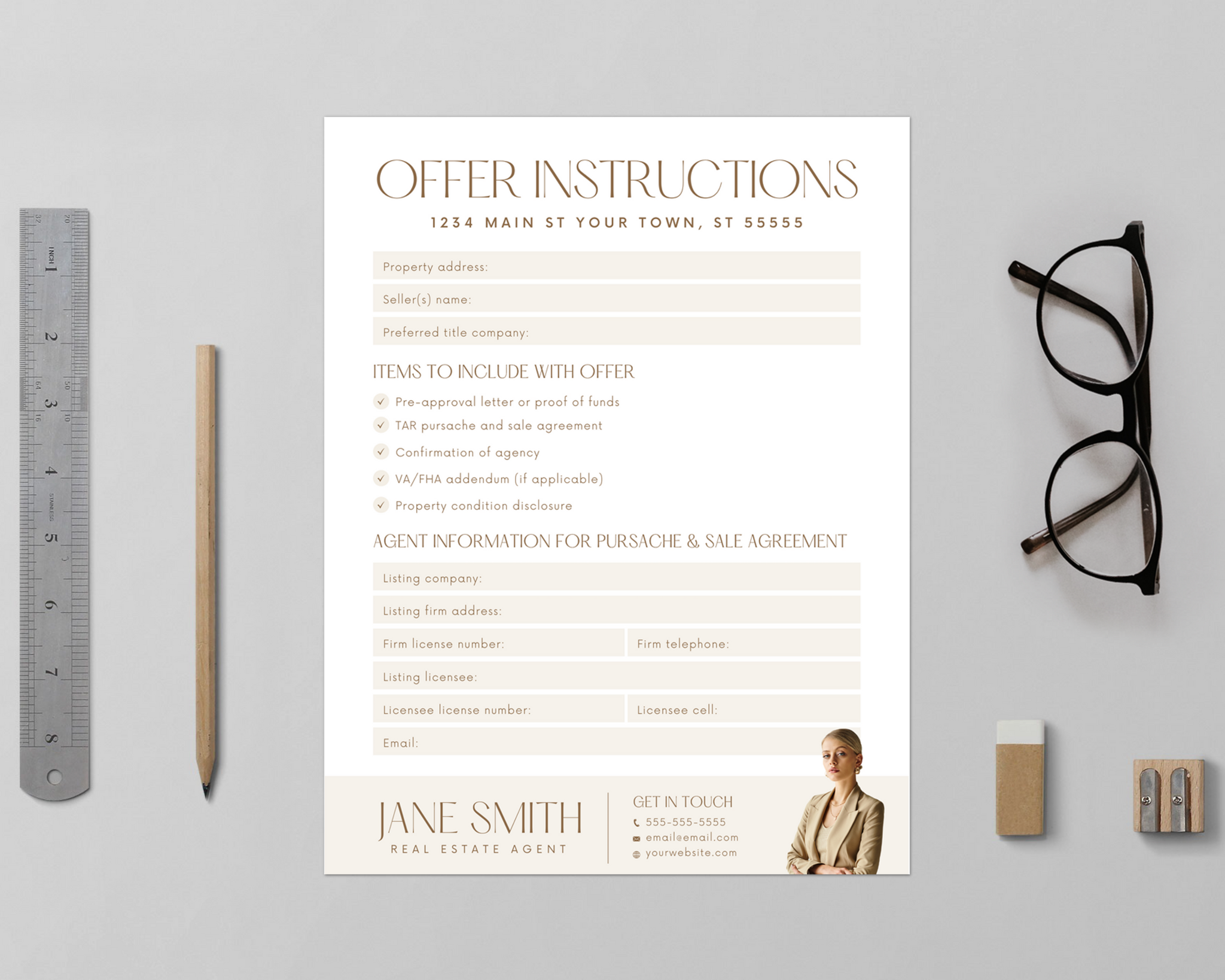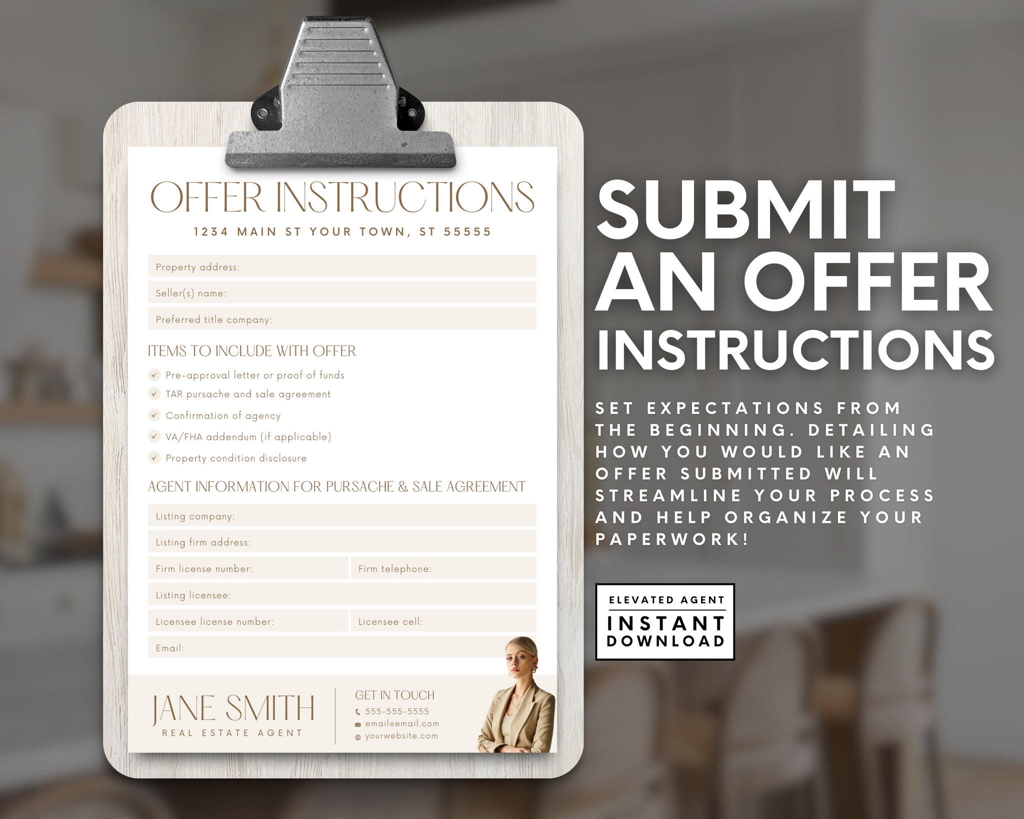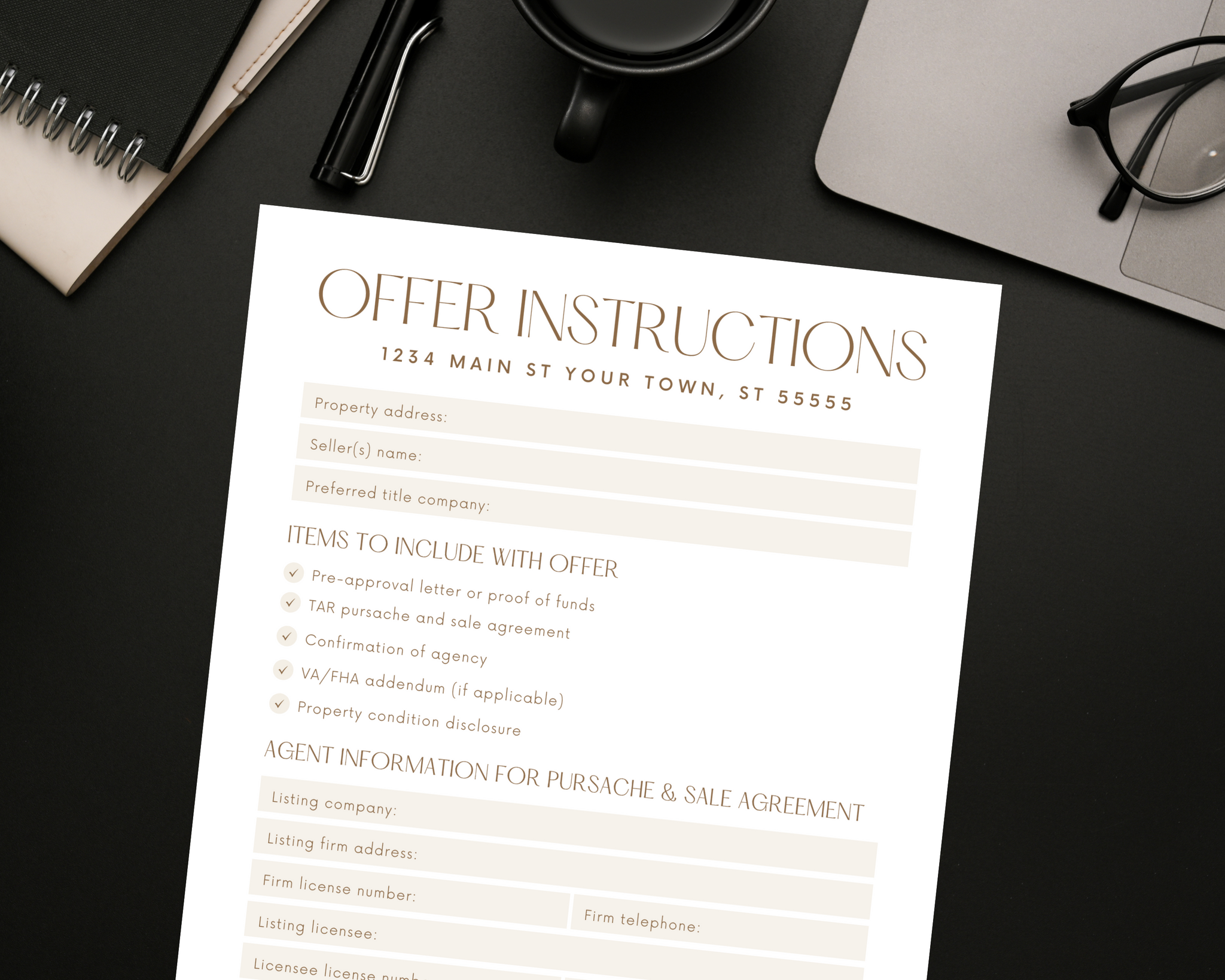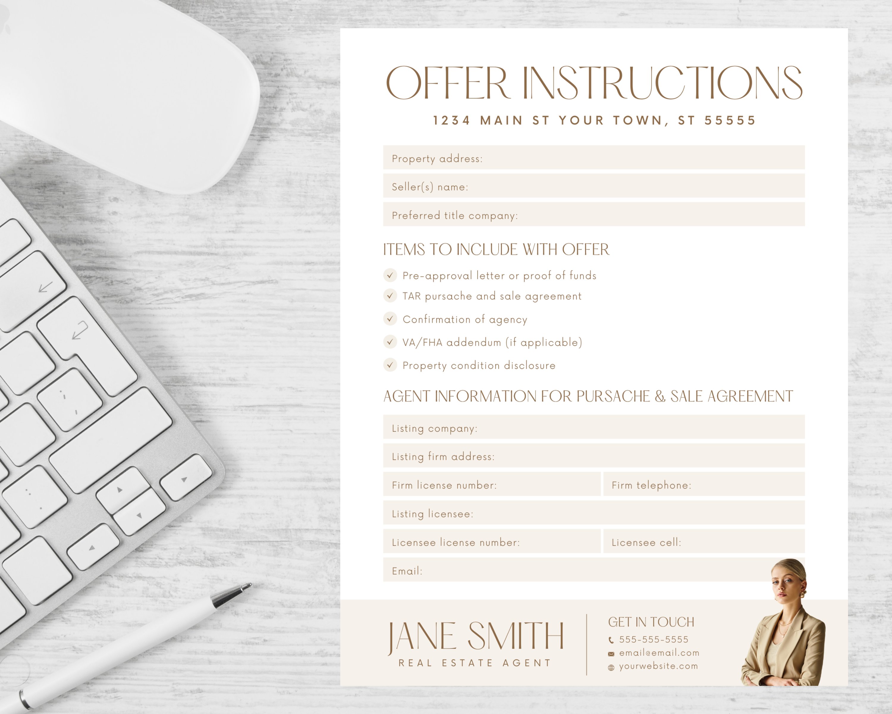 With its intuitive design and customizable features, you can effortlessly personalize each template to match your branding and meet the specific requirements of any transaction. Whether you're a seasoned pro or just starting out, our Real Estate Offer Instructions template empowers you to present offers with polish and professionalism, setting you apart in a competitive market.