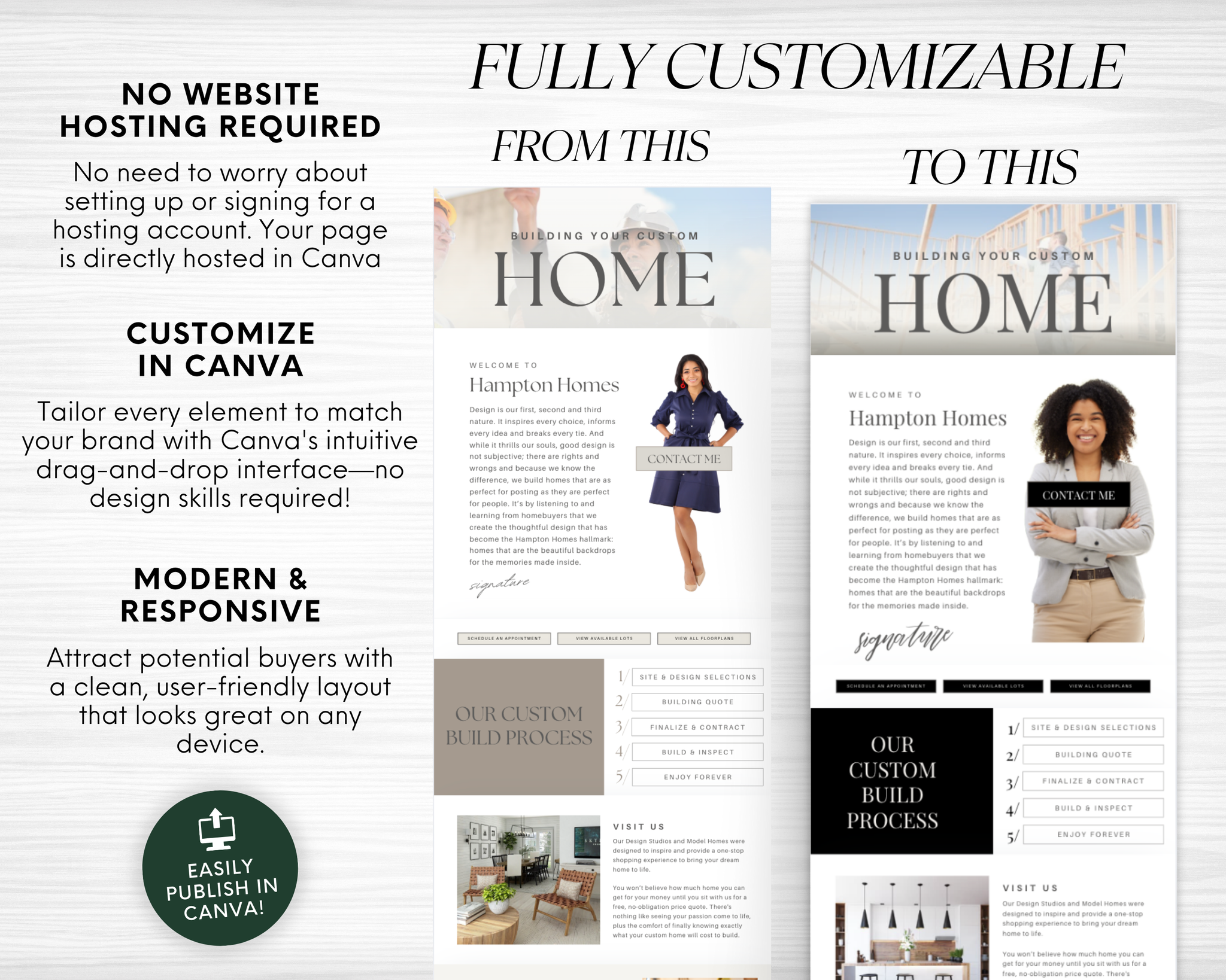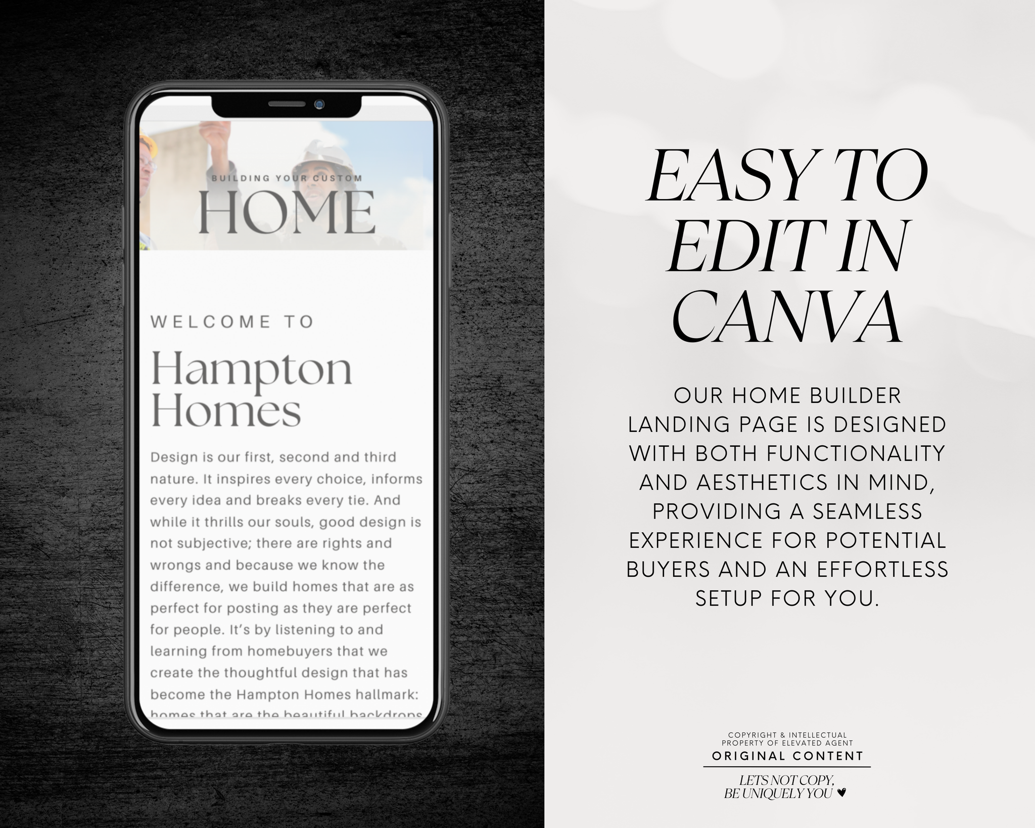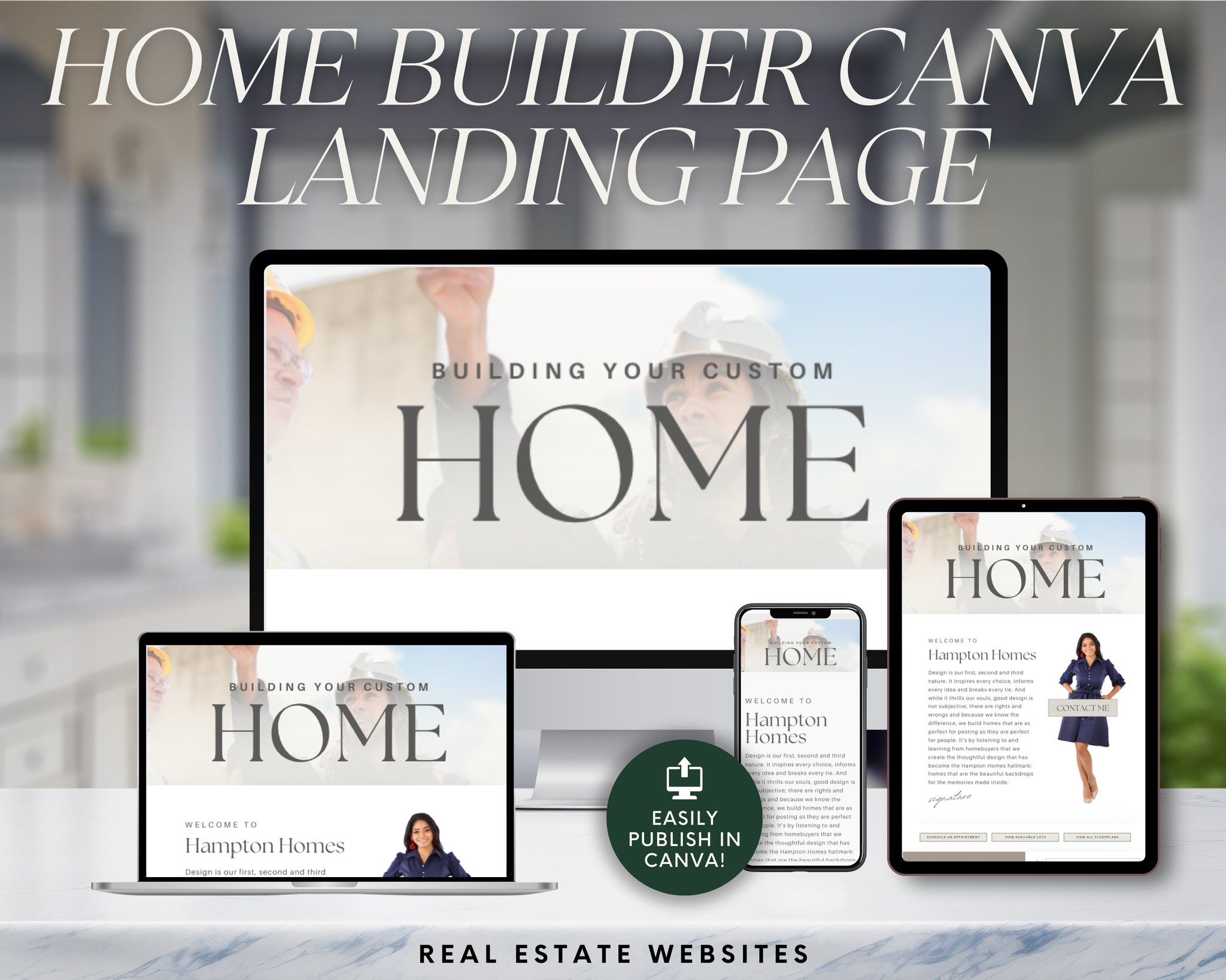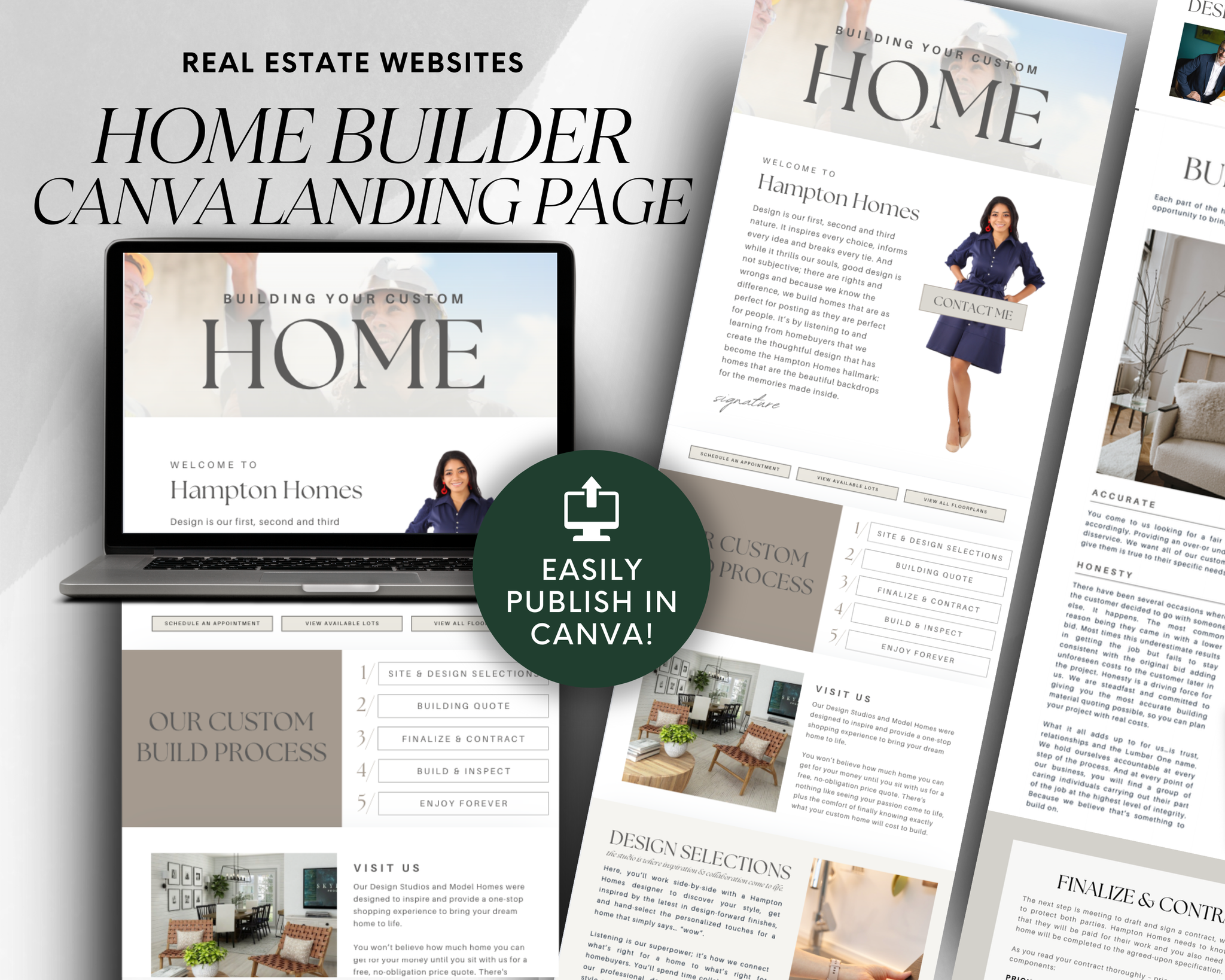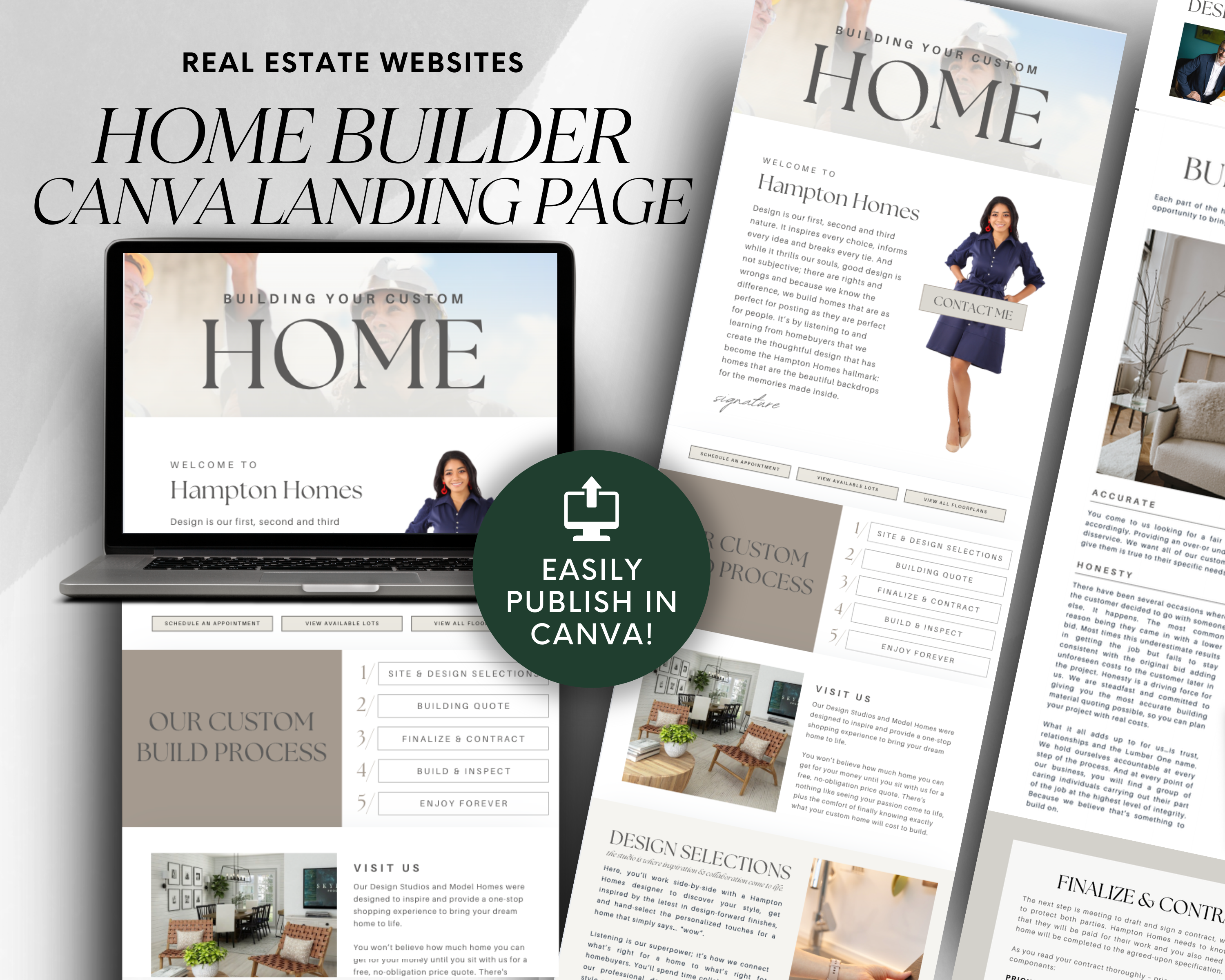 Capture the attention of potential clients and stand out as a trusted real estate professional with our Real Estate Home Builder Landing Page Template, designed specifically for real estate agents and brokers. This sleek, modern, and fully customizable Canva website template is the ultimate tool to showcase your services, strategies, and expertise to potential clients.