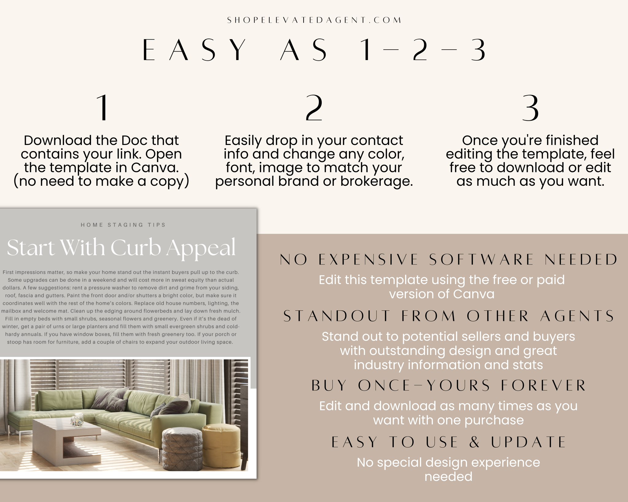 Attention Real Estate Agents! Keep your real estate marketing fresh and updated with this easy-to-use Realtor Canva Template designed by Elevated Agent. We stay on top of real estate marketing trends and produce new content daily.