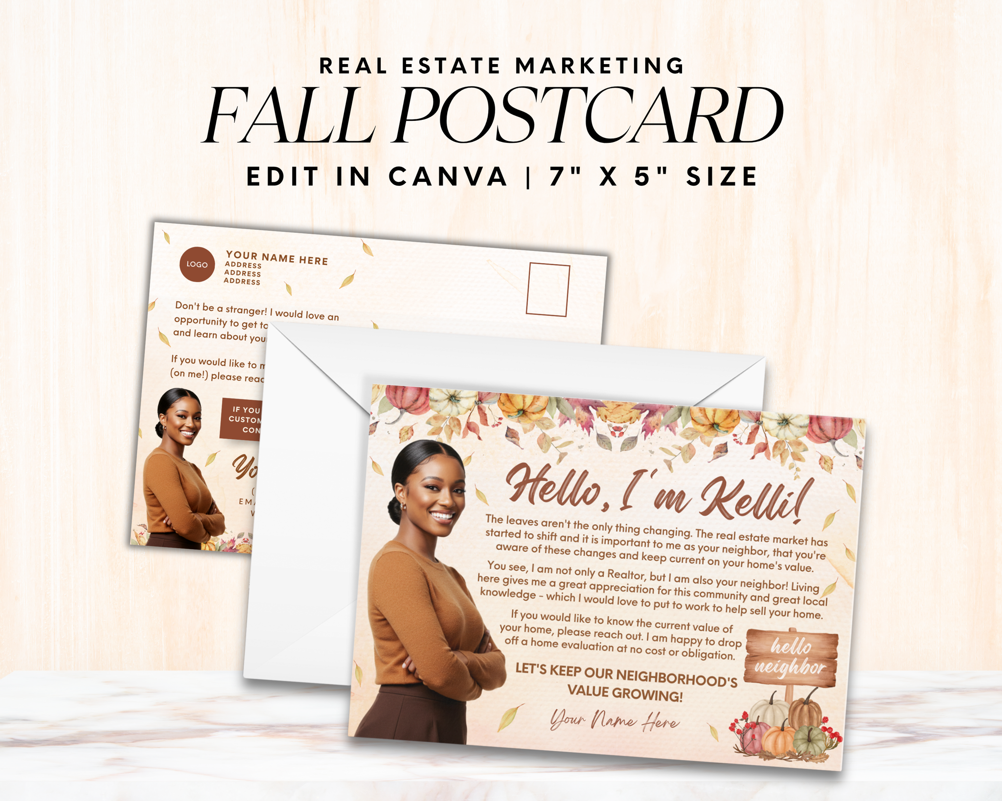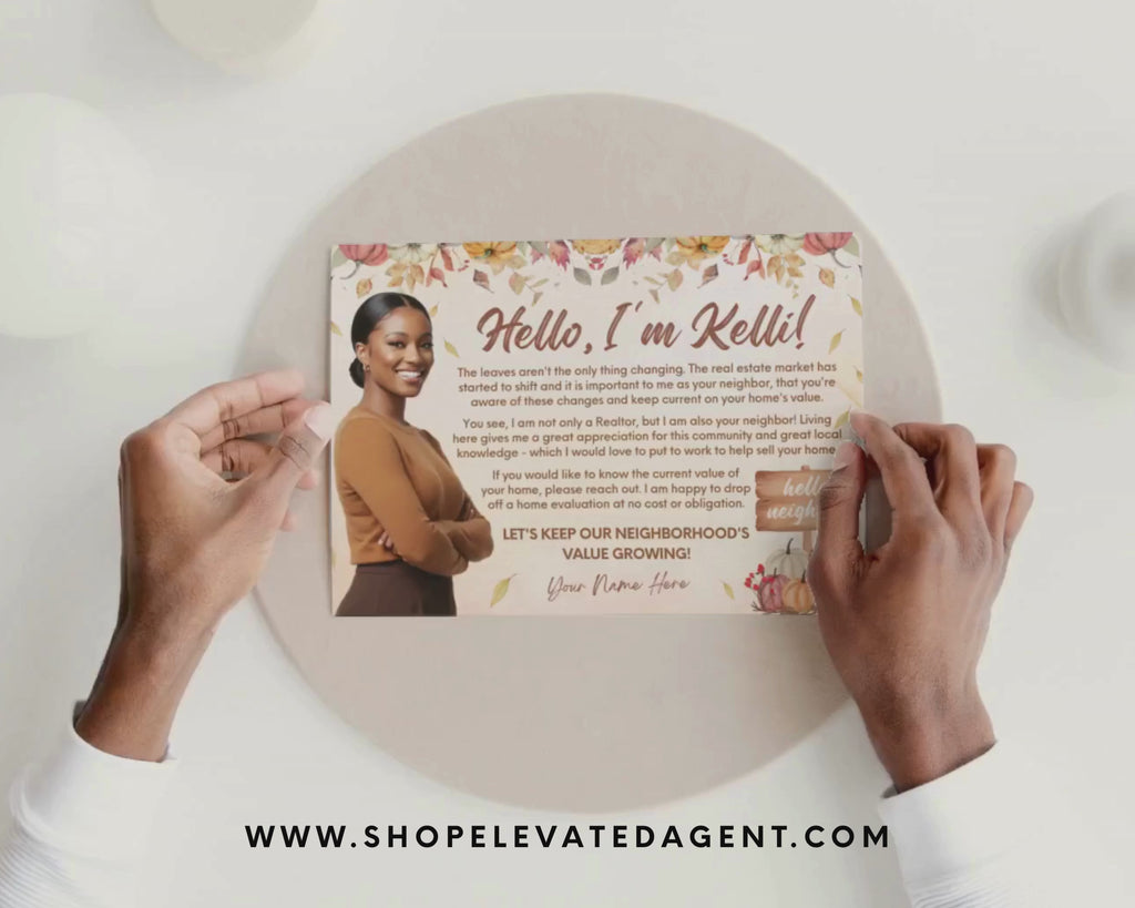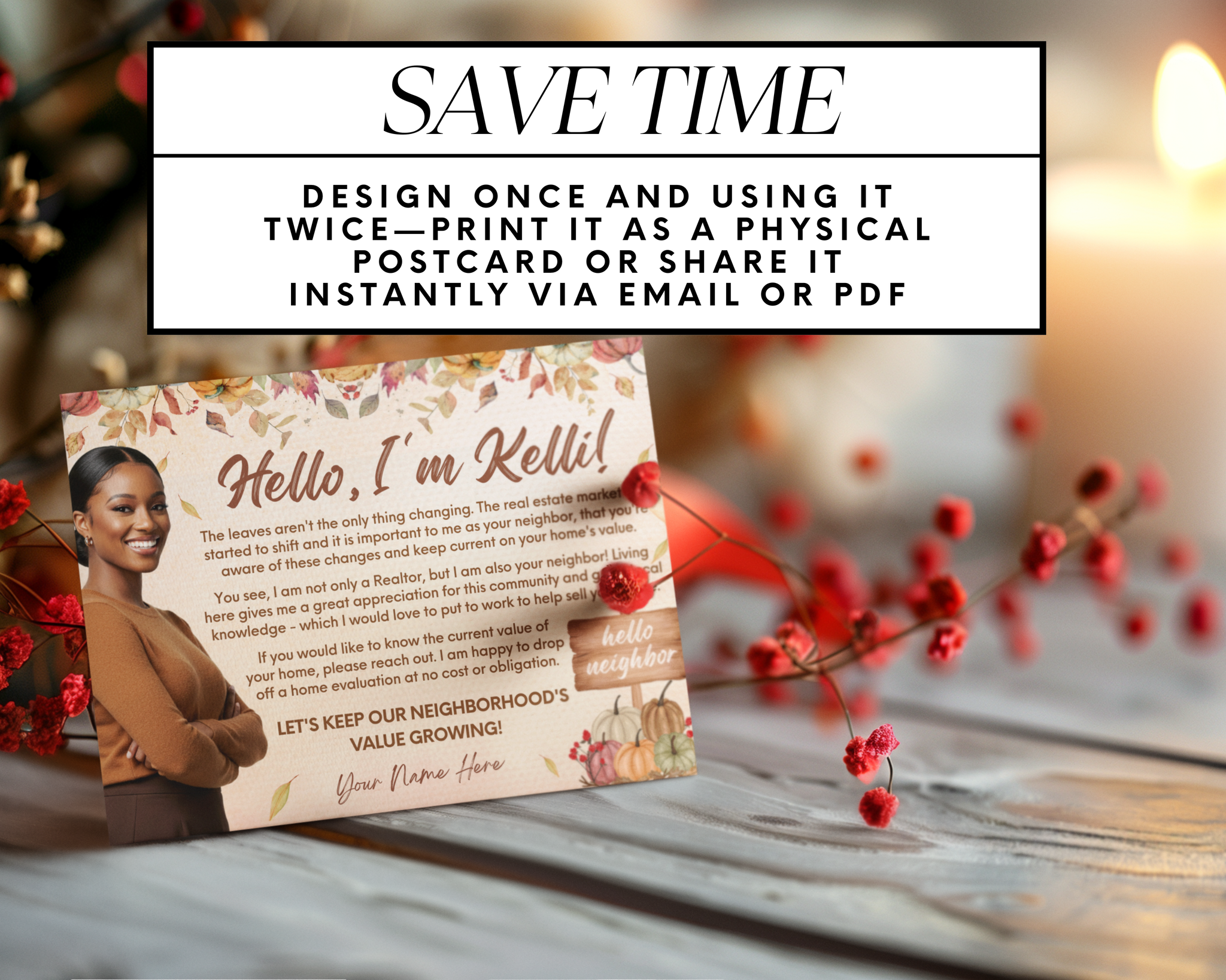 Welcome the season of change with this Real Estate Fall Postcard Template, thoughtfully designed to help you stay connected with your community and clients. Perfect for real estate agents looking to share a friendly message, provide a home evaluation offer, or remind neighbors of your local expertise, all with a warm, autumn-inspired touch.