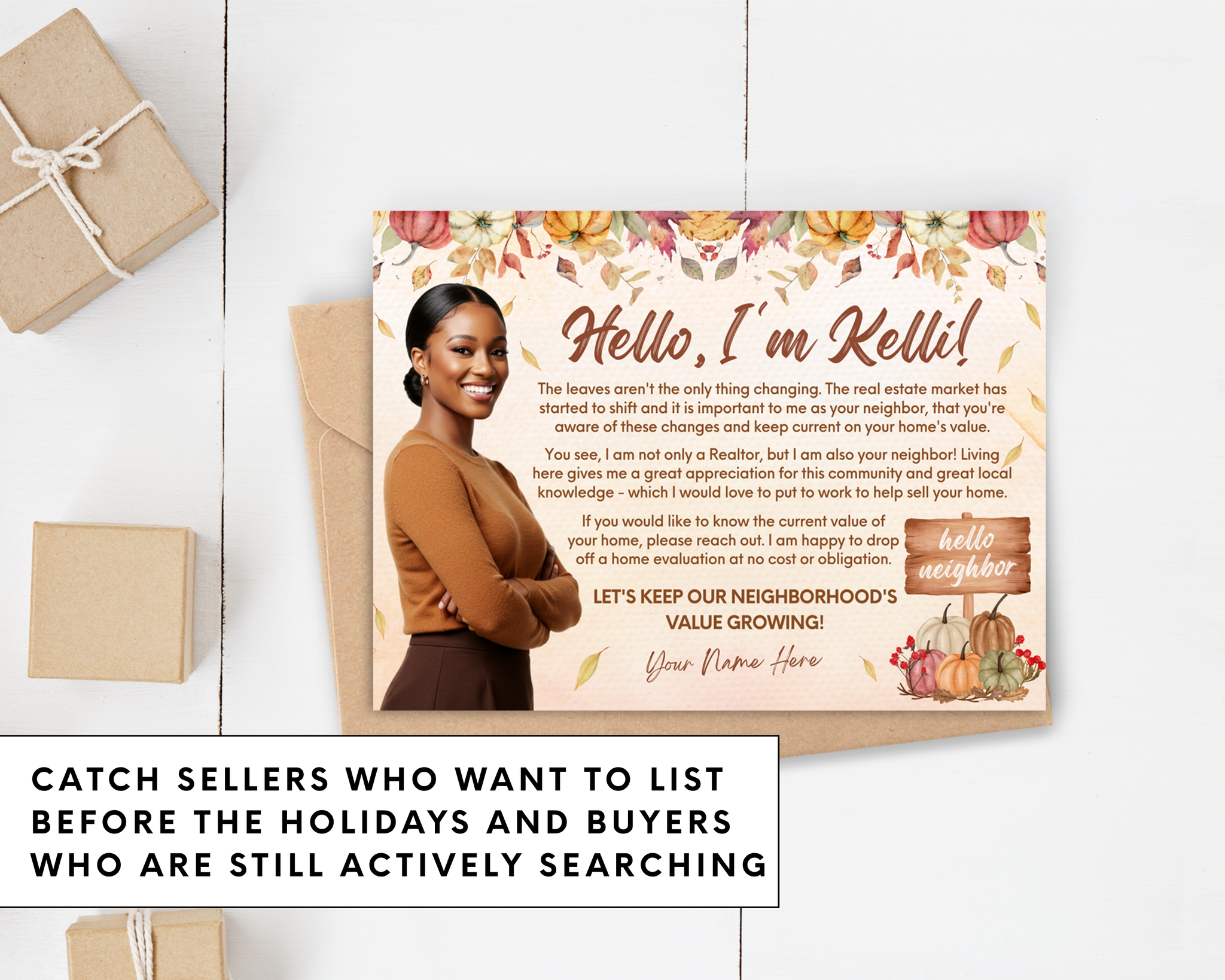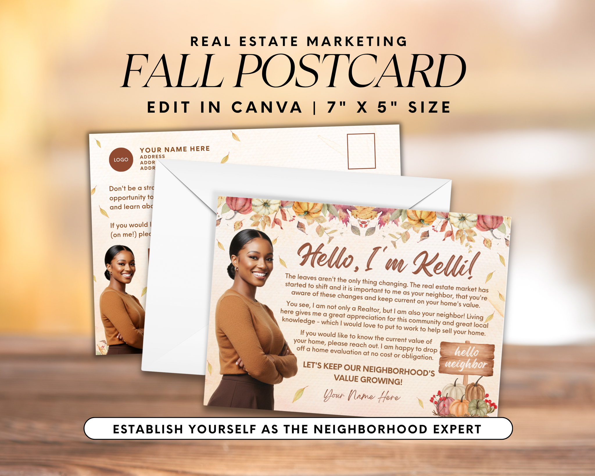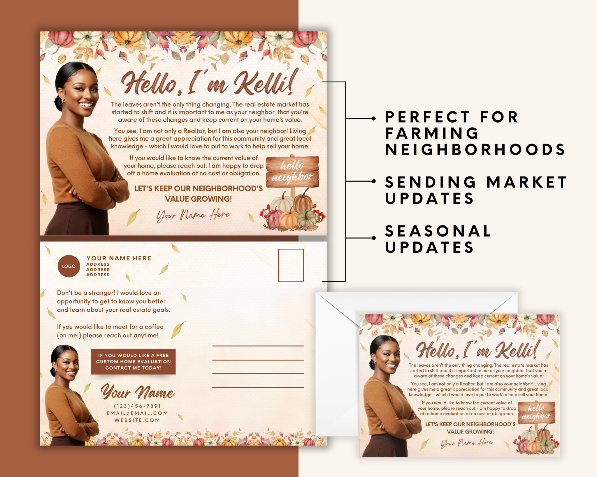 Welcome the season of change with this Real Estate Fall Postcard Template, thoughtfully designed to help you stay connected with your community and clients. Perfect for real estate agents looking to share a friendly message, provide a home evaluation offer, or remind neighbors of your local expertise, all with a warm, autumn-inspired touch.