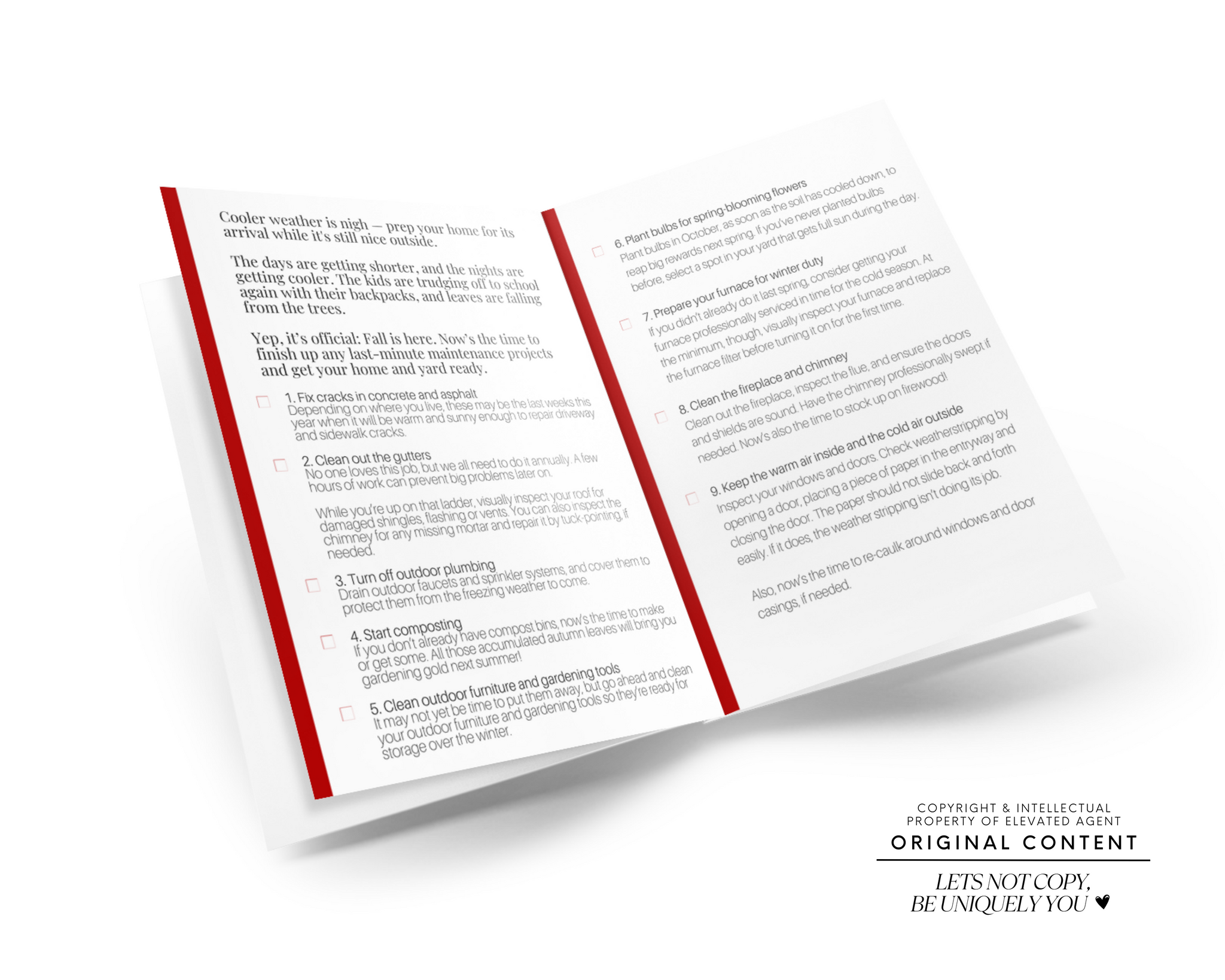 This guide is 4 pages and is for potential sellers to help them prepare their home for the market. It takes them room by room and gives them a checklist of items to check in the house. There are interactive boxes for the client the check through and a call to action at the end.