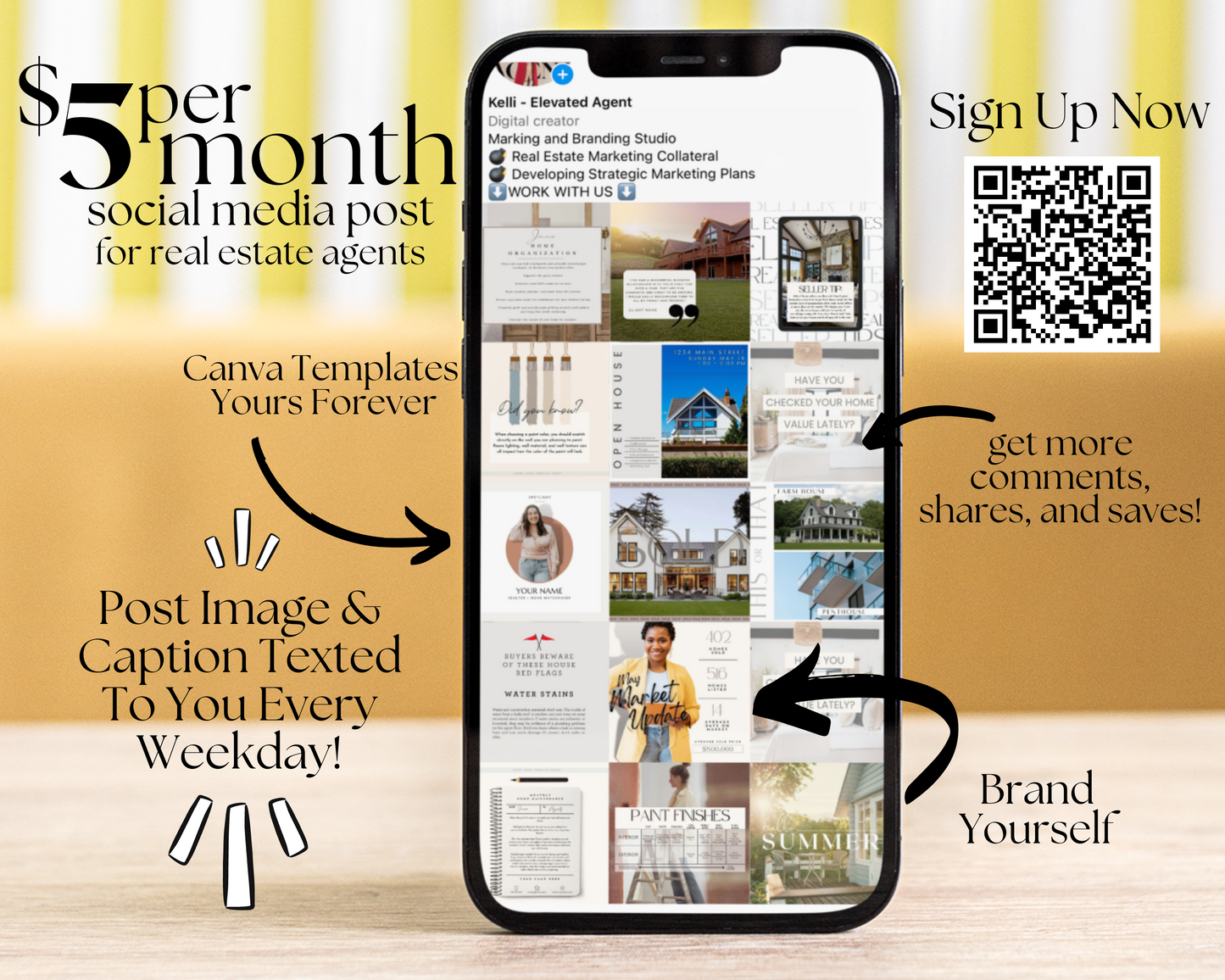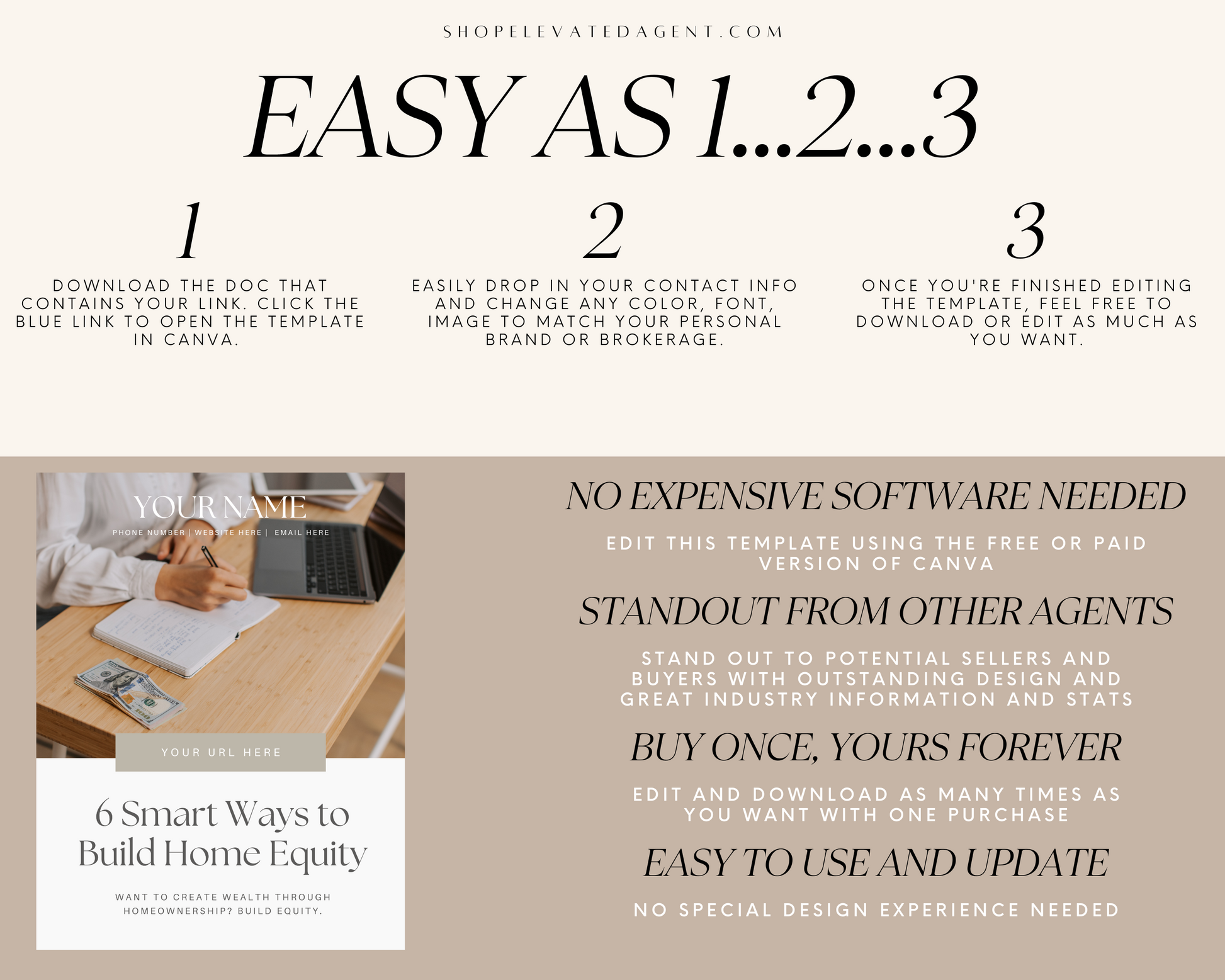 Keep your real estate marketing fresh and updated with this easy-to-use Real Estate Template in Canva designed by Elevated Agent. We stay on top of real estate marketing trends and produce new content daily.