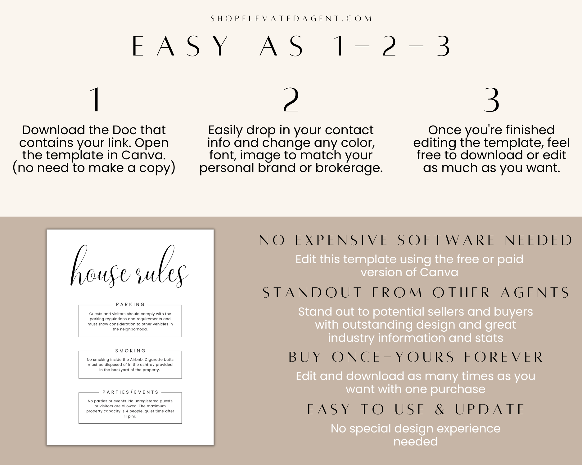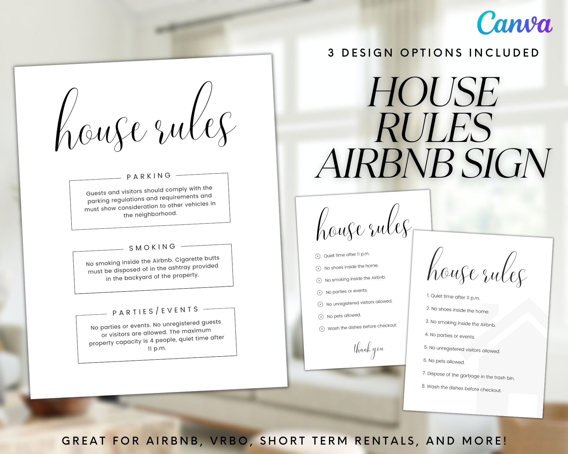 Attention professional Airbnb or VRBO hosts! Use this Real Estate Template – Airbnb House Rules Sign to provide your guest with clear communication about the house rules during their stay. Customize your sign with your own rules and enjoy a smooth and stress-free hosting experience with happy guests who are aware of your expectations.