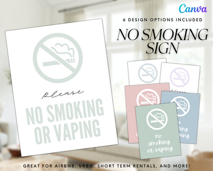 By displaying a "No Smoking for Vaping" sign, you'll be helping to protect your guests from potential harm and sending a message that you care about their well-being. Plus, it'll add a touch of professionalism and responsibility to your Airbnb listing. Give your guests the peace of mind they deserve by adding this Canva-designed sign to your rental space today.