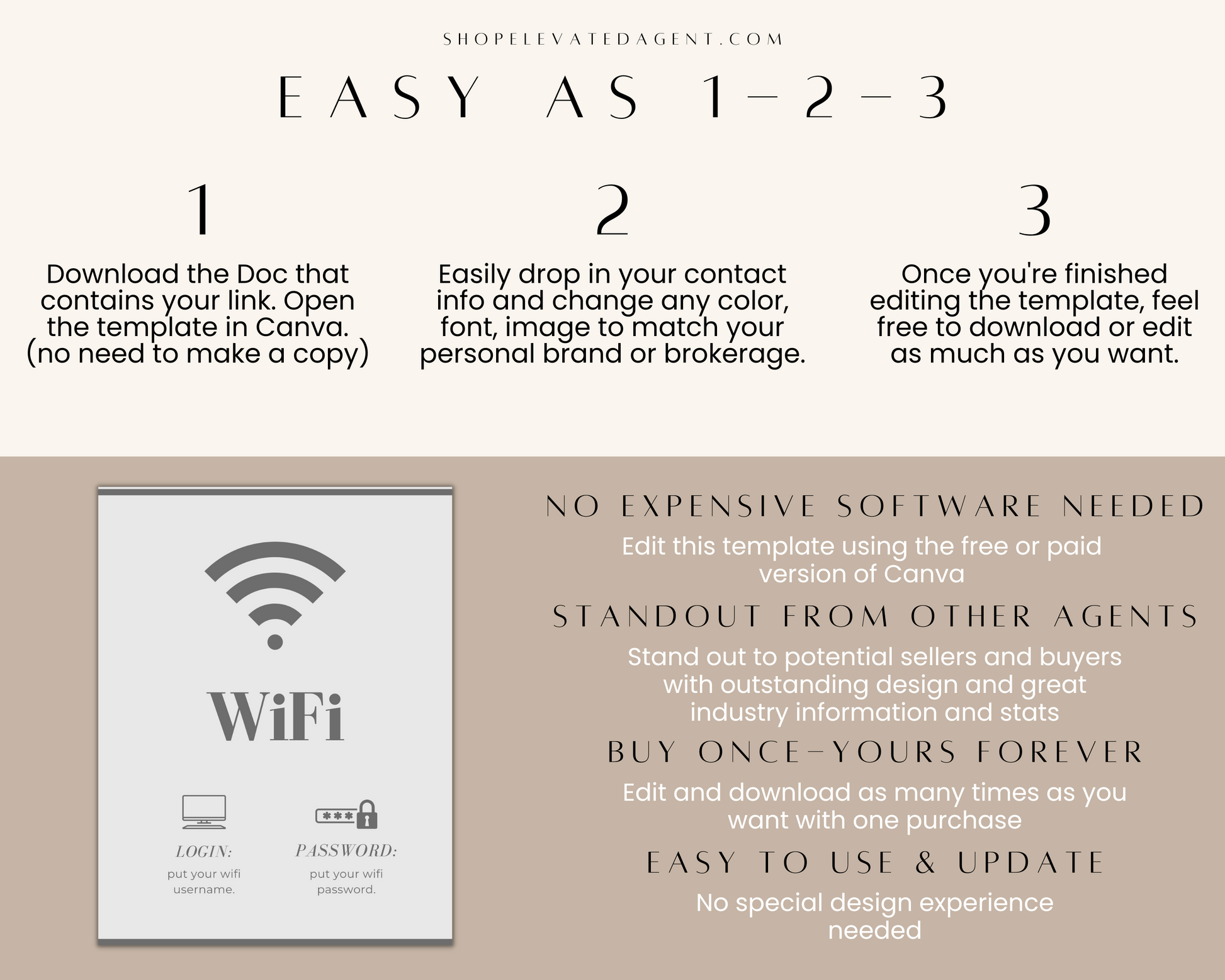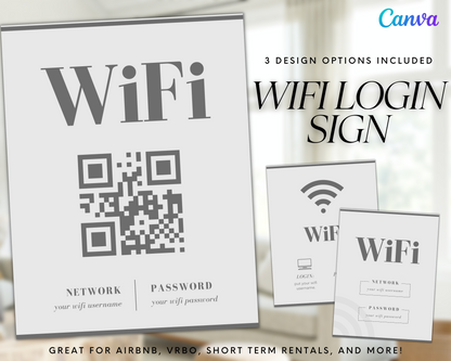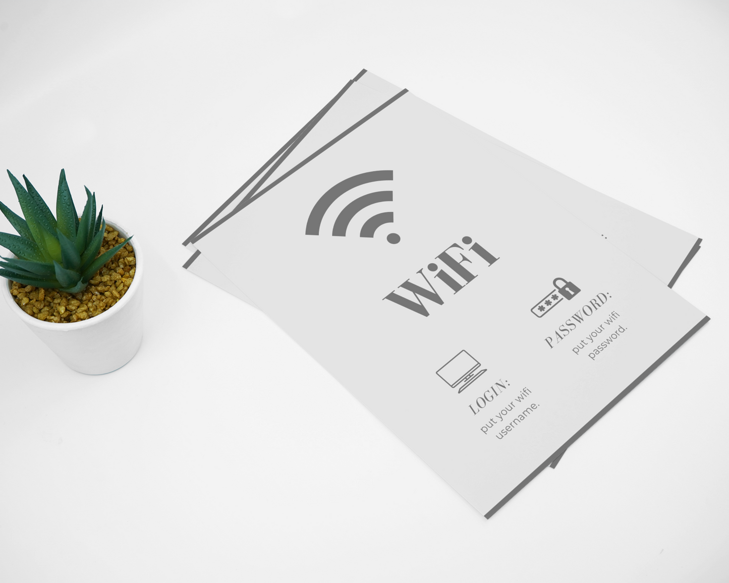 This Real Estate Template – Airbnb Wifi Sign 1 can be edited to include the WIFI network name and the password for your Airbnb property. You can also email the digital file to your guests.