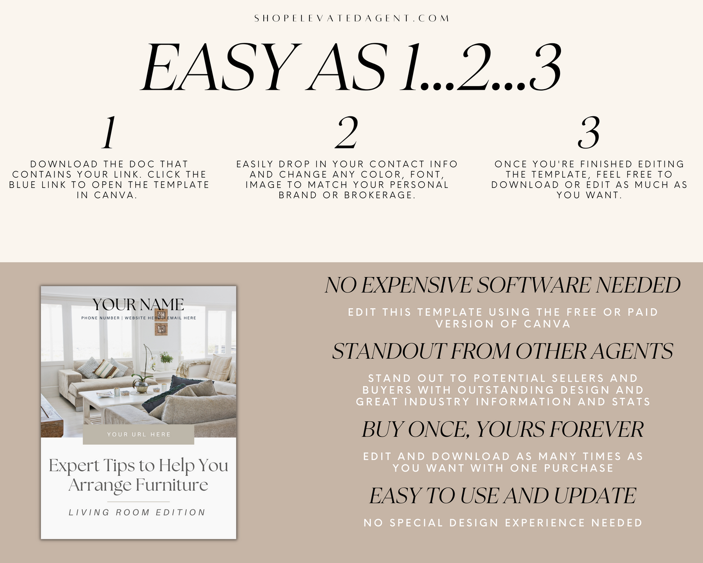 Are you a real estate agent looking to up your marketing game? Well, look no further because our real estate templates have you covered with this Arrange Living Room Furniture Guide! Say goodbye to boring real estate marketing and hello to eye-catching graphics that are sure to grab the attention of potential seller clients.