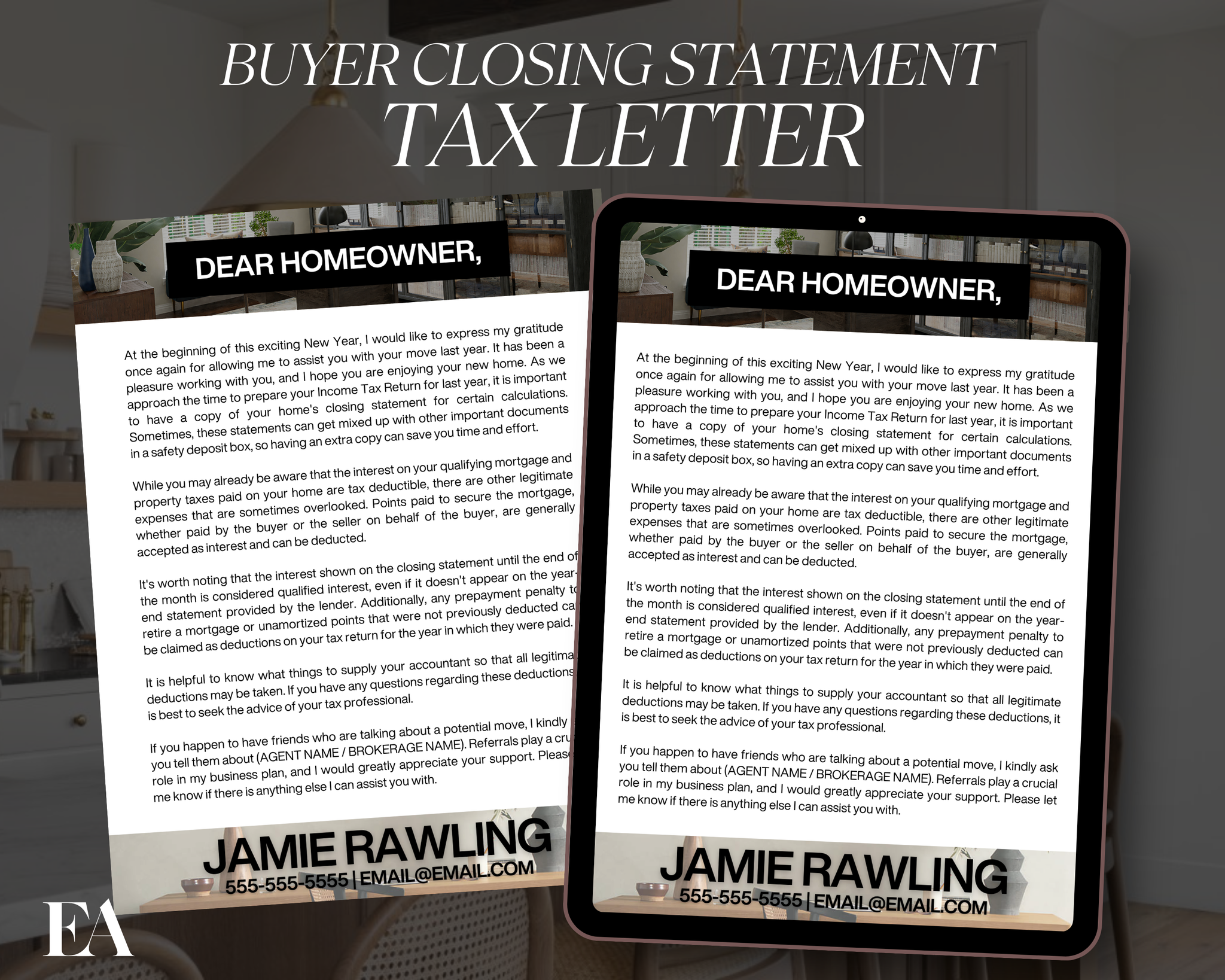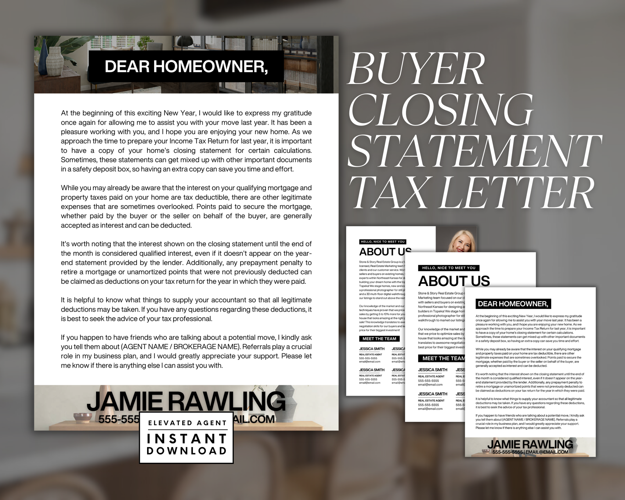 Make tax season stress-free for your clients and elevate your professional image, add this Real Estate Buyer Closing Statement Tax Letter Template to your toolkit today!