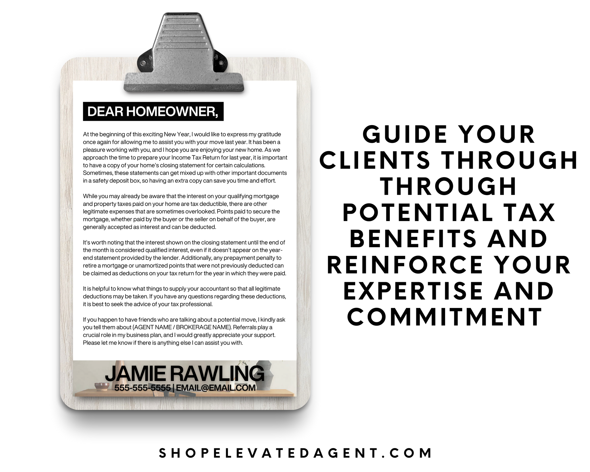 Informative Content: Includes detailed tips on tax-deductible expenses, ensuring your clients are well-prepared for tax season.