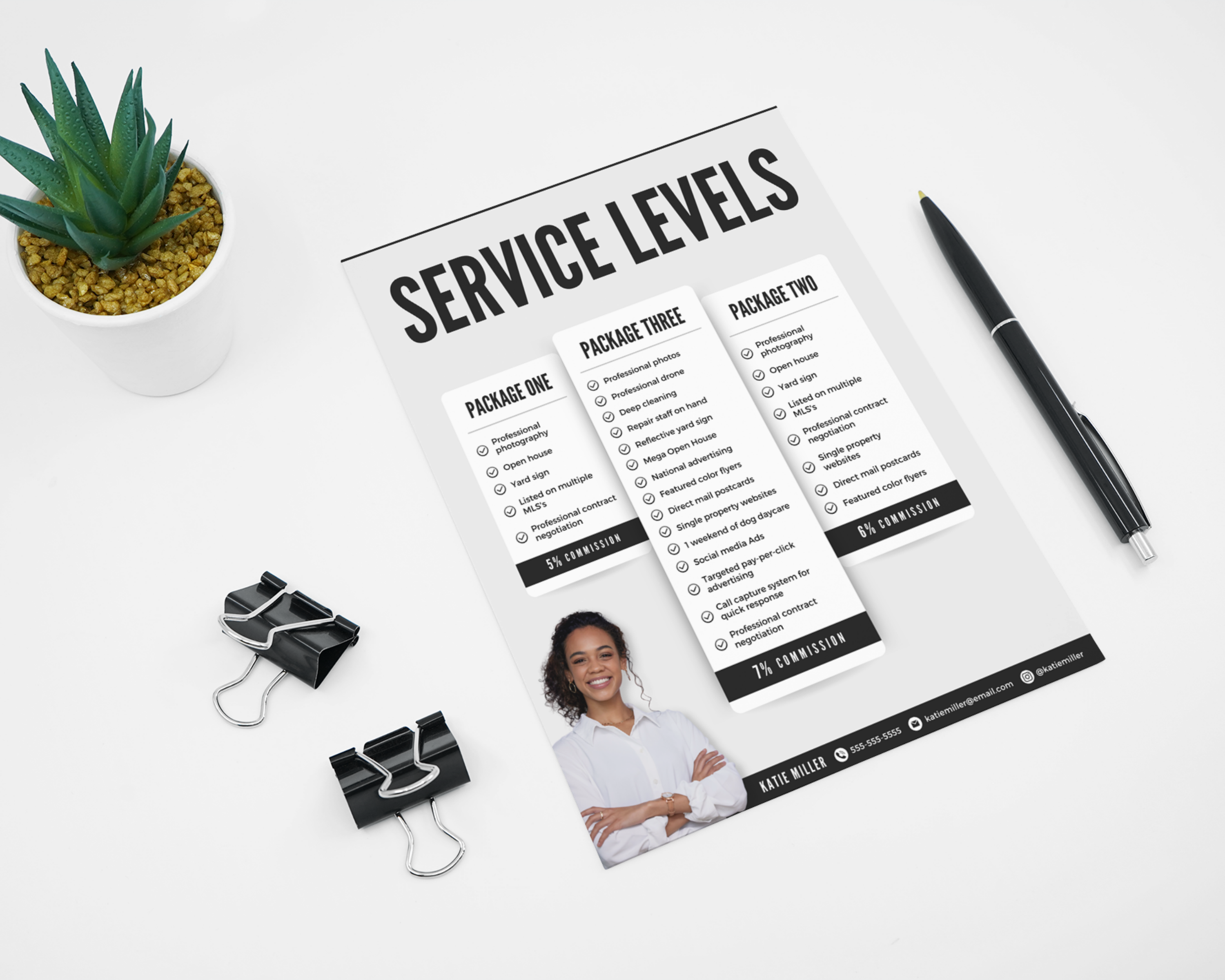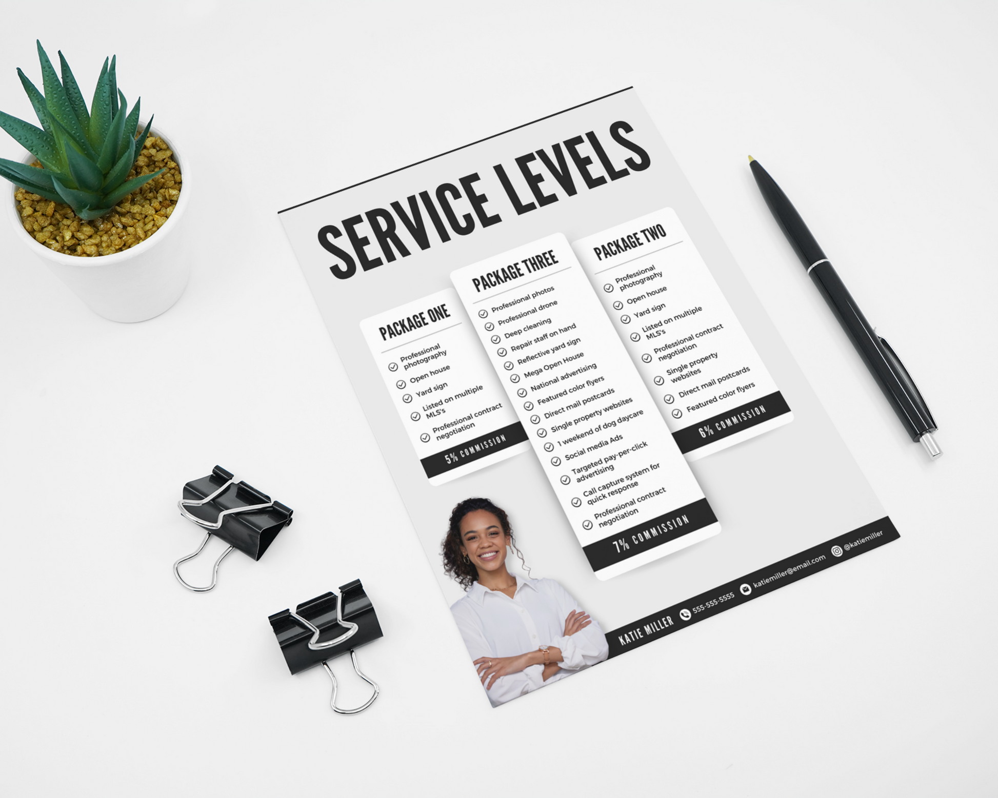 We're grateful to be a part of your selling journey, and we're committed to providing informative, helpful, and concise content that connects with you on a personal level. Our friendly and approachable brand voice is here to guide you every step of the way. Get ready to simplify your selling journey and attract potential buyers with style. Try our Real Estate Commission-Level Flyer templates today!