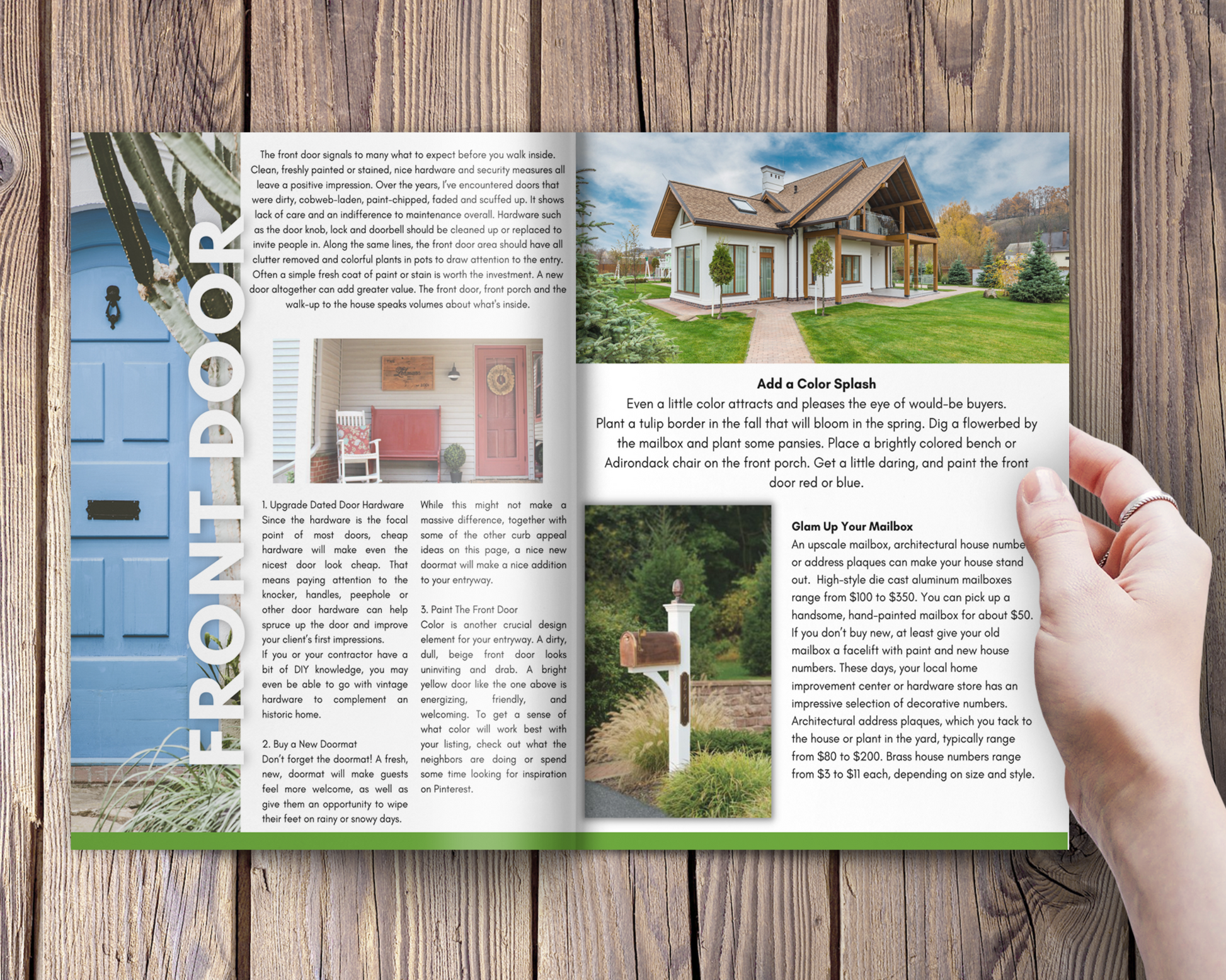 This Real Estate Template – Curb Appeal Workbook can be printed at a local printer to be mailed or handed out at in-person events and open houses. You can also email the digital file to your farm.