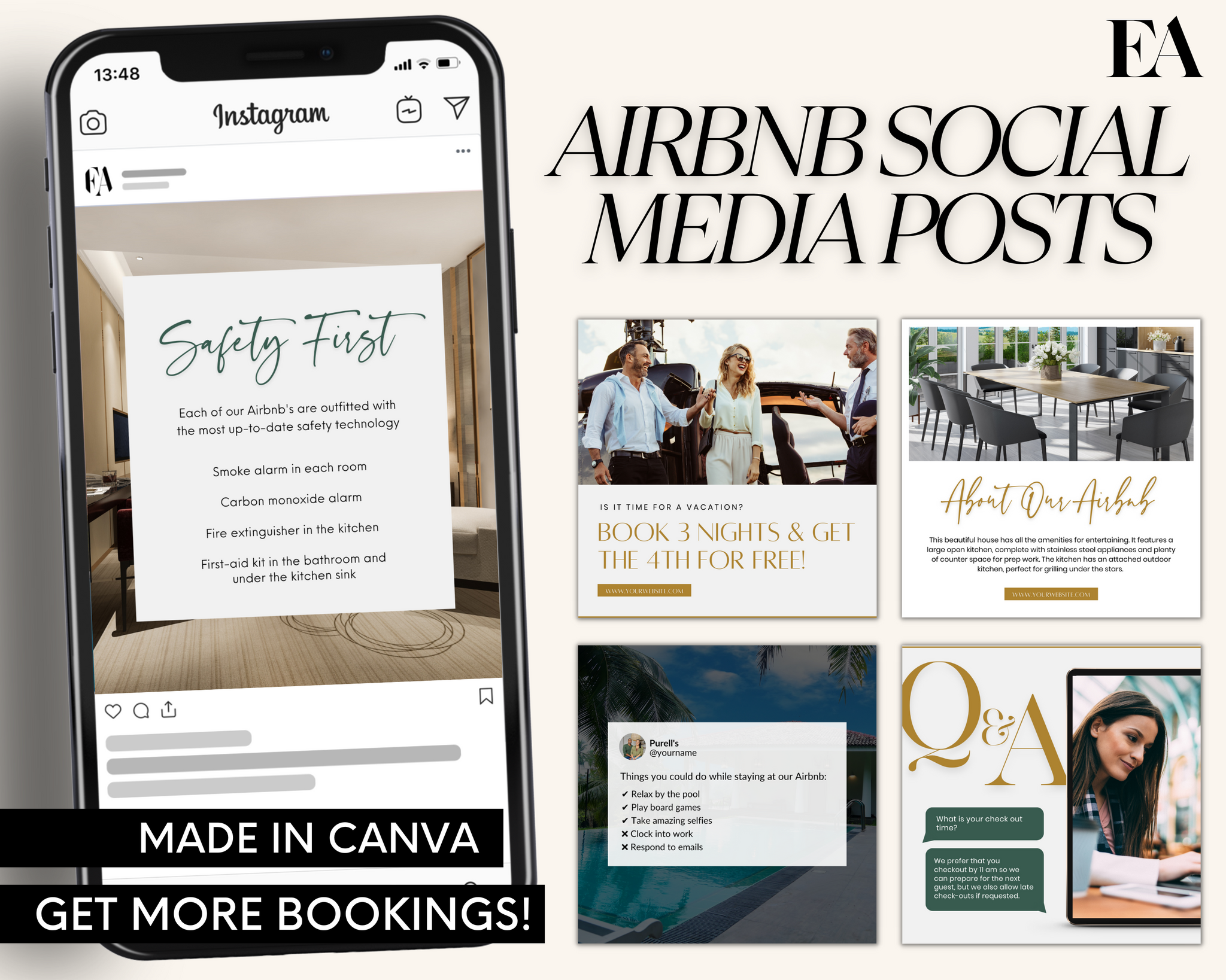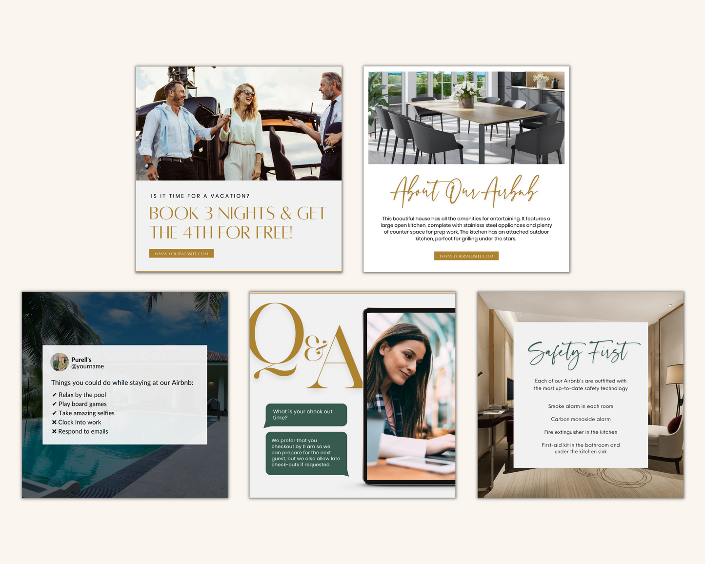 Attention professional Airbnb or VRBO hosts! Use this Real Estate Template – Exclusive Airbnb Social Media Posts 4 to promote an Airbnb short term rental property on social media. Take the guesswork out of what to post every day and use these easy-to-edit templates to promote your property.