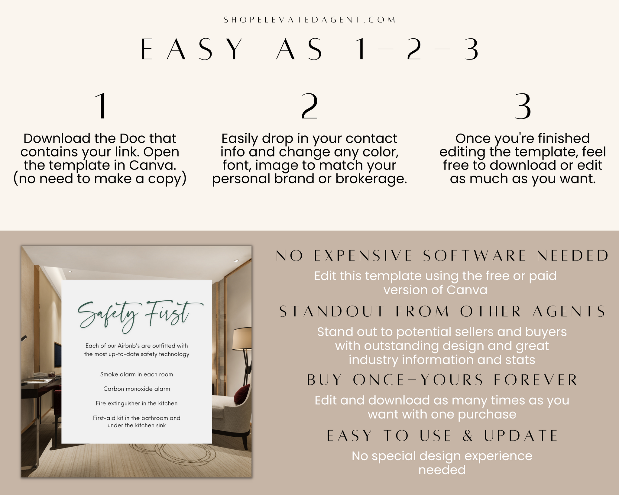 This Real Estate Template – Exclusive Airbnb Social Media Posts 4 can be edited to include the image of your Airbnb property and property-specific details. You can also share the graphics on social media, add them to text messages, email the digital file to your guests, or have it as part of your listing.