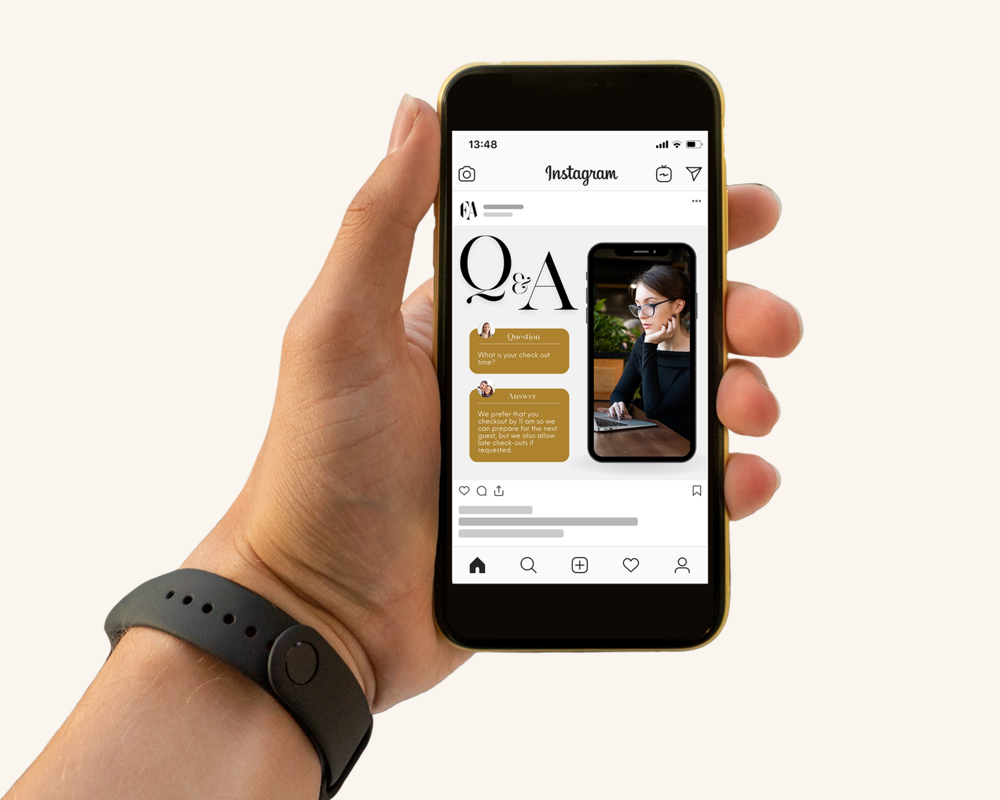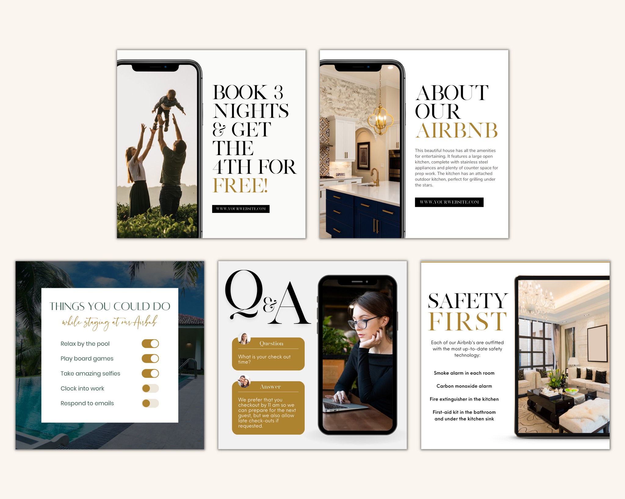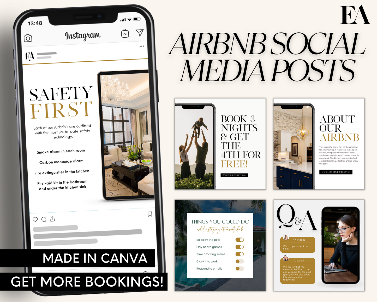 Attention professional Airbnb or VRBO hosts! Use this Real Estate Template – Exclusive Airbnb Social Media Posts 5 to promote an Airbnb short term rental property on social media. Take the guesswork out of what to post every day and use these easy-to-edit templates to promote your property.