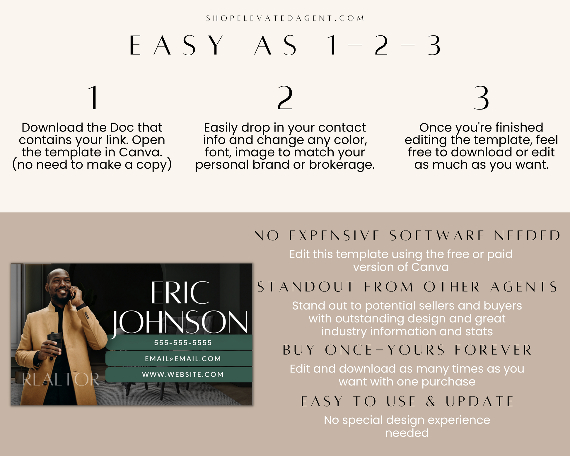 Keep your real estate marketing fresh and updated with this easy-to-use Real Estate Template in Canva designed by Elevated Agent. We stay on top of real estate marketing trends and produce new content daily.