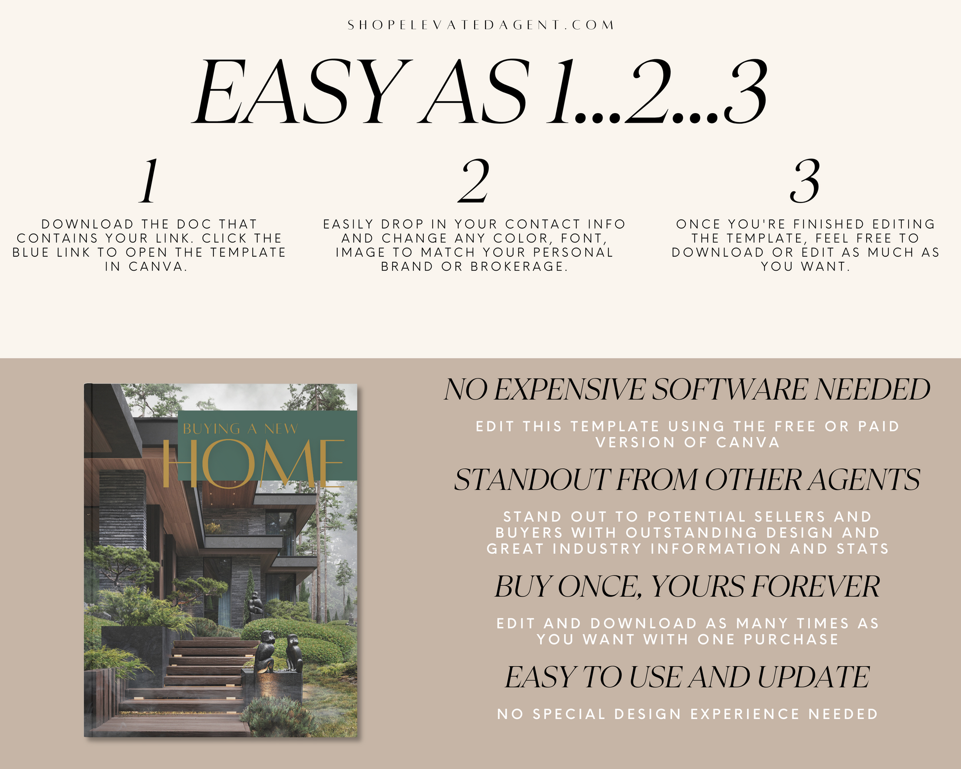 Make an unbeatable impression on home buyer and seller clients with these real estate agent buyer presentation and seller presentation real estate marketing templates from Elevated Agent. Our professionally designed Canva Templates make it easier for real estate agents to market their services with beautifully designed presentations. Built with the power of Canva, these templates are made to captivate potential buyers and inform them about the various services you provide.