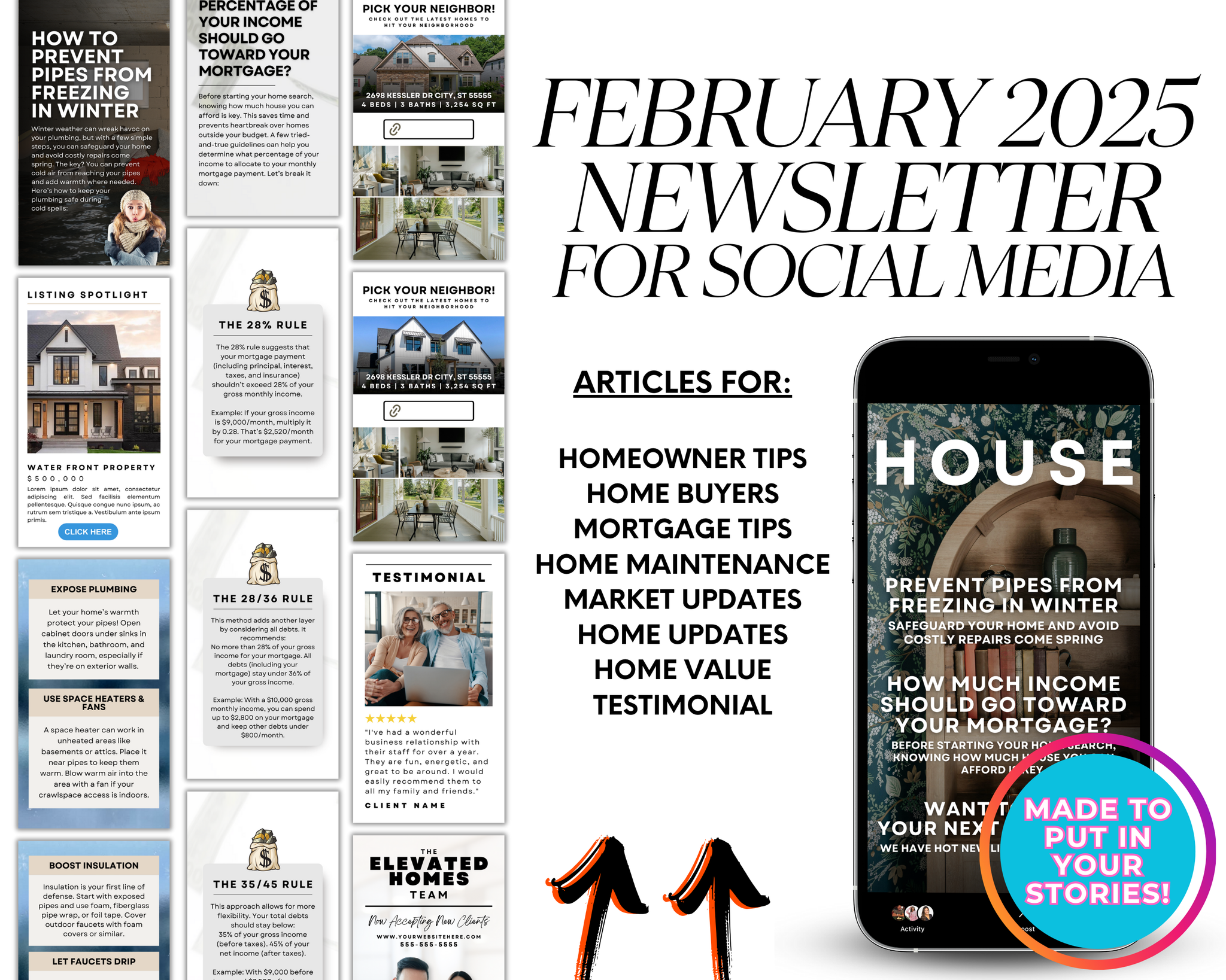 Strengthen client relationships and attract potential buyers & sellers with this stunning and strategic Real Estate February Story Newsletter Template. Grab yours today and start posting like a pro!