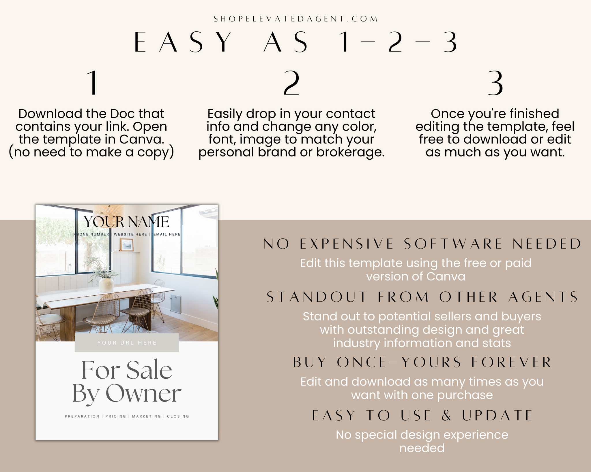 Attention Real Estate Agents! Keep your real estate marketing fresh and updated with this easy-to-use Realtor Canva Template designed by Elevated Agent. We stay on top of real estate marketing trends and produce new content daily.