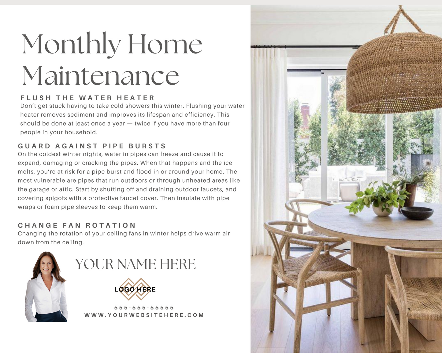 4. Comprehensive Home Maintenance Checklist: Our template offers a clear layout for monthly and seasonal tasks, allowing your clients to plan ahead and tackle maintenance chores when it's most convenient. No more last-minute surprises!