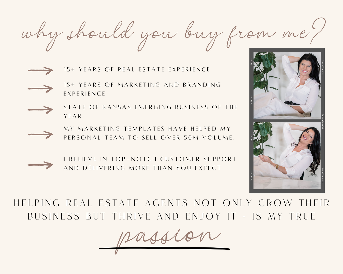 Using my 15+ years experience as a Marketing Manager AND real estate agent coupled with my passion (and talent!) for branding, my mission is to help and support as many real estate agents as possible in building and growing their brands and businesses.