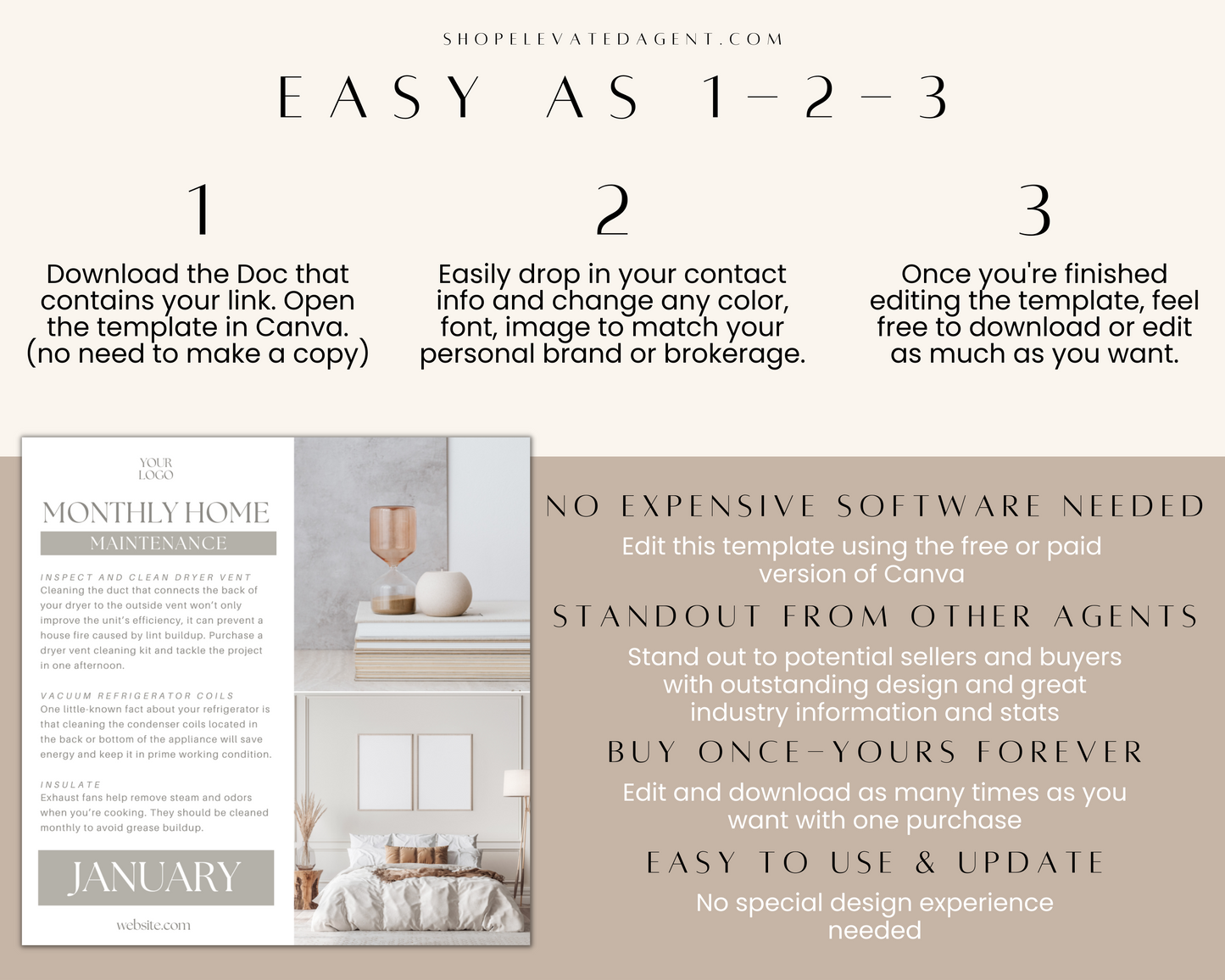 Attention Real Estate Agents! Keep your real estate marketing fresh and updated with this easy-to-use Realtor Canva Template designed by Elevated Agent. We stay on top of real estate marketing trends and produce new content daily.