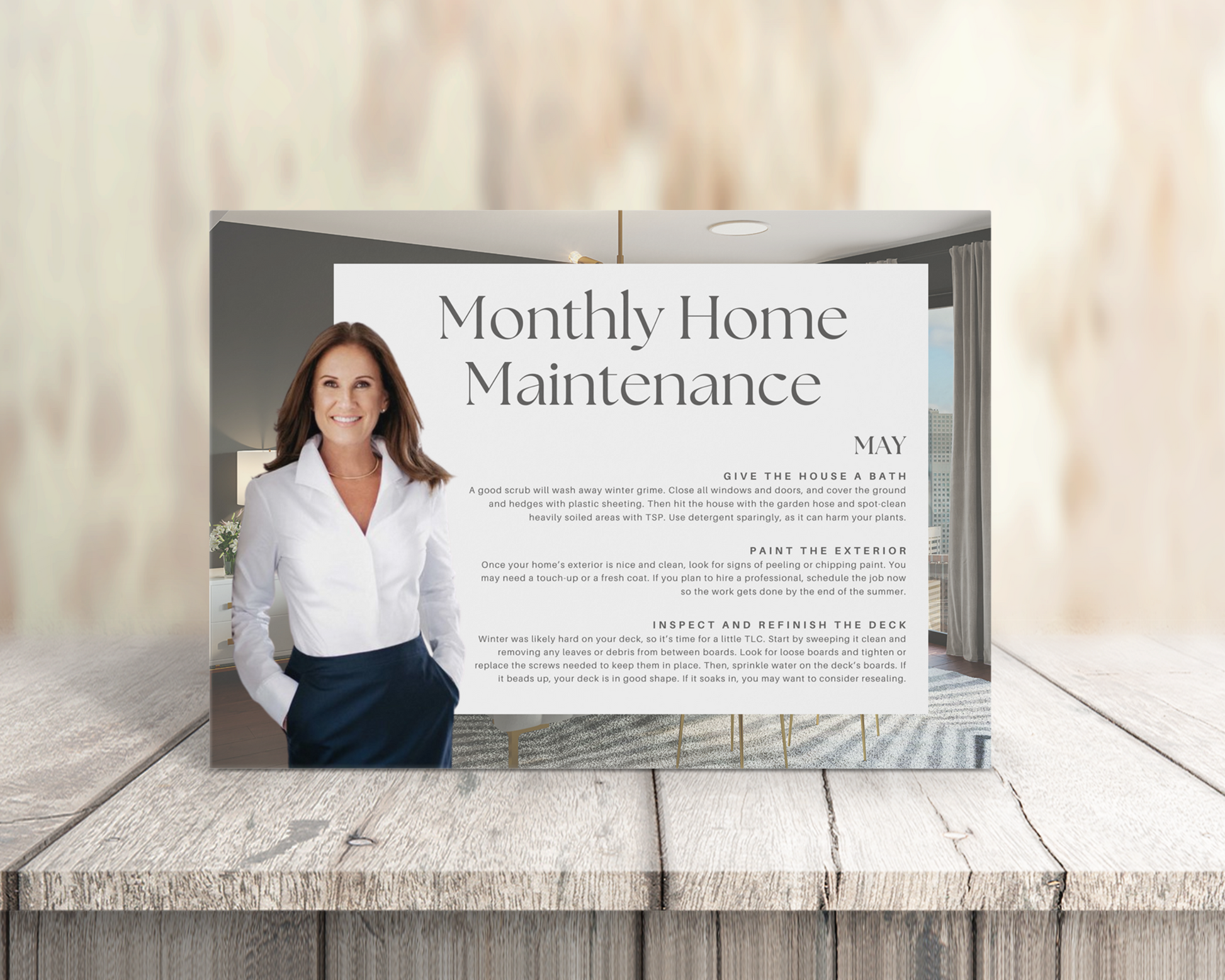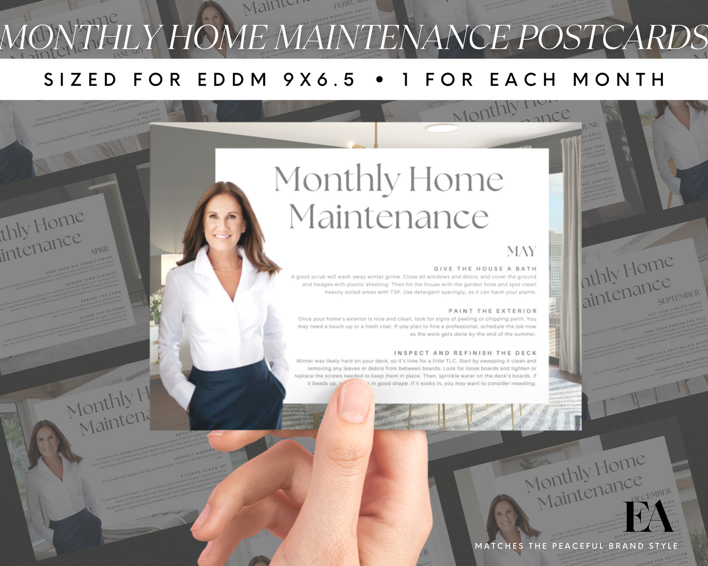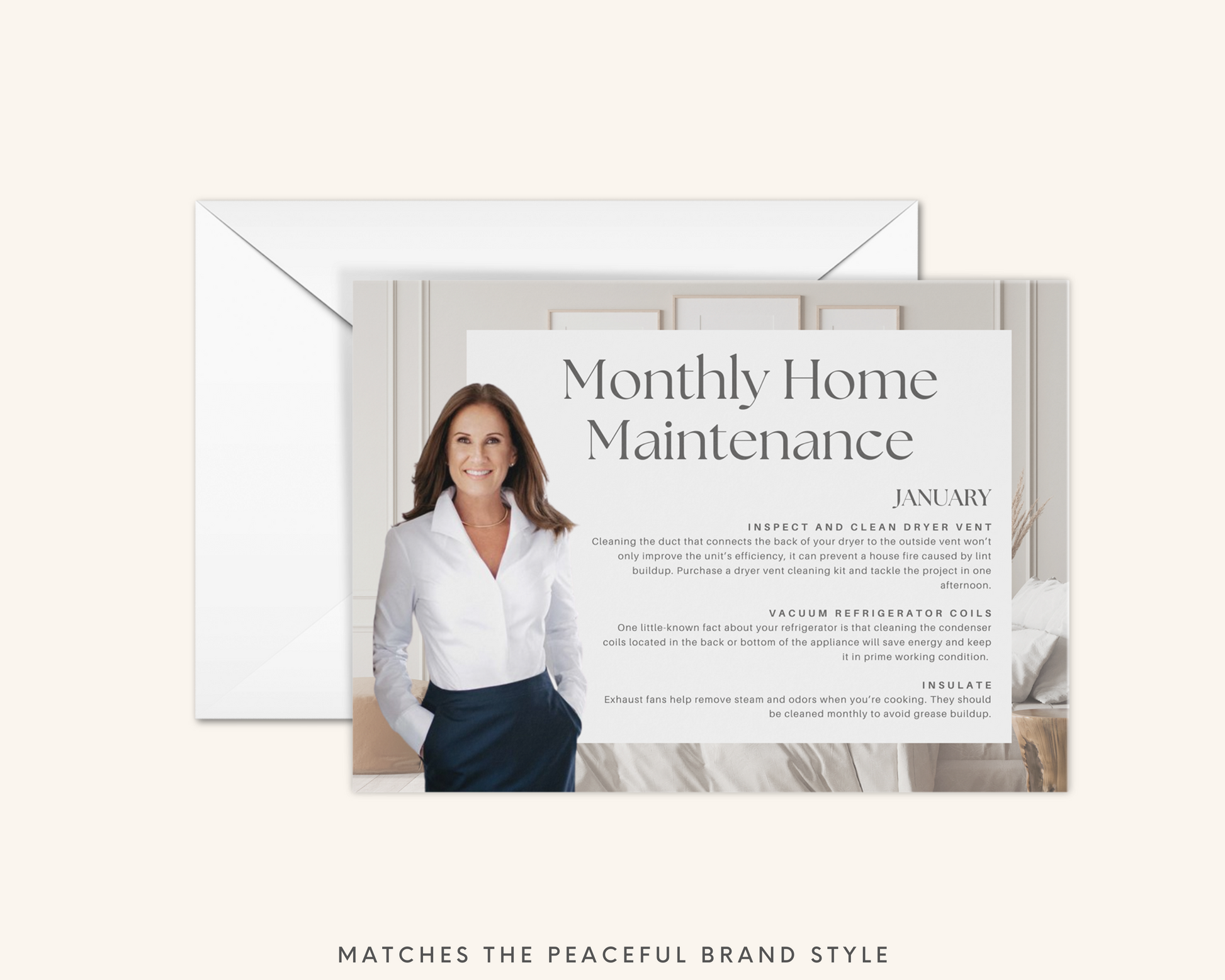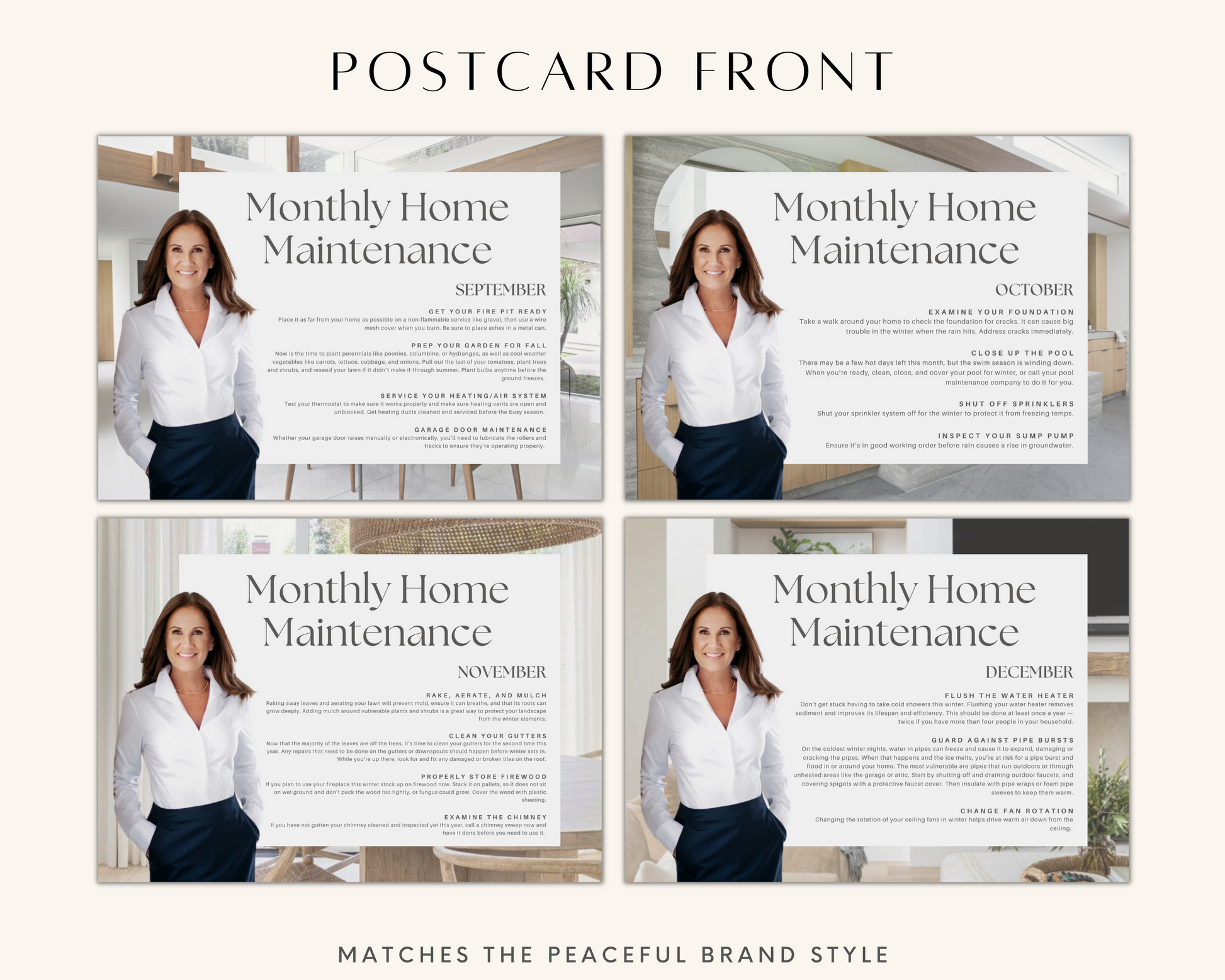 Elevate your Real Estate Marketing with these monthly Home Maintenance Postcards from the Peaceful Brand collection today.