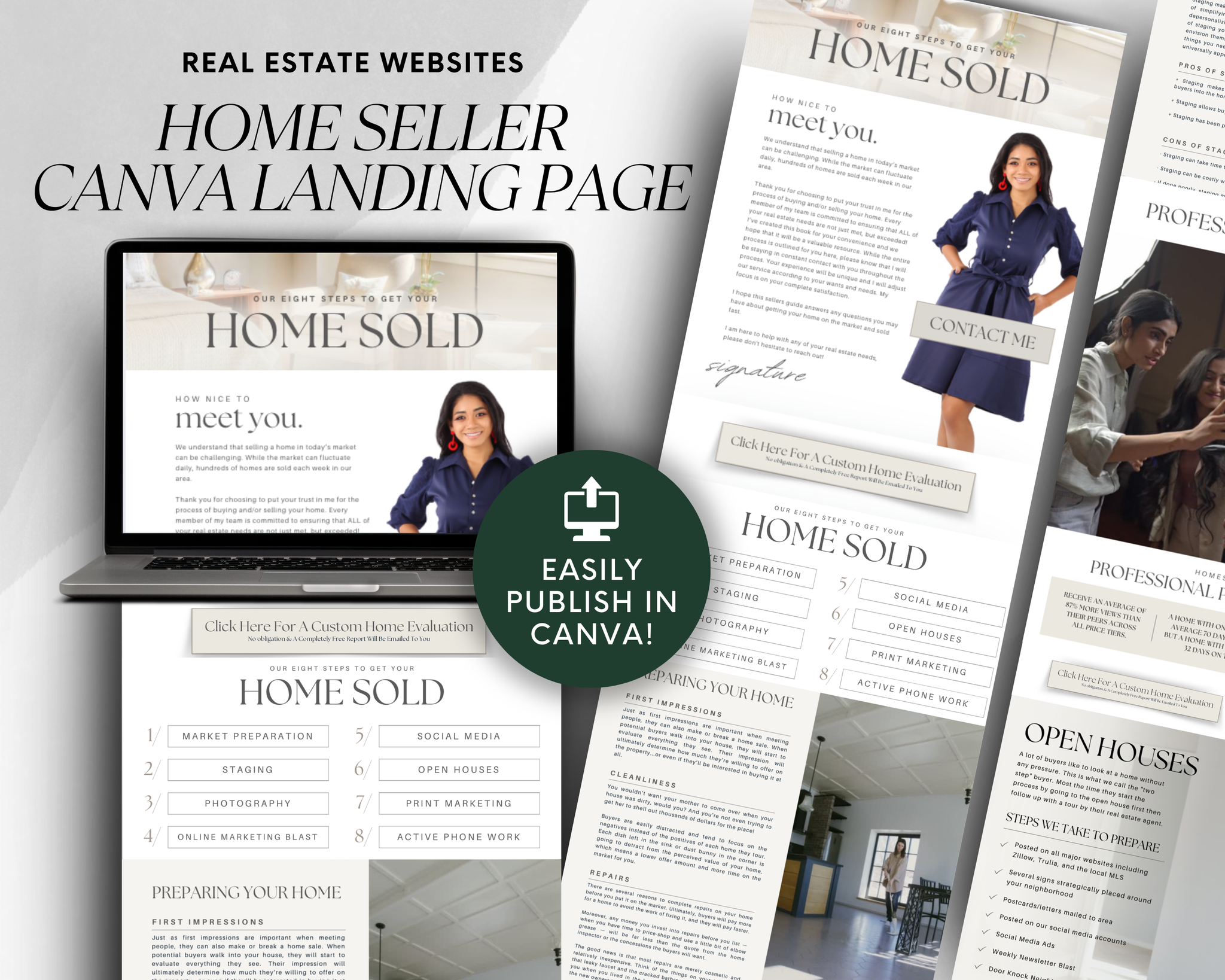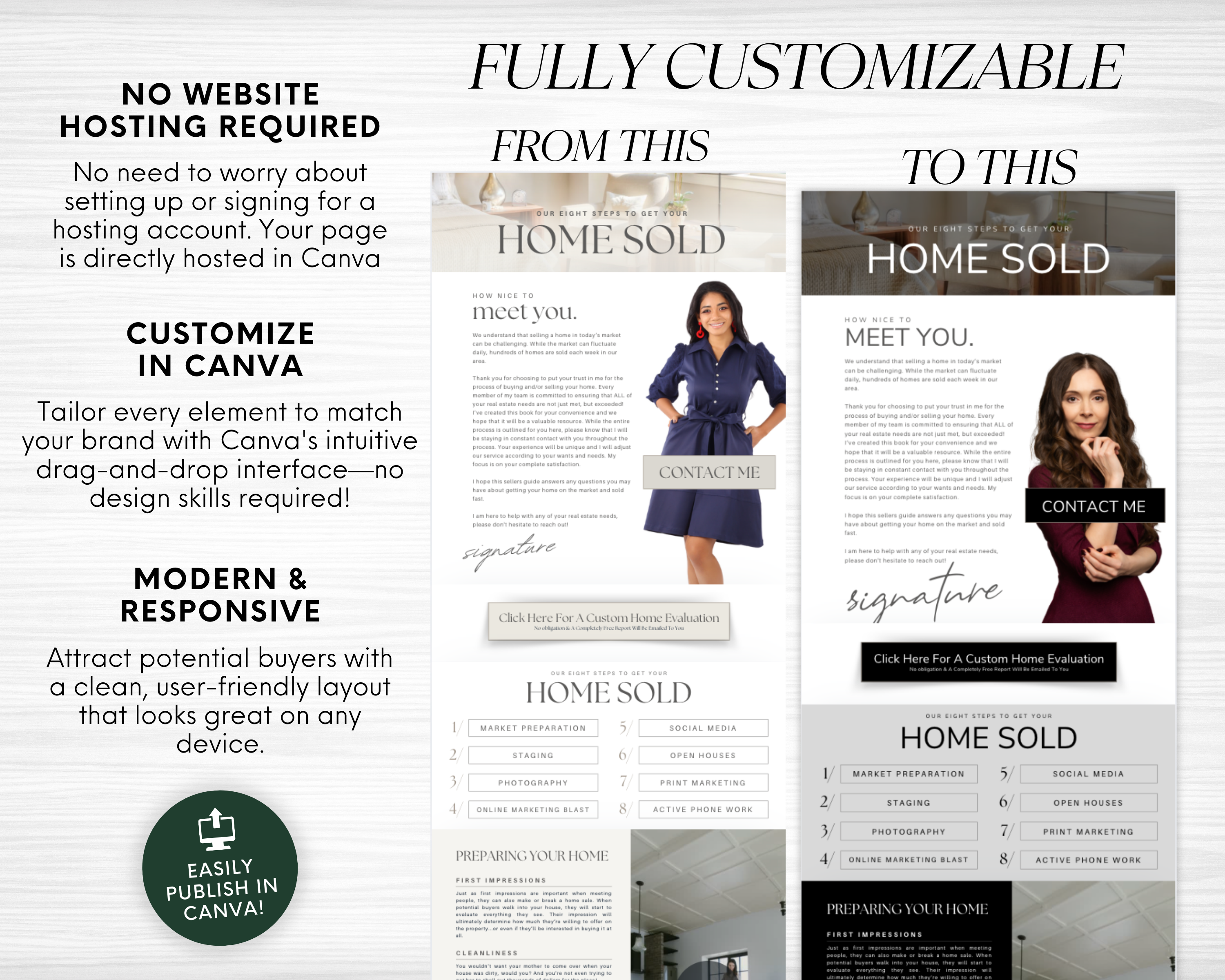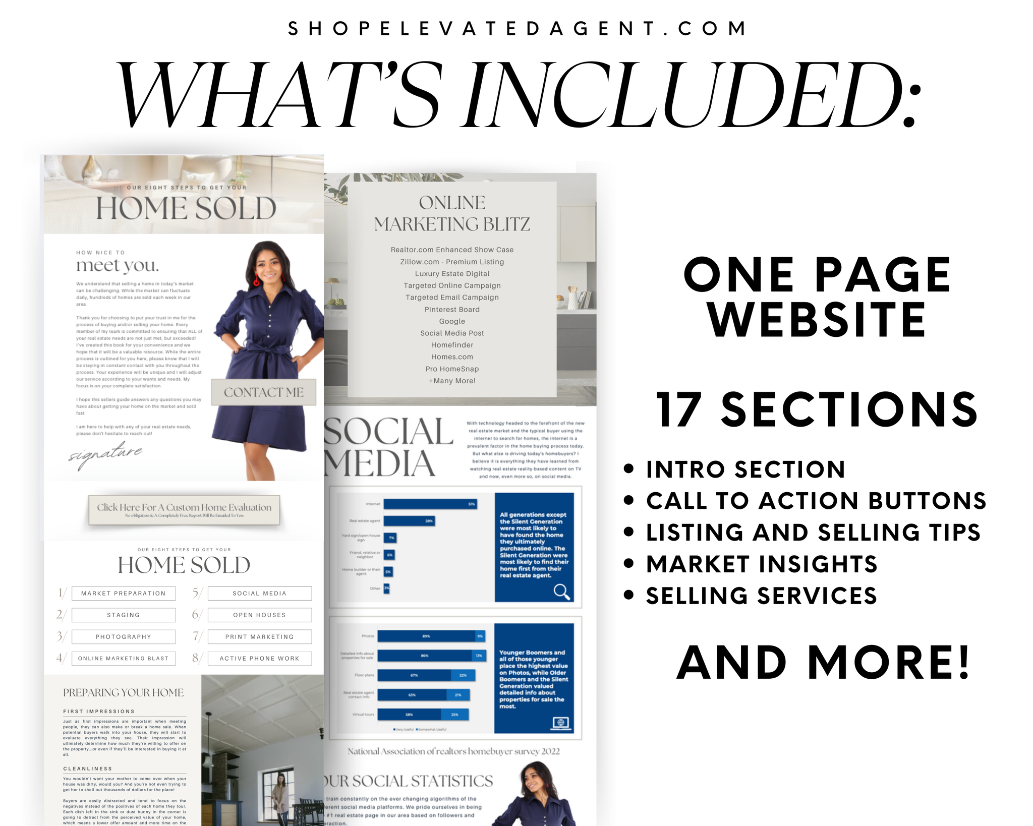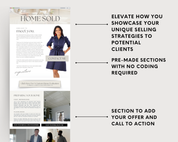 - Seller-Focused Content: Sections to outline your services, share your marketing strategy, explain the home-selling process, and display client success stories.