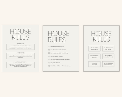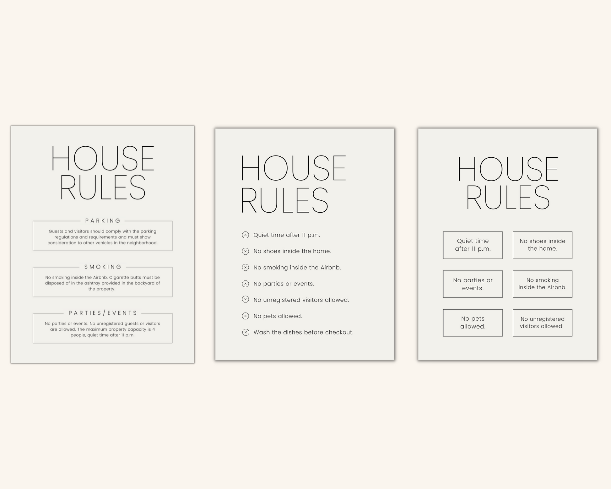 Attention professional Airbnb or VRBO hosts! Use this Real Estate Template – House Rules Airbnb Sign 6 to provide your guest with clear communication about the house rules during their stay. Customize your sign with your own rules and enjoy a smooth and stress-free hosting experience with happy guests who are aware of your expectations.