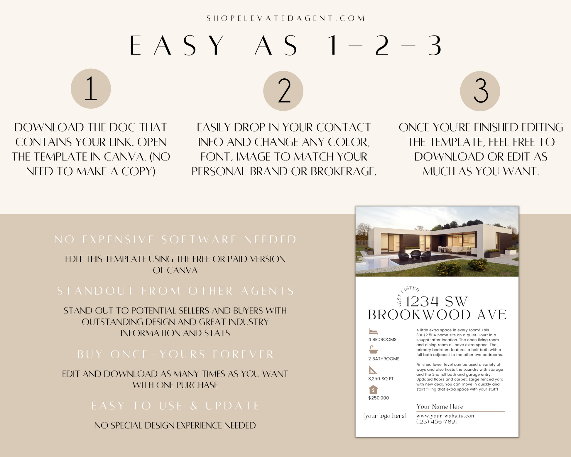 Attention Real Estate Agents! Keep your real estate marketing fresh and updated with this easy-to-use Realtor Canva Template designed by Elevated Agent. We stay on top of real estate marketing trends and produce new content daily.