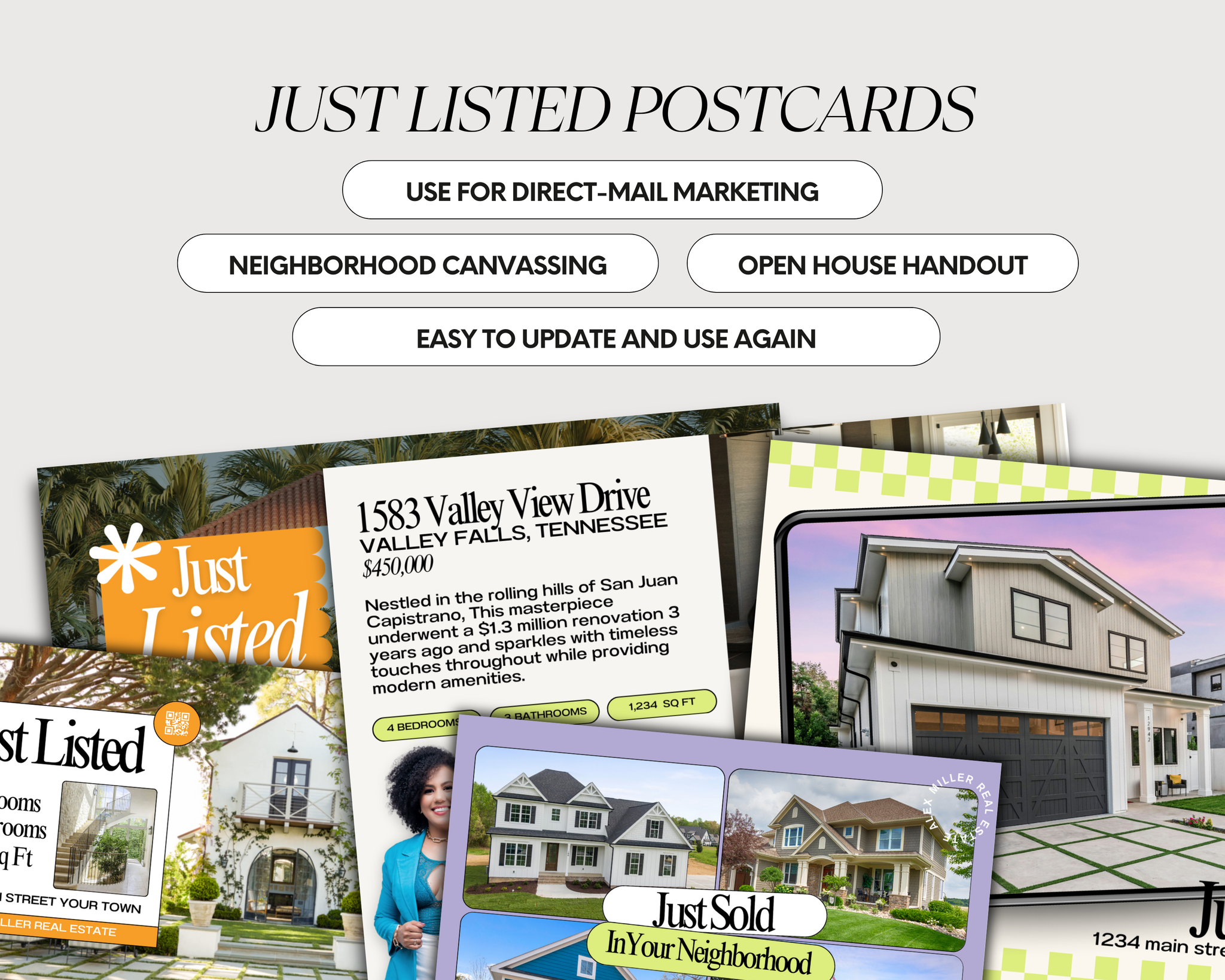 This postcard bundle for real estate is perfect for promoting new property listings, showcasing features, and elevating your brand presence in your farm area. Each layout is crafted to grab attention, highlight key property details, and help you stand out from competing agents.
