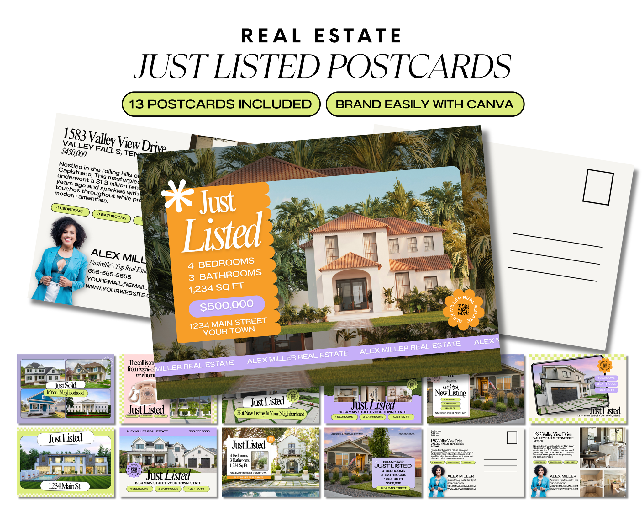 Boost your real estate marketing with this professionally designed Just Listed Real Estate Postcard Bundle. Created for modern agents who want clean, polished realtor marketing, this set includes 13 fully editable real estate postcards you can customize in minutes.
