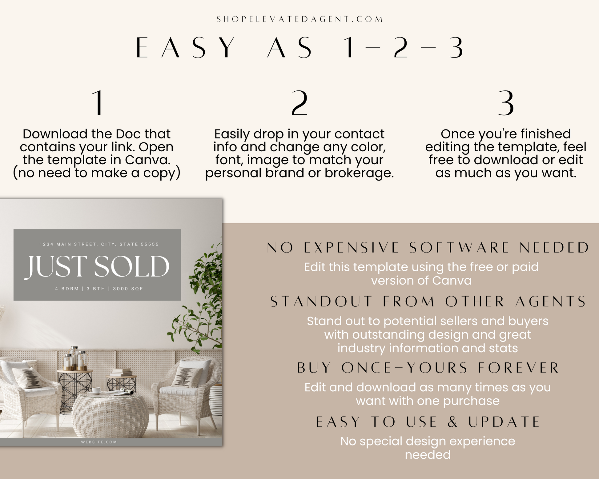 Attention Real Estate Agents! Keep your real estate marketing fresh and updated with this easy-to-use Realtor Canva Template designed by Elevated Agent. We stay on top of real estate marketing trends and produce new content daily.