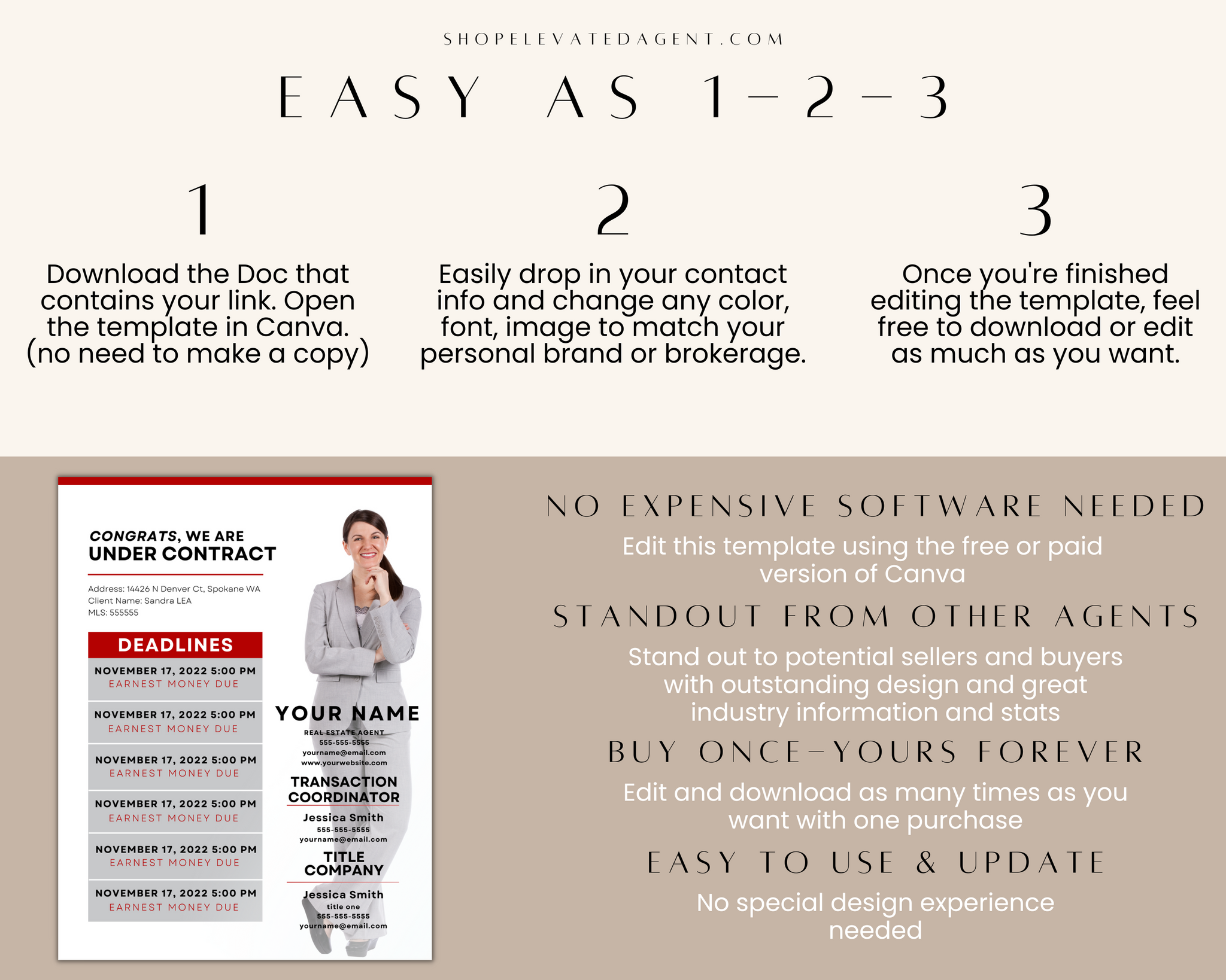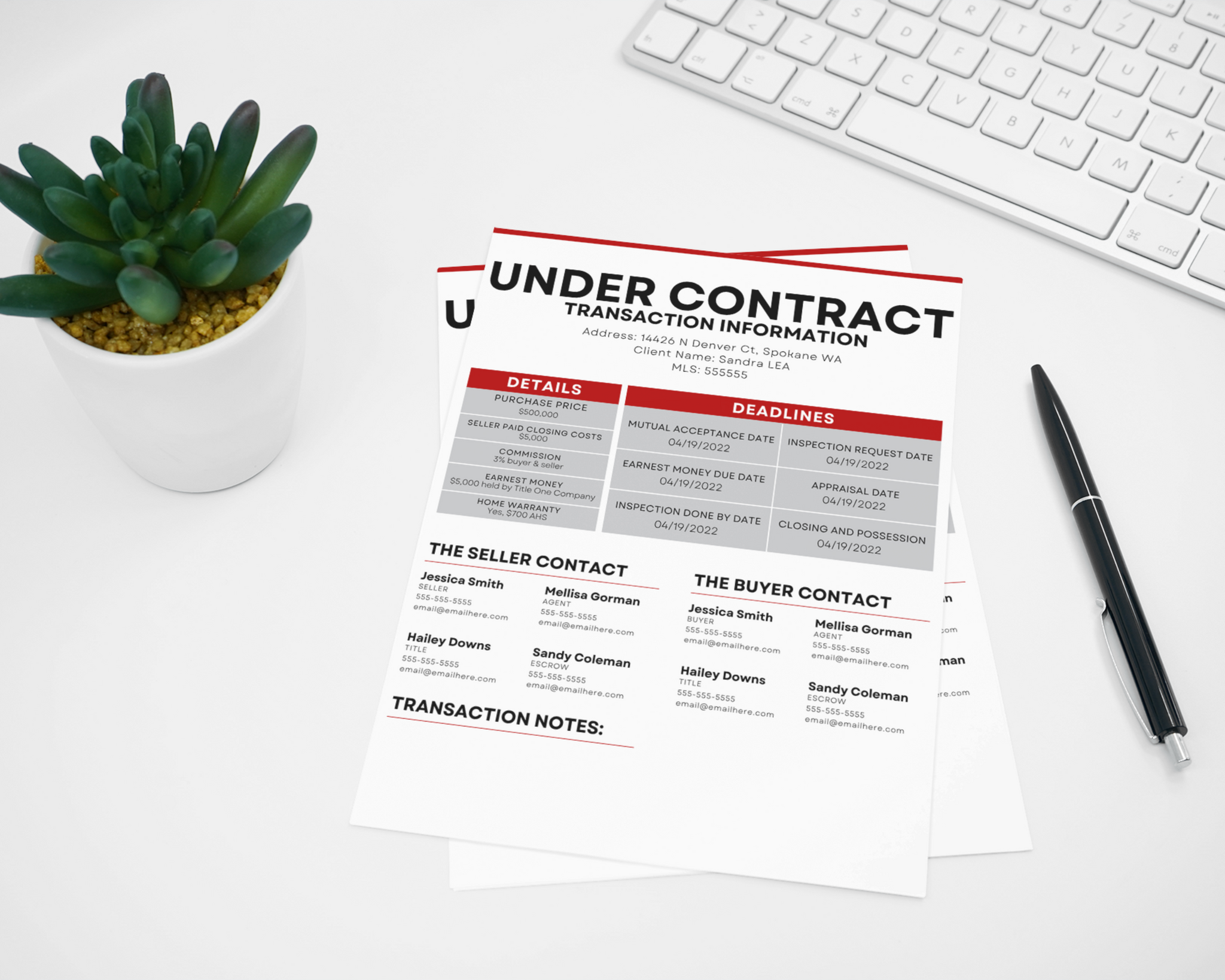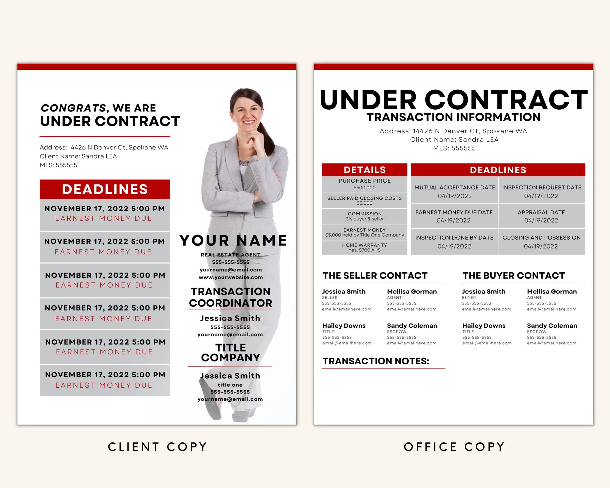 This Keller Williams Transaction Summary Flyer Real Estate Template is a checklist tool to help your client meet deadlines to ensure the property closes on time. The Keller Williams Transaction Summary Flyer also includes contact information for your client in case they have any questions.