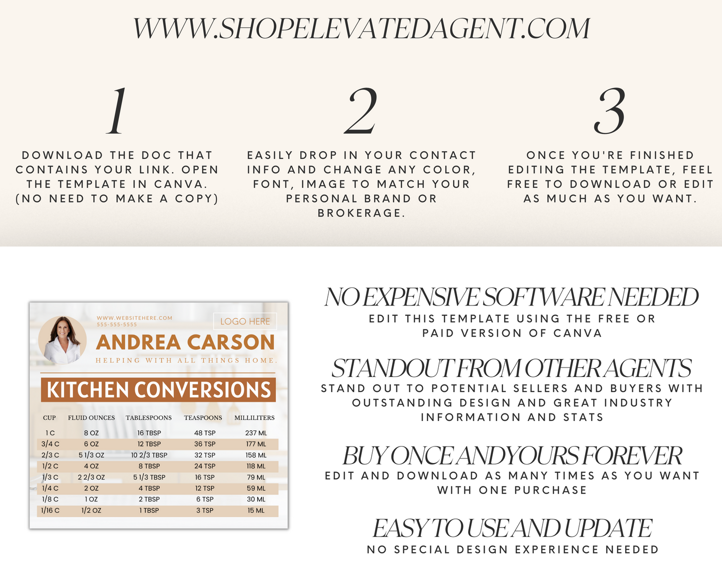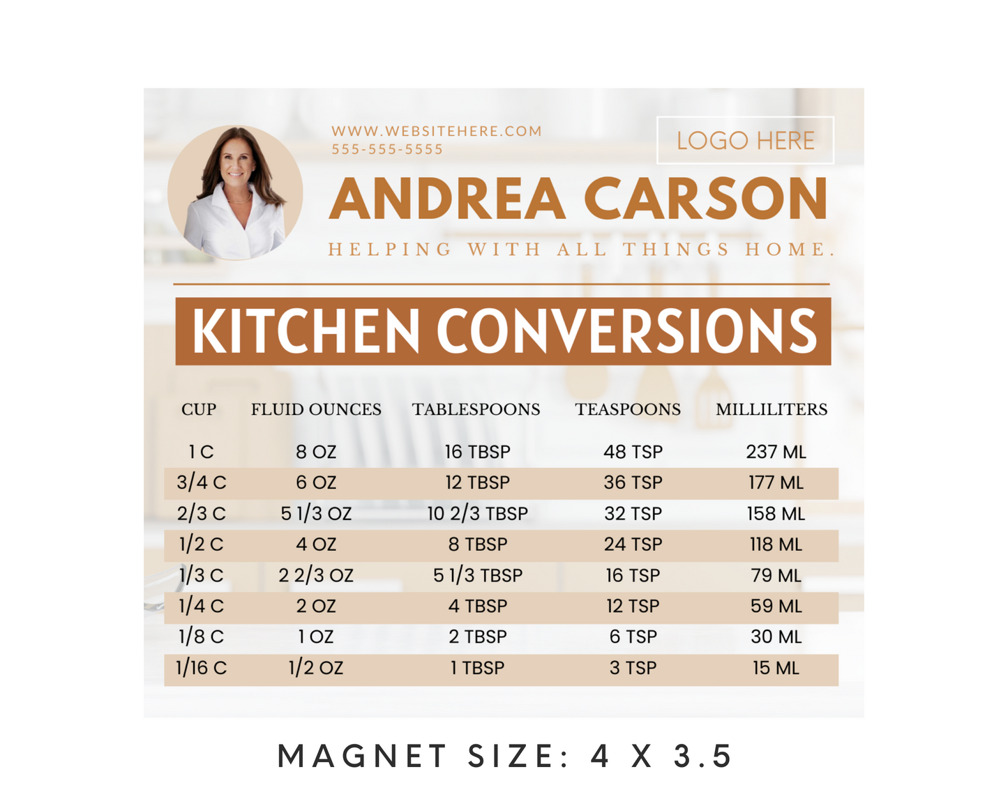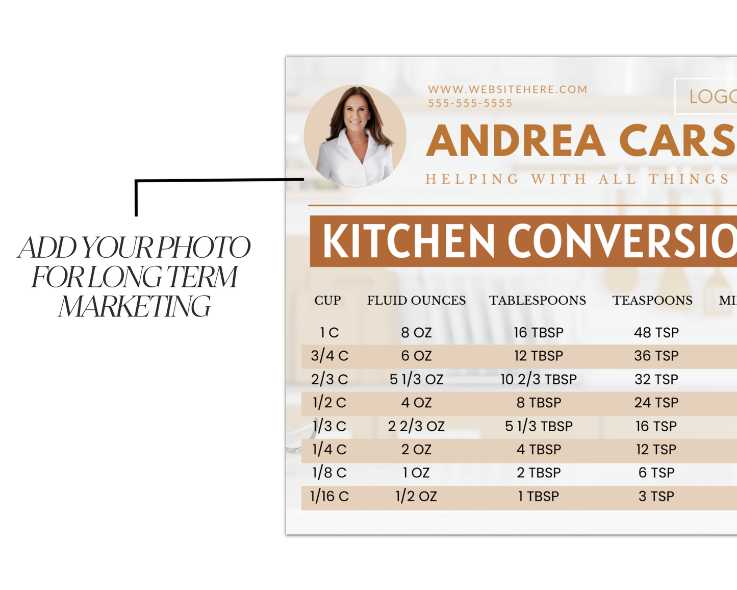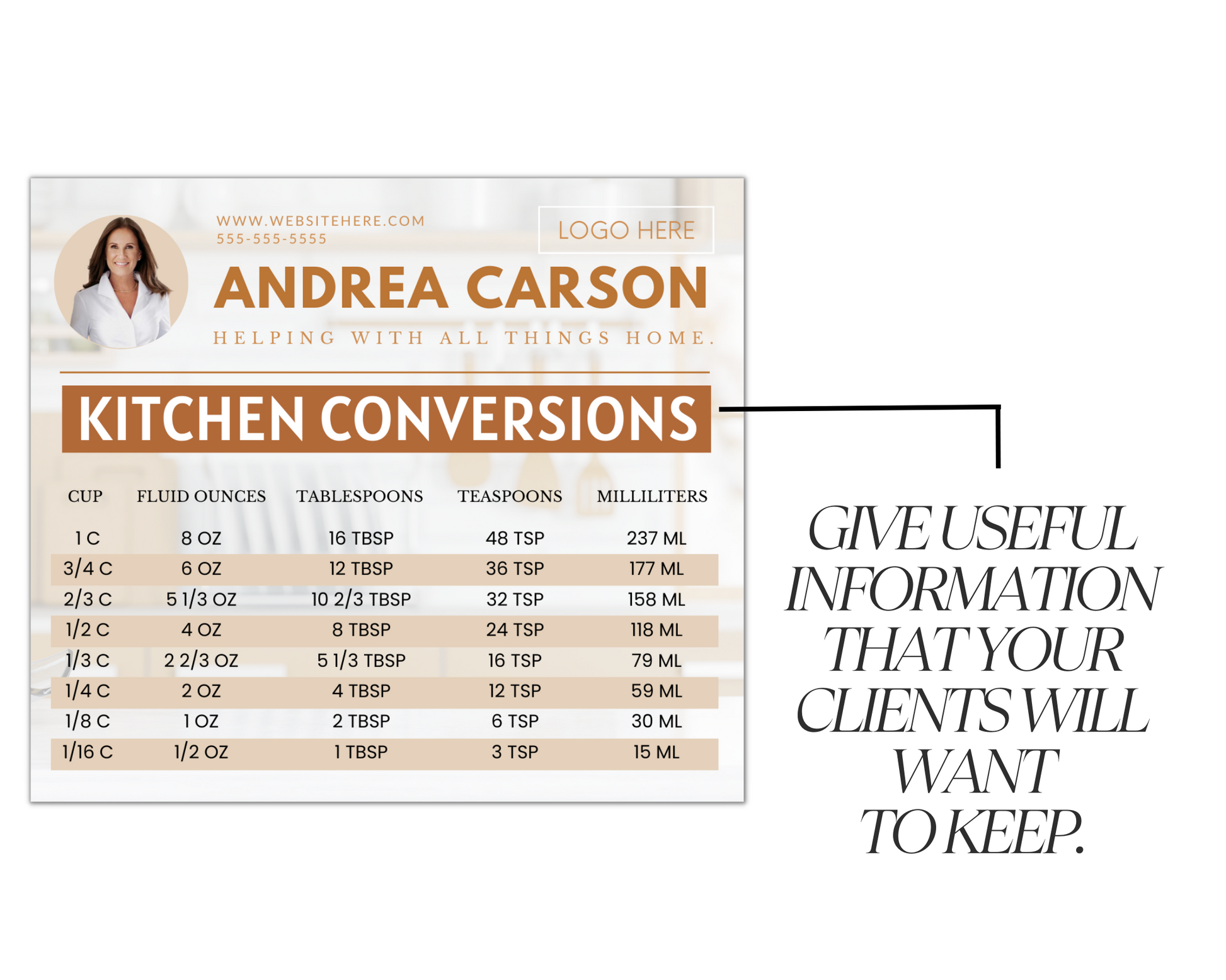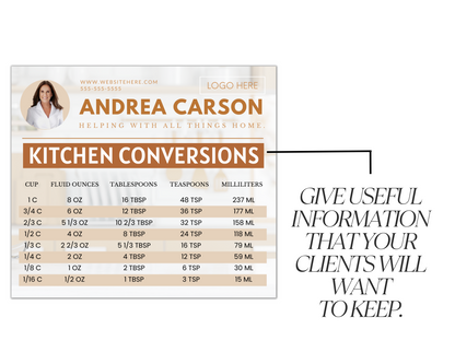 This Real Estate Template – Promo Magnet with Kitchen Conversions 4 can be ordered from a local printer to be mailed or handed out at in-person events and open houses. You can also email the digital file to your farm.