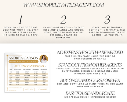 Attention Real Estate Agents! Use this Real Estate Template – Promo Magnet with Kitchen Conversions 5 as an easy and effective way to promote your real estate business. Look no further than our promotional magnet Canva template! With customizable designs and your own personal touch, these magnets make the perfect giveaway for home sellers and home buyers, past clients, and potential leads. Whether you want to showcase your realtor stats or feature your real estate branding, our template makes it simple to create a magnet that leaves a lasting impression. Plus, with its durable material and long-lasting effects, your clients will be sure to remember you every time they open their fridge. So, what are you waiting for? Start customizing your promotional magnet today and watch your business grow!