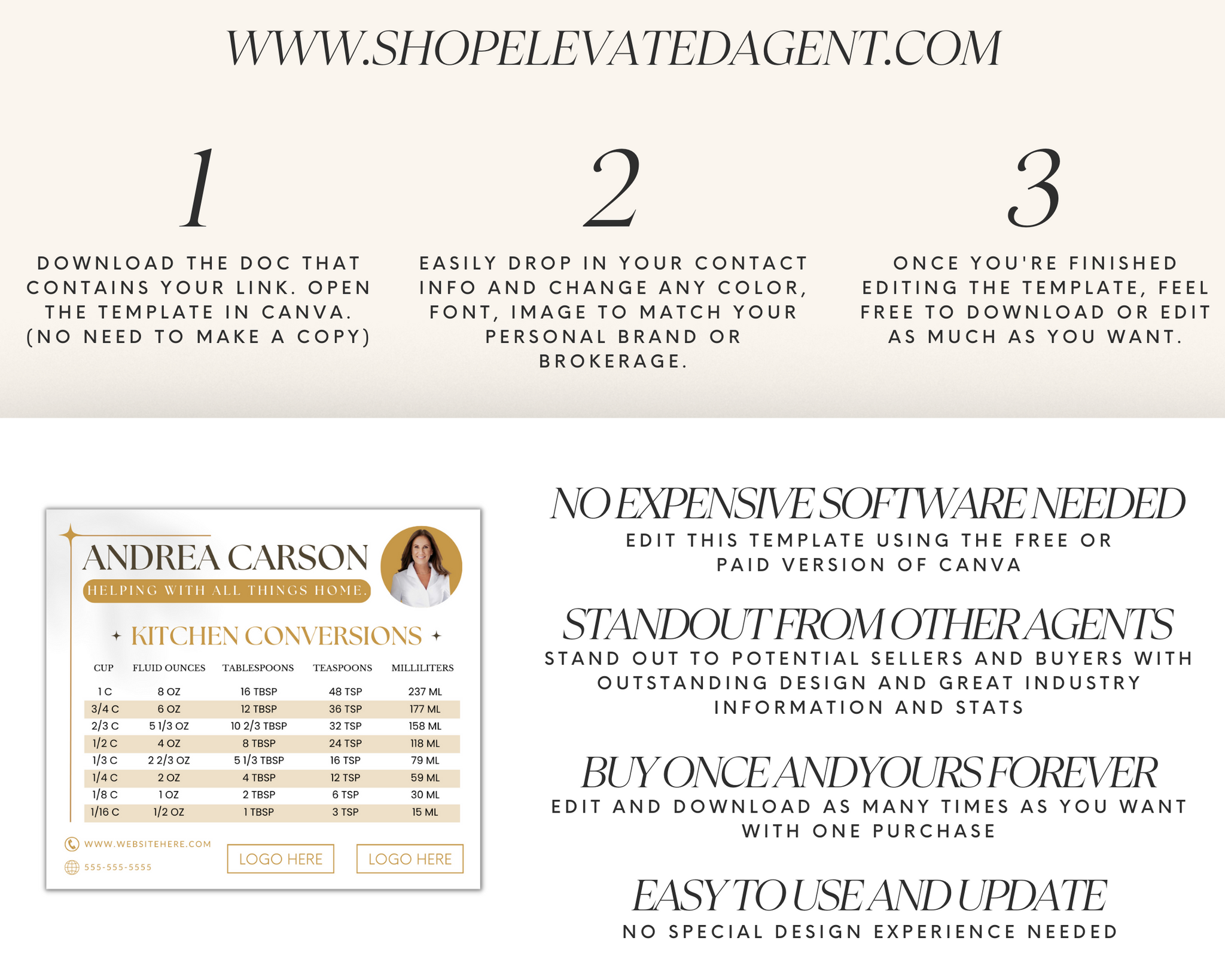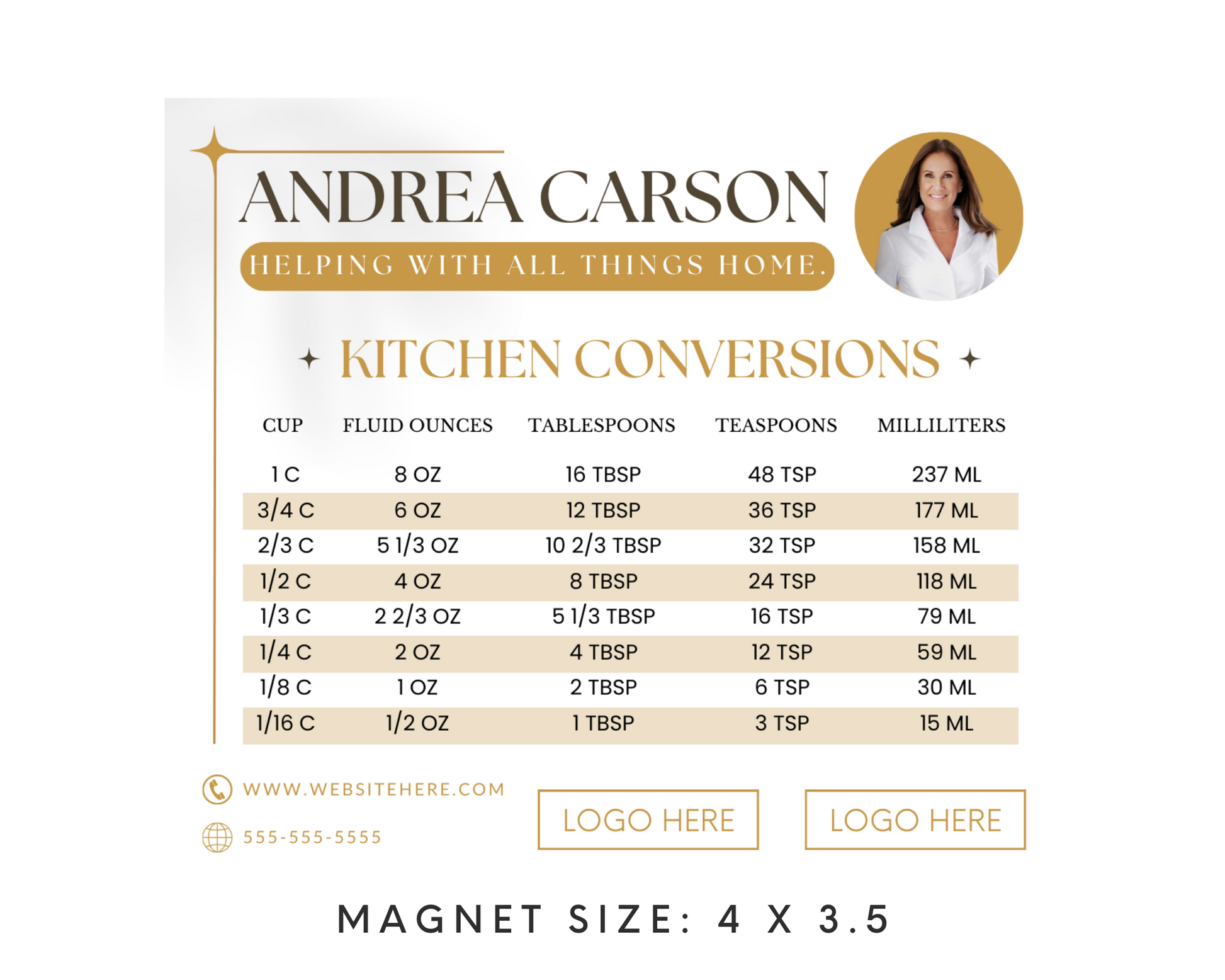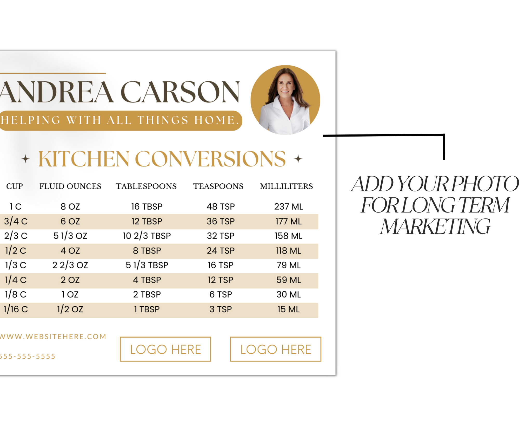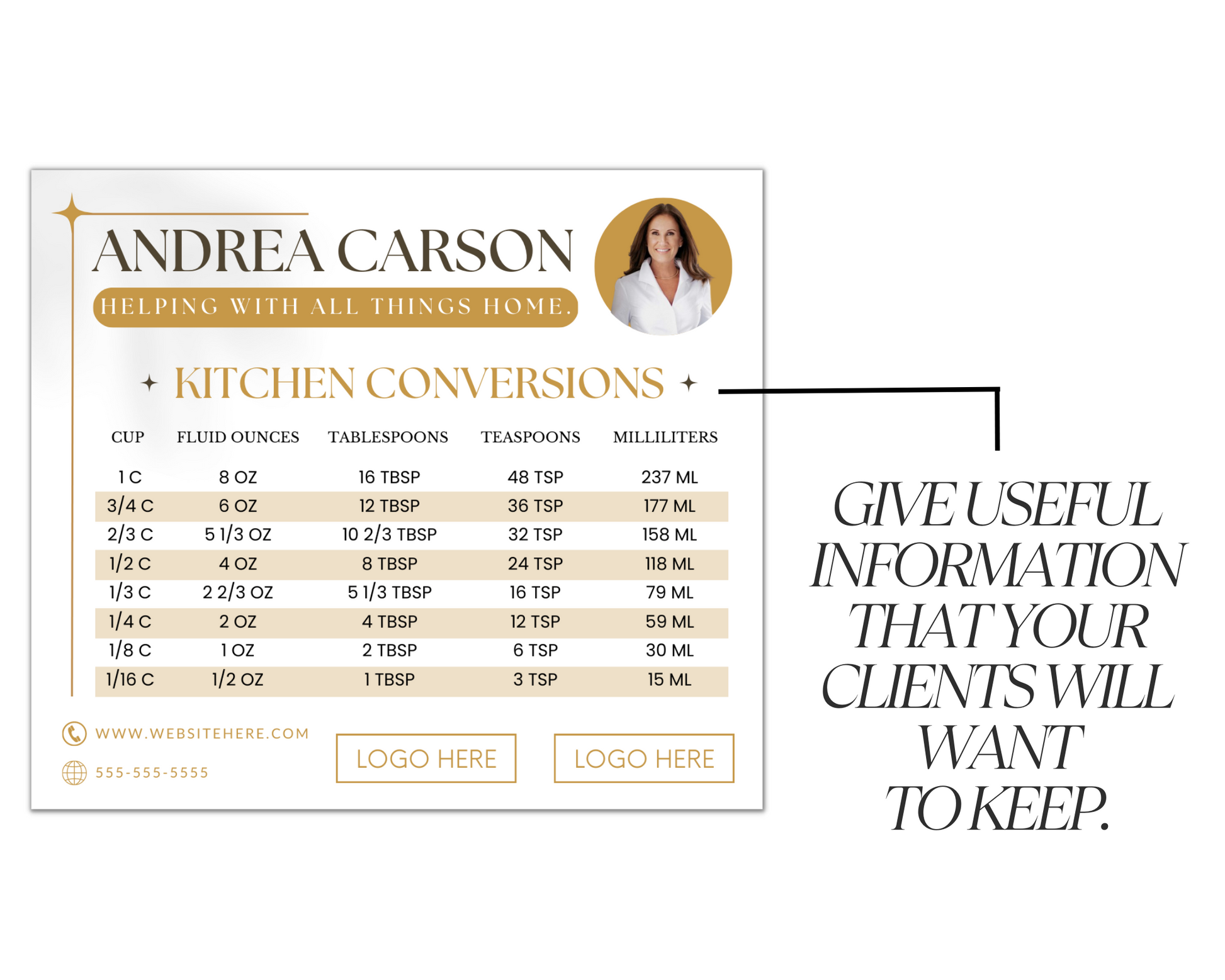 This Real Estate Template – Promo Magnet with Kitchen Conversions 5 can be ordered from a local printer to be mailed or handed out at in-person events and open houses. You can also email the digital file to your farm.