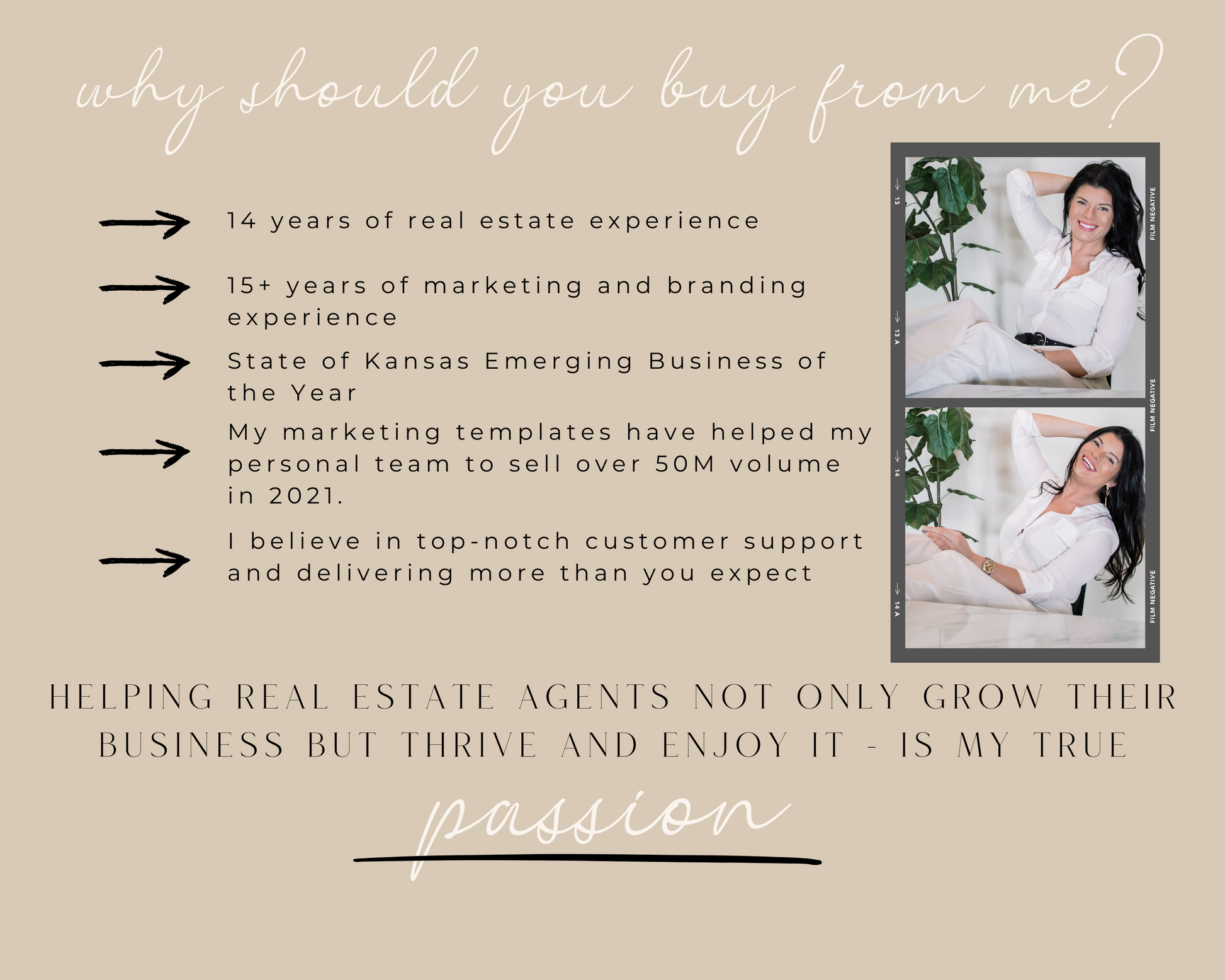 Using my 15+ years experience as a Marketing Manager AND real estate agent coupled with my passion (and talent!) for branding, my mission is to help and support as many real estate agents as possible in building and growing their brands and businesses.
