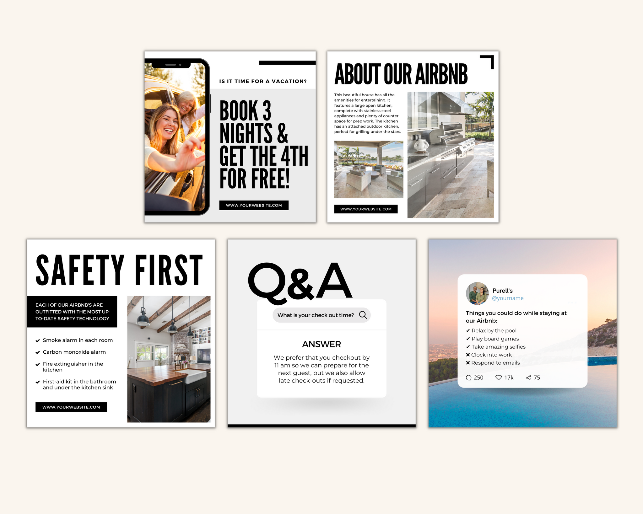 Attention Real Estate Agents! Use this Real Estate Template – Minimal Airbnb Social Media Posts 3 to promote an Airbnb short term rental property on social media. Take the guesswork out of what to post every day and use these easy-to-edit templates to promote your property.