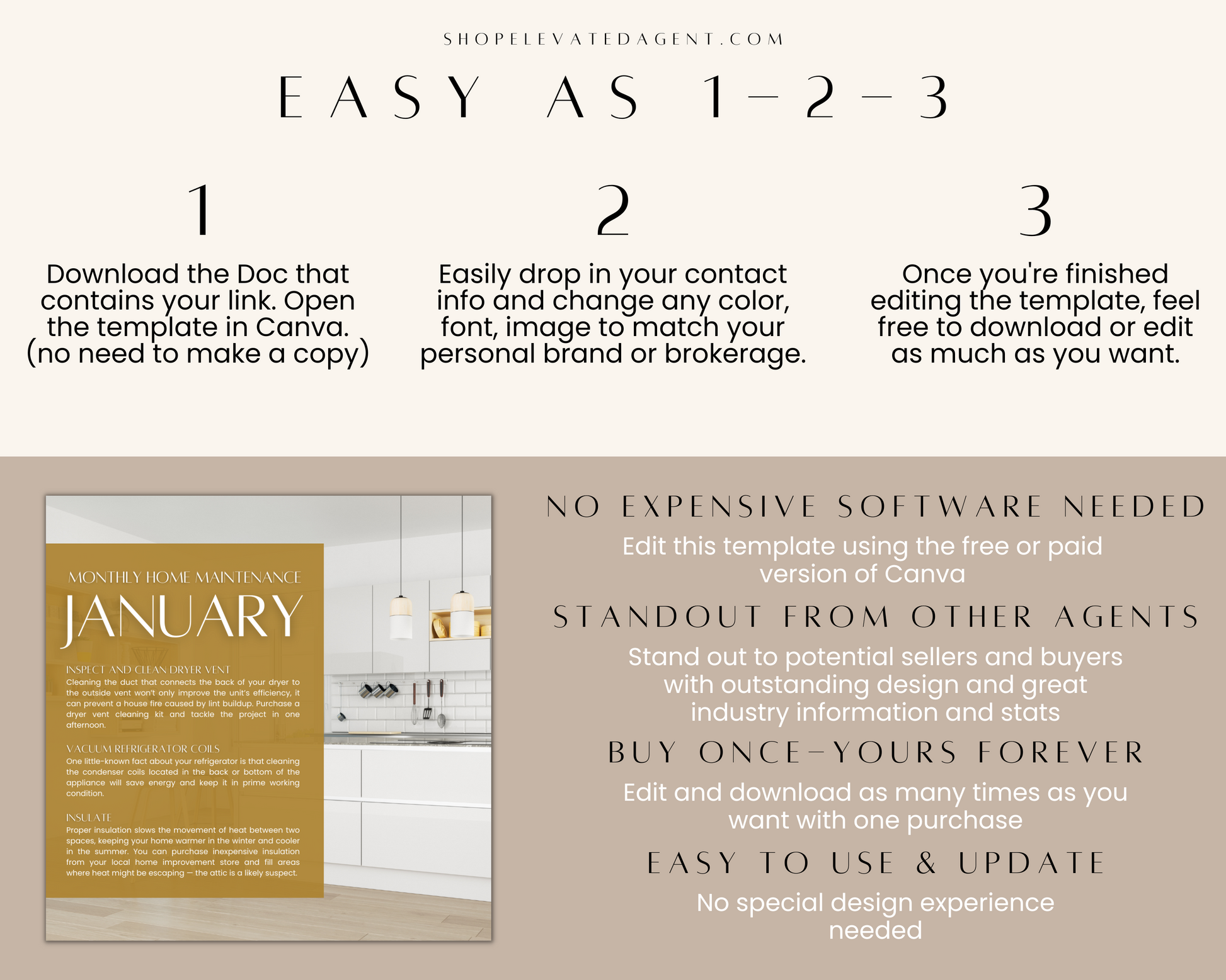 Attention Real Estate Agents! Keep your real estate marketing fresh and updated with this easy-to-use Realtor Canva Template designed by Elevated Agent. We stay on top of real estate marketing trends and produce new content daily.