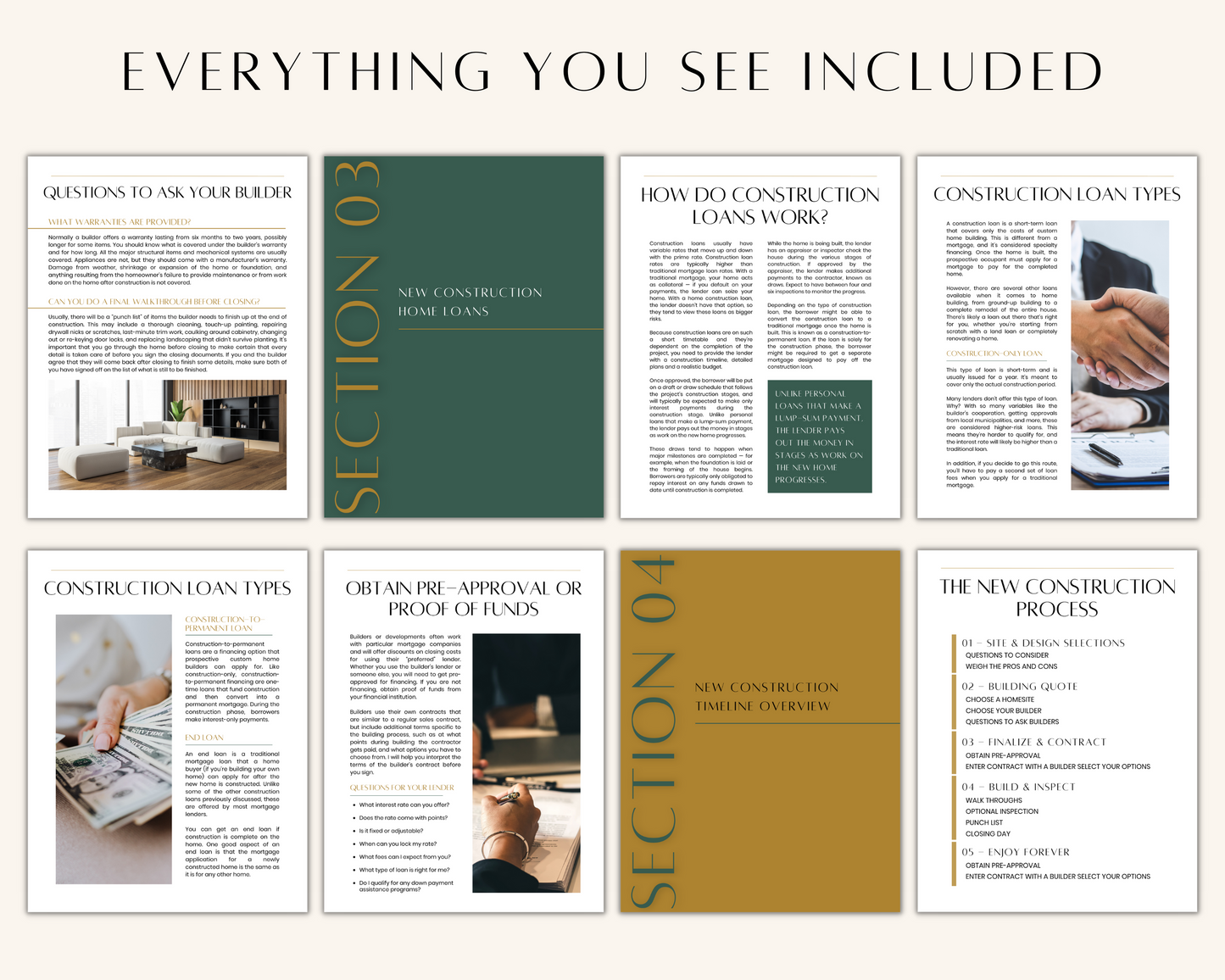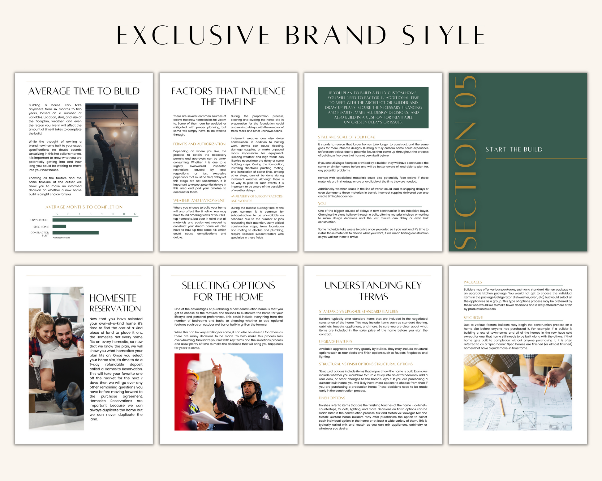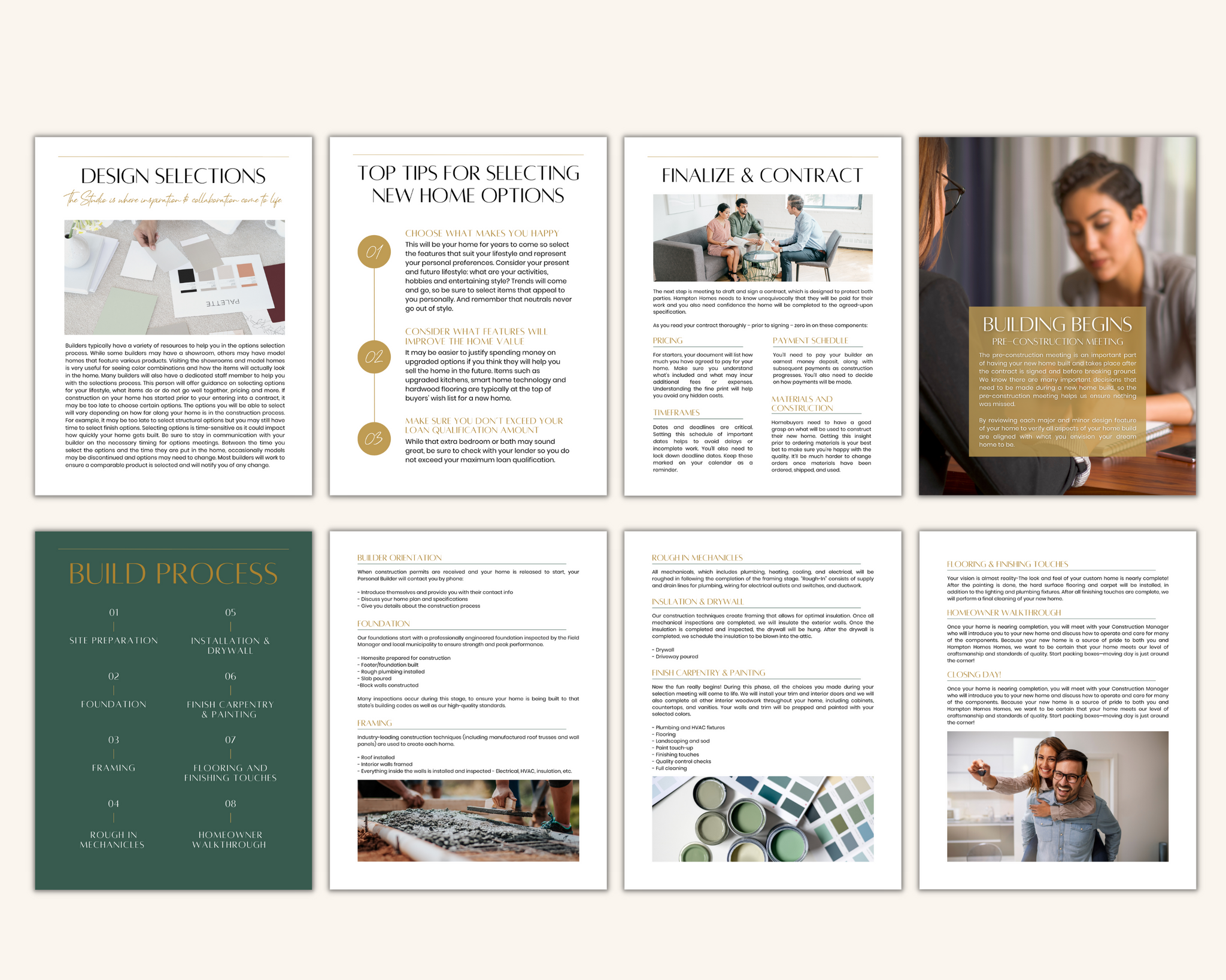 Real Estate Agents: never have a client that is confused about the home building process ever again! This real estate guide will that your buyers from the first step of building a new home to closing day. Take all the confusion out of the process and have beautiful real estate marketing pieces to brand yourself as well!